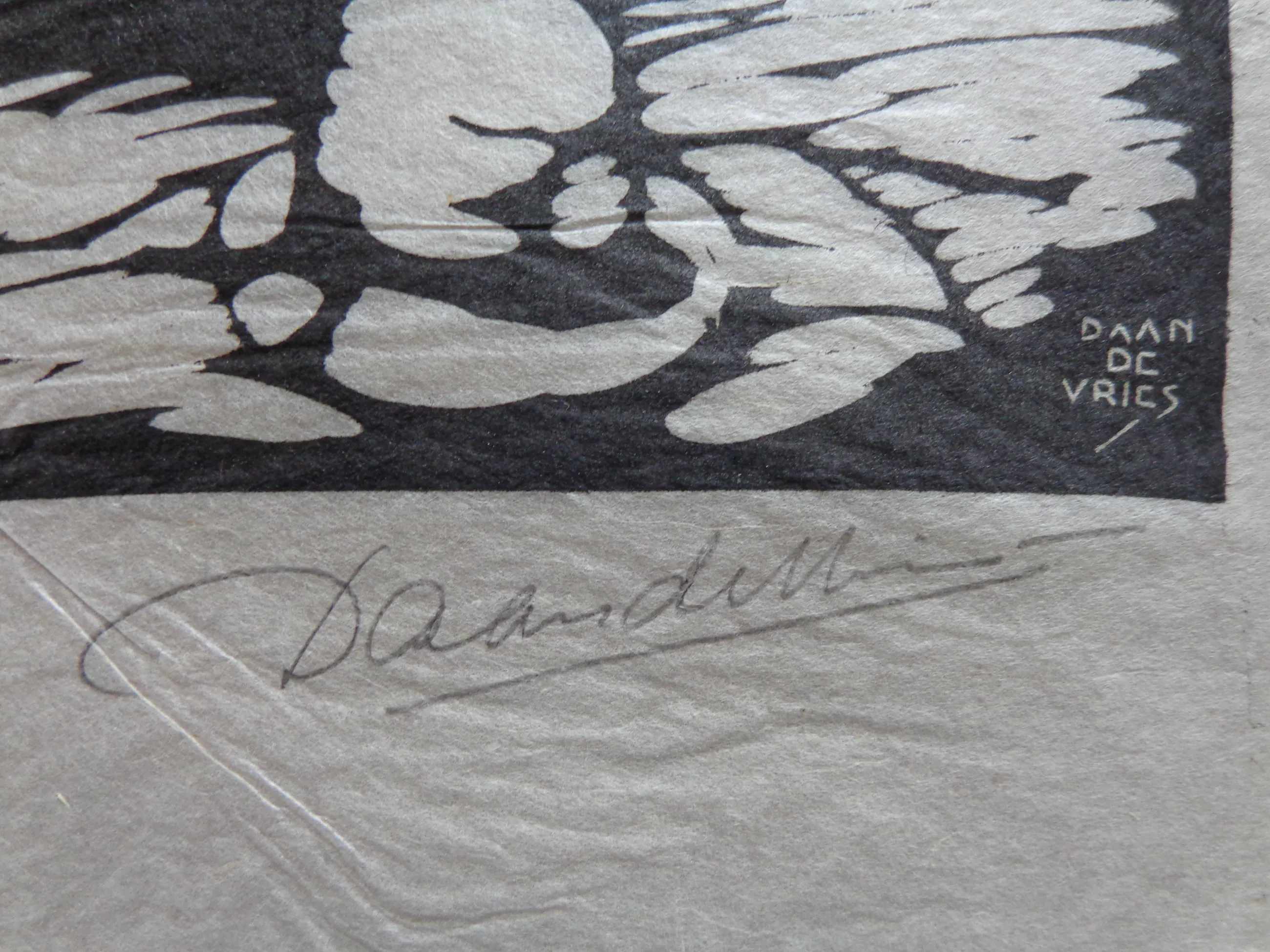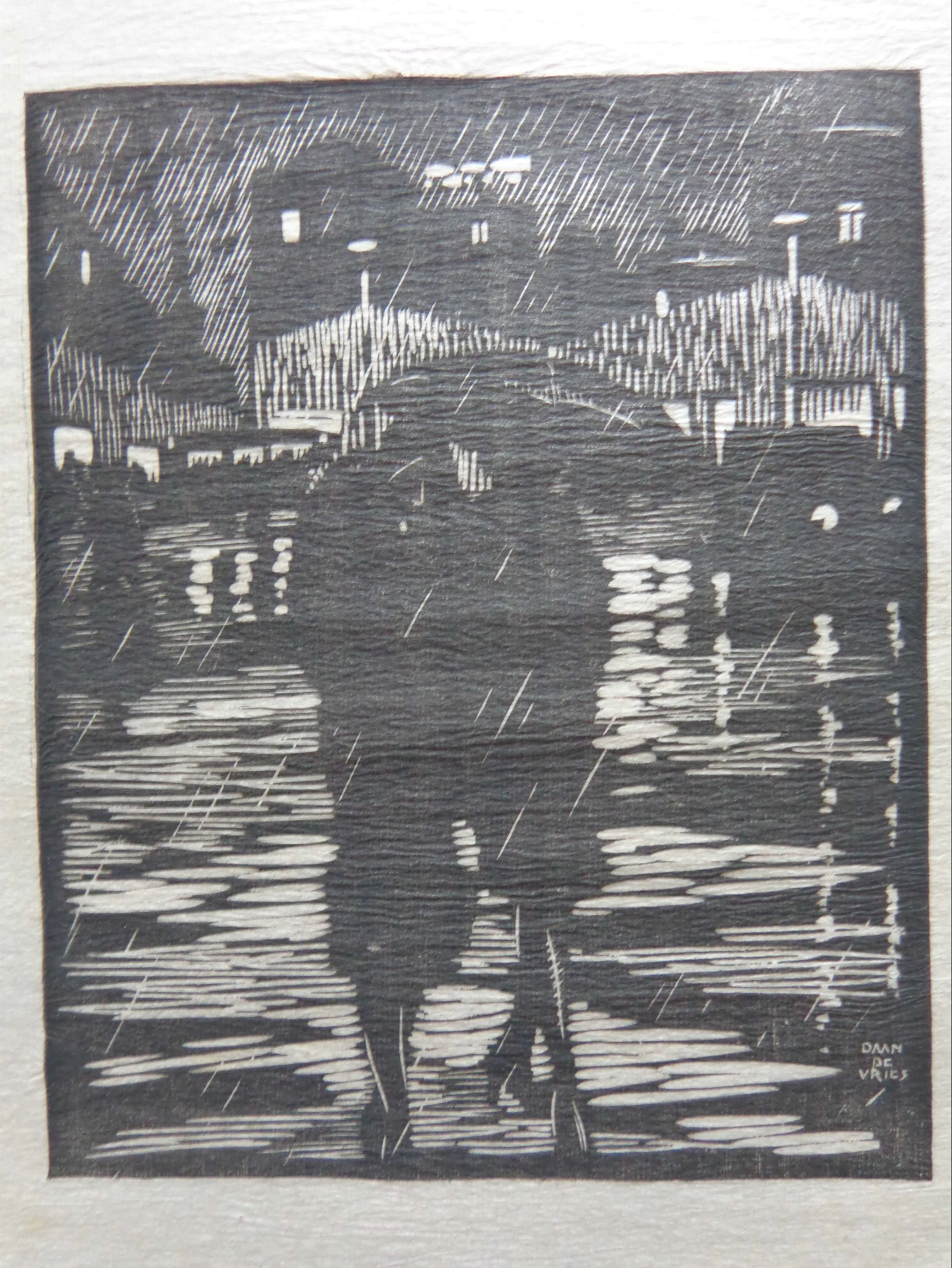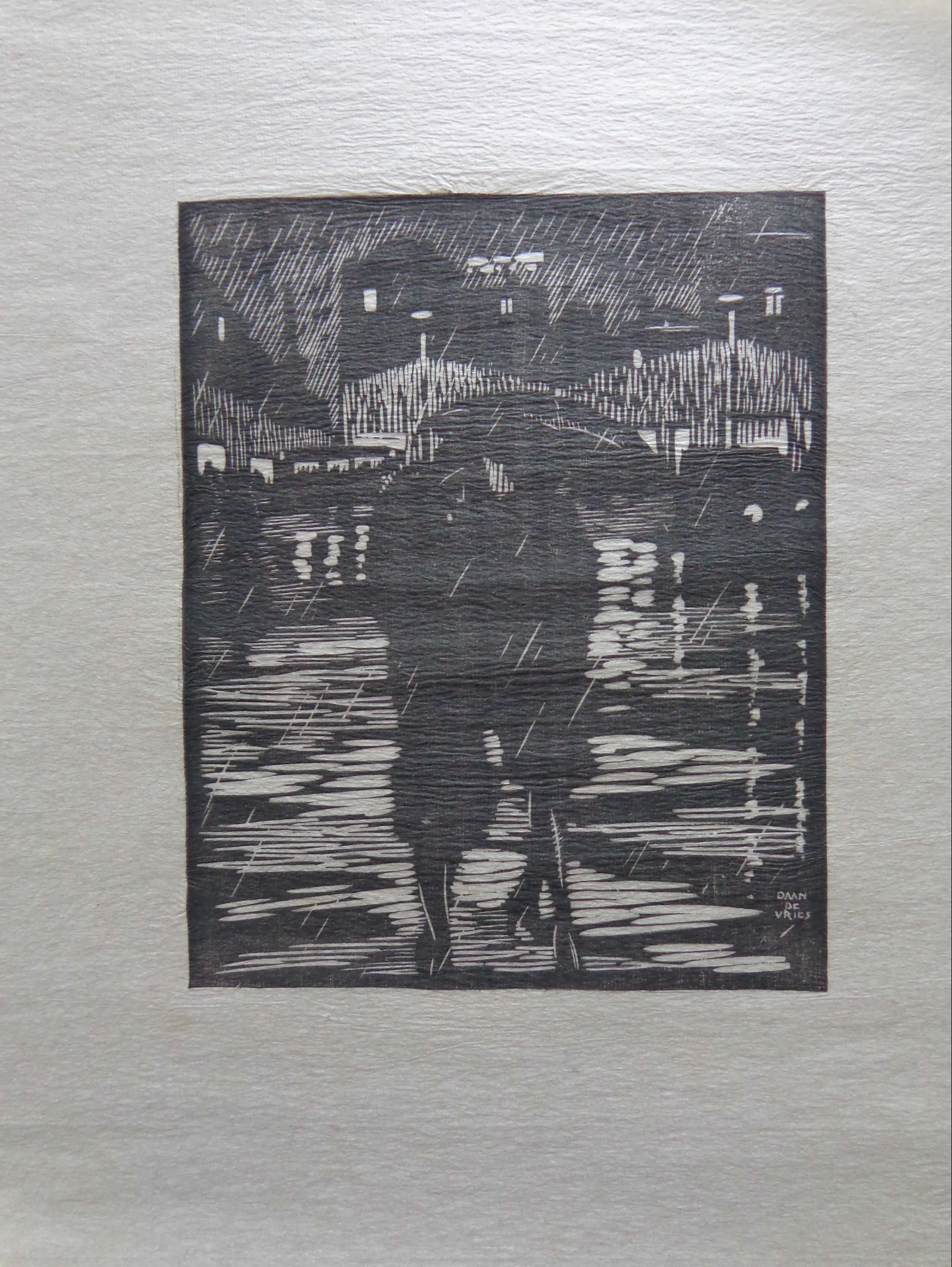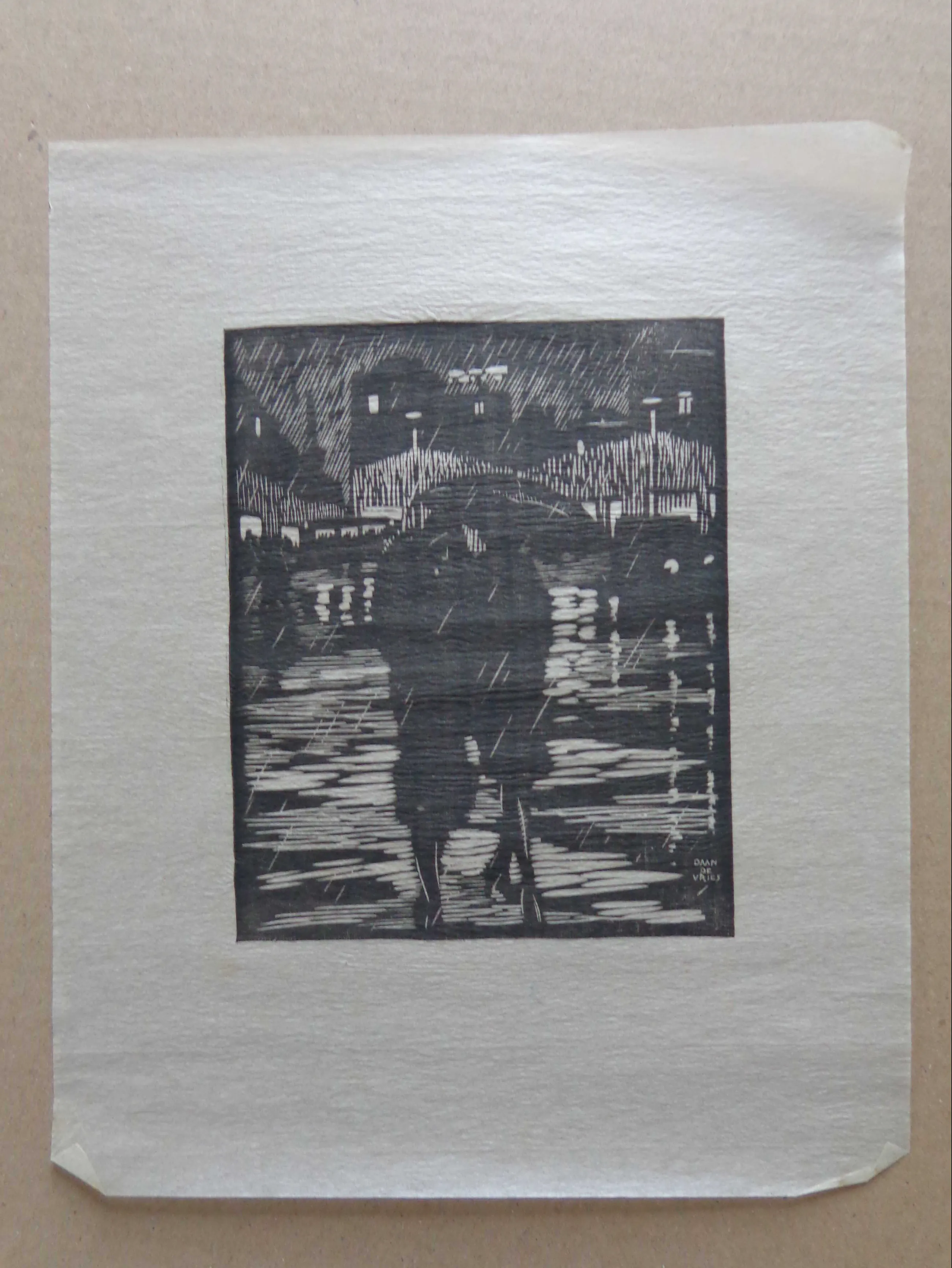 2. Wandelend koppel in de regen. Zwart-wit houtsnede op Chinees papier. Signatuur in de plaat. Geen nummering. Blad: 27x22cm. Proper blad.