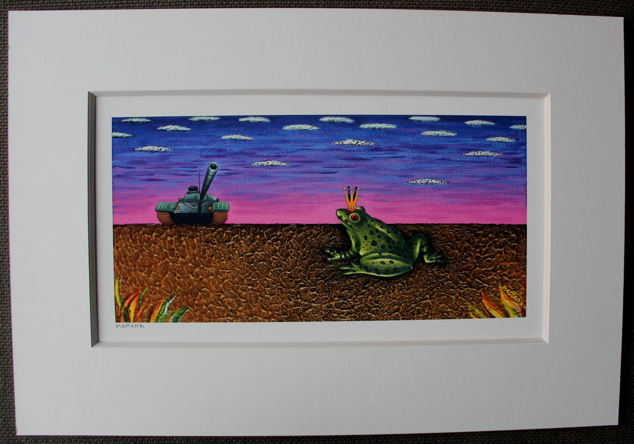 Zeefdruk van Dadara. Titel: Frog. Afmetingen incl passe-partout: H45 x b66cm. Afmetingen beeld: H22 x b44 cm. Het werk is links en rechtsonder gesigneerd door de kunstenaar. De authenticiteit van het aangeboden werk wordt volledig gegarandeerd. Een certificaat van echtheid kan, op aanvraag, worden gemaild.
