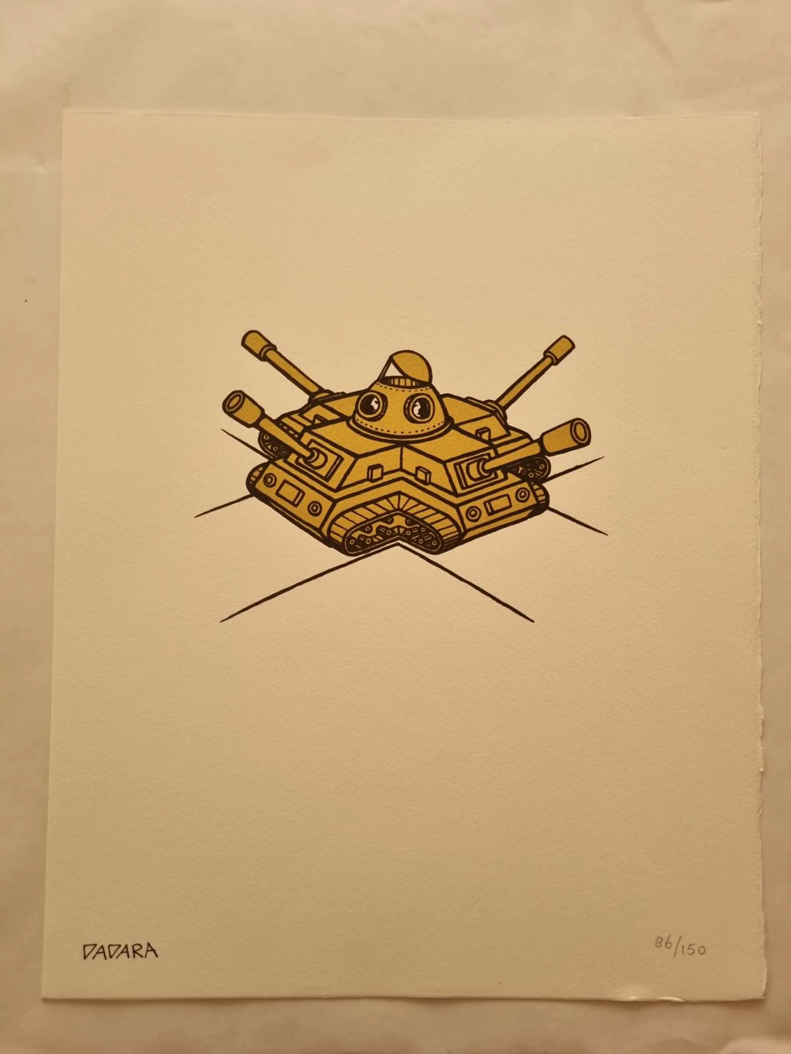 Zeefdruk van Dadara. Titel: Peace Tank. Oplage: 86/150. Het werk is links onder met zwarte stift gesigneerd door Dadara.