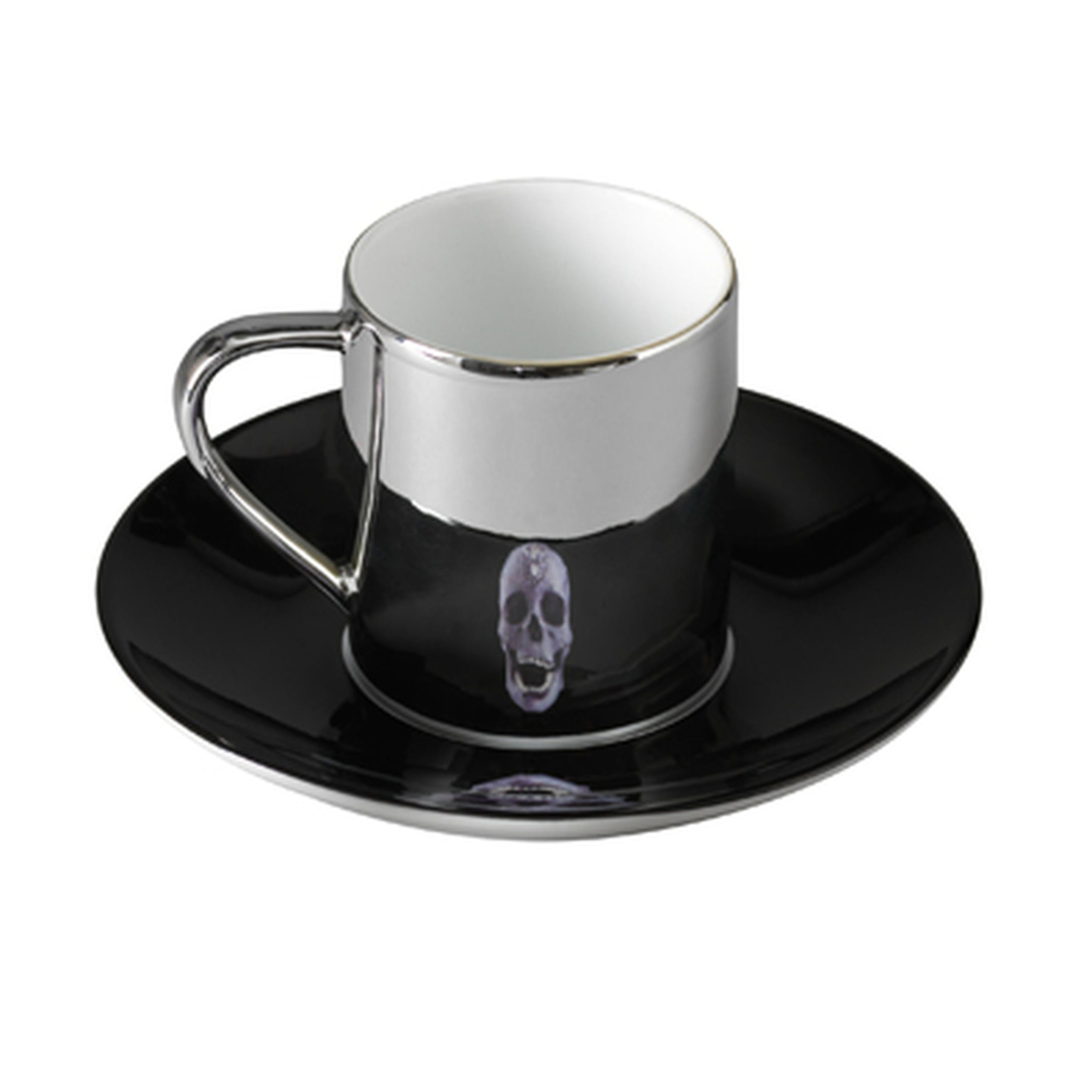 Door het anamorphe design reflecteert de afbeelding (een doodskop)van het schoteltje op het zilverkleurig porseleinen kopje