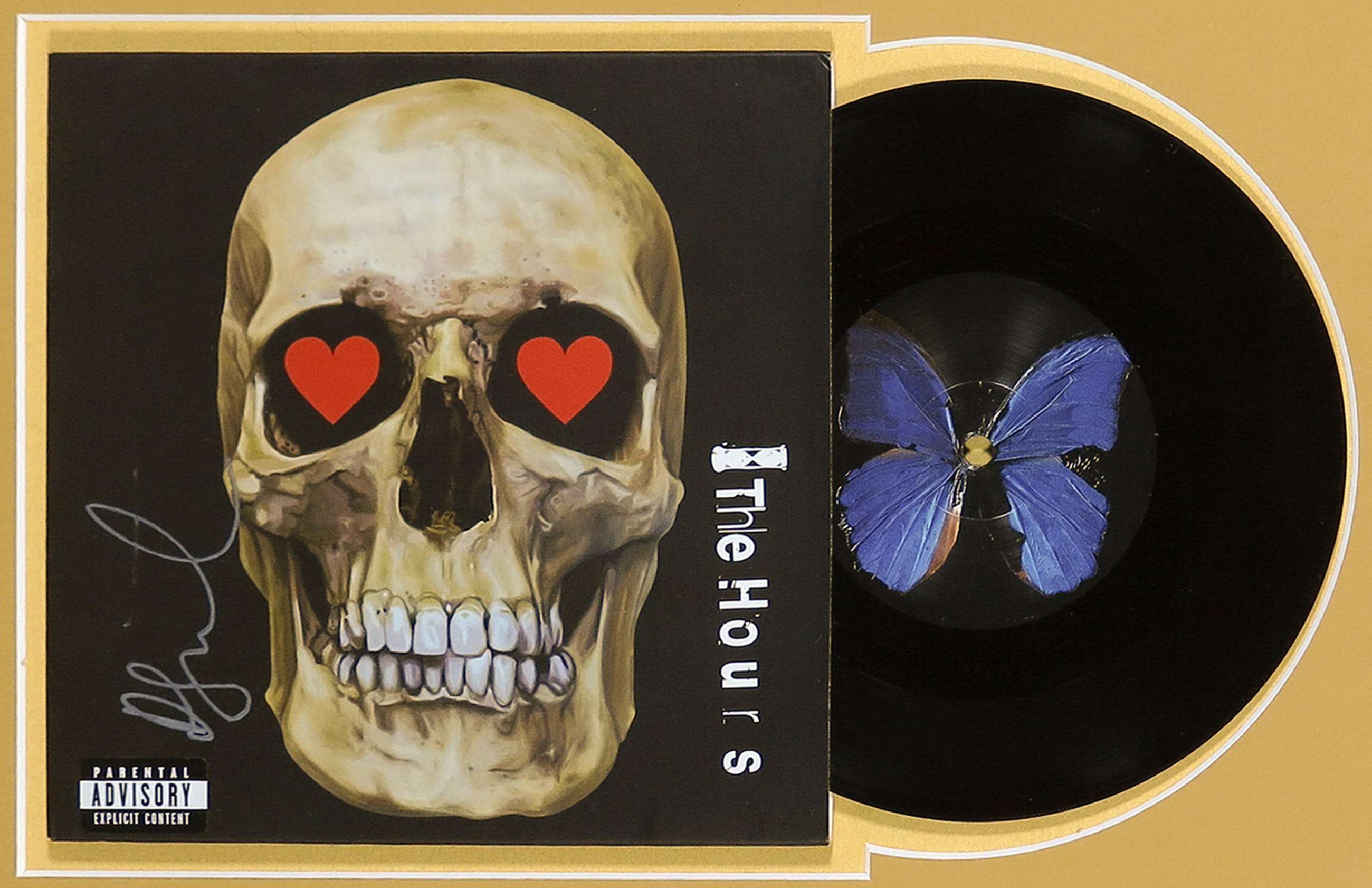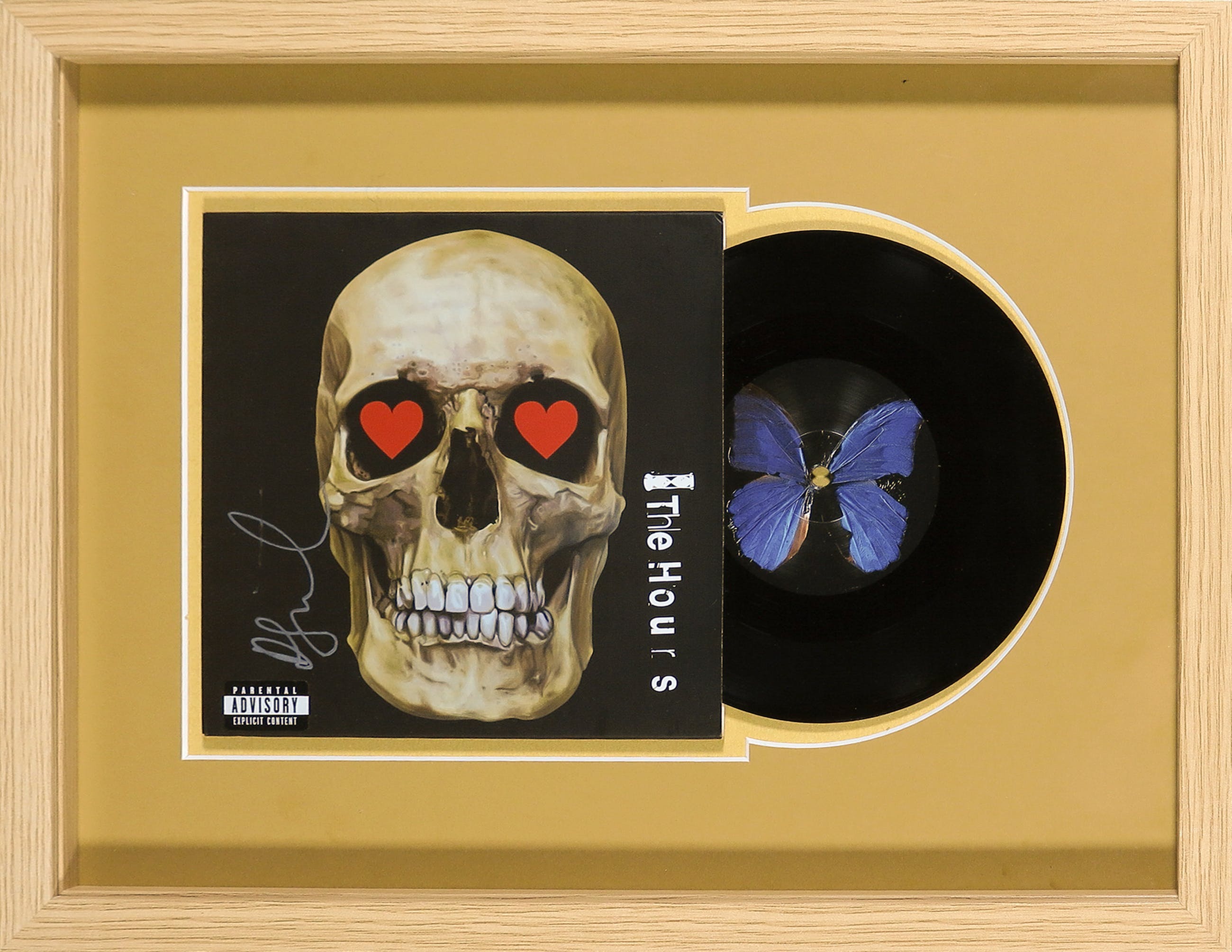 Ingelijst 7 inch single van The Hours, met een hoes ontworpen door Damien Hirst, welke ook door Hirst is gesigneerd.