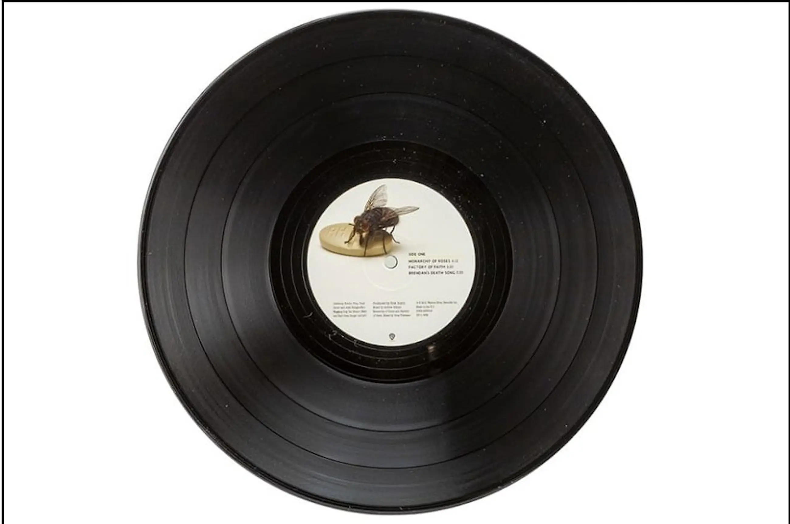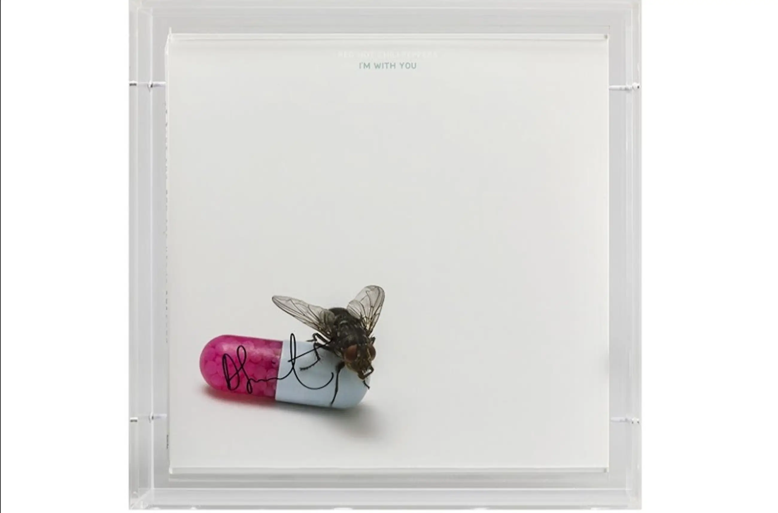 Deze gesigneerde LP-hoes is ontworpen door de wereldberoemde Britse kunstenaar Damien Hirst voor het album "I'm With You" van de Red Hot Chili Peppers uit 2011. Het artwork toont Hirsts kenmerkende compositie: een roze en witte capsule met een huisvlieg. Dit weerspiegelt zijn fascinatie voor het leven, de sterfelijkheid en de moderne geneeskunde .