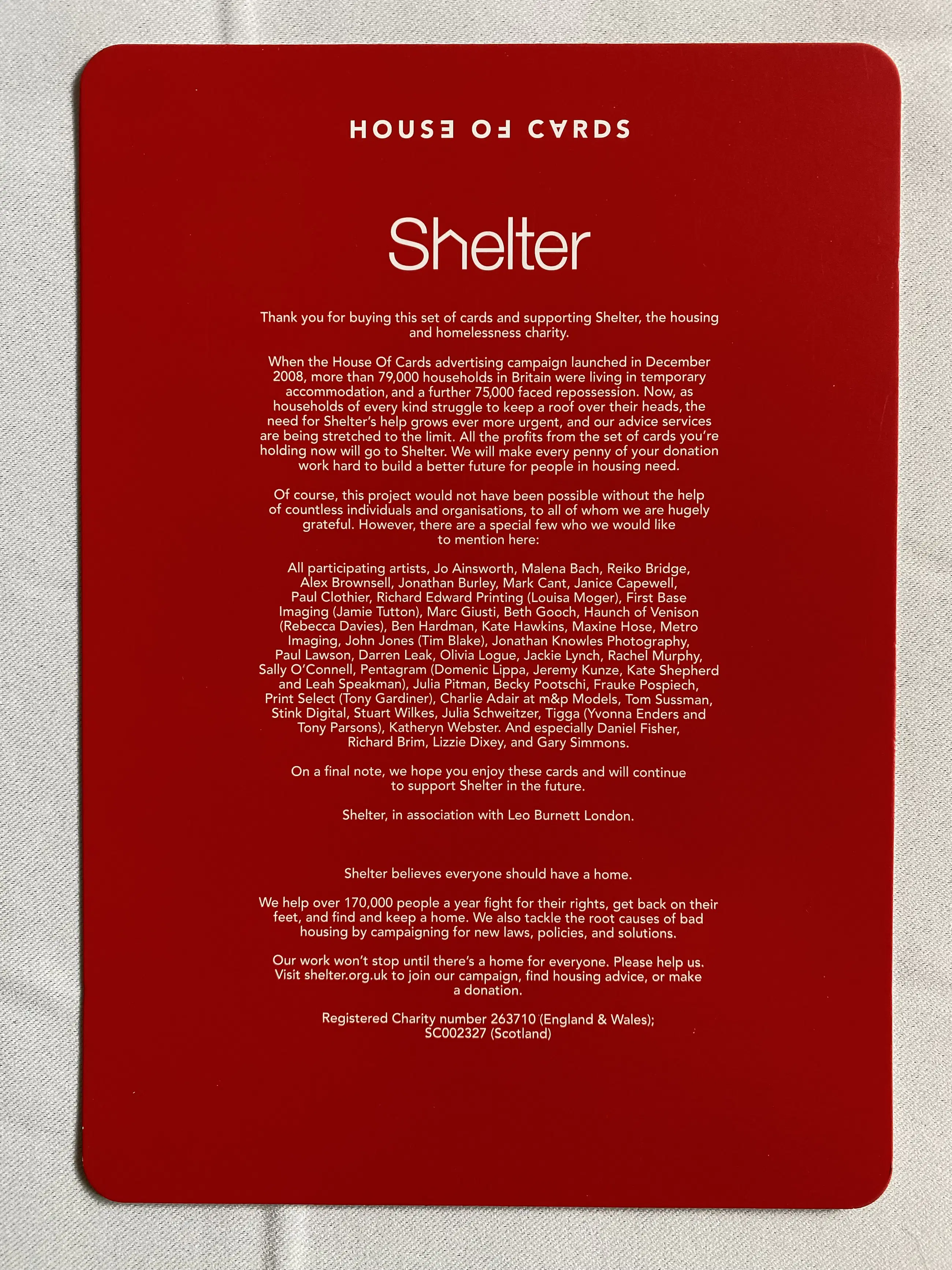Als onderdeel van Leo Burnetts 'House of Cards'-campagne voor Shelter nodigden ze 52 toonaangevende Britse kunstenaars, fotografen en ontwerpers (waaronder Damien Hirst, Boo Ritson, Mark Quinn, Nick Park, David Bailey, Alexander McQueen, Kyle Cooper, M/M Paris en Vivienne Westwood) uit om op maat gemaakte kunstwerken te maken voor een ambitieuze 'House of Cards'-tentoonstelling.