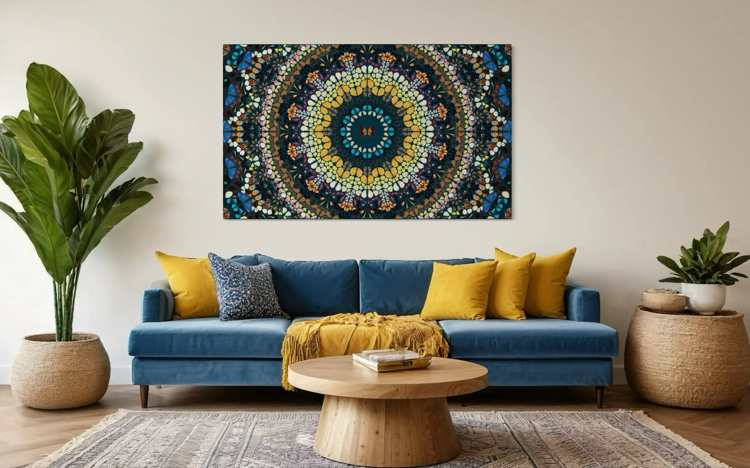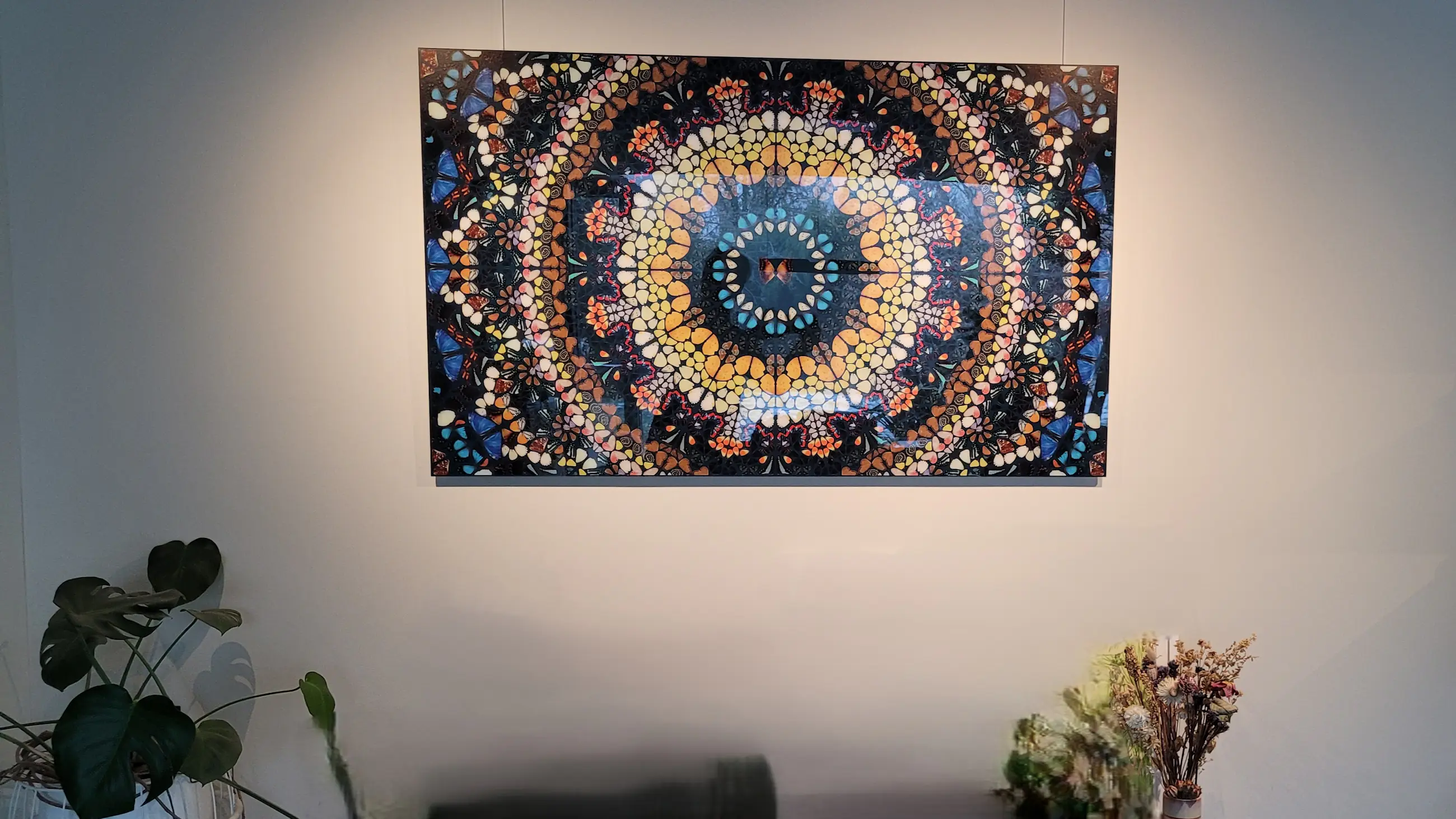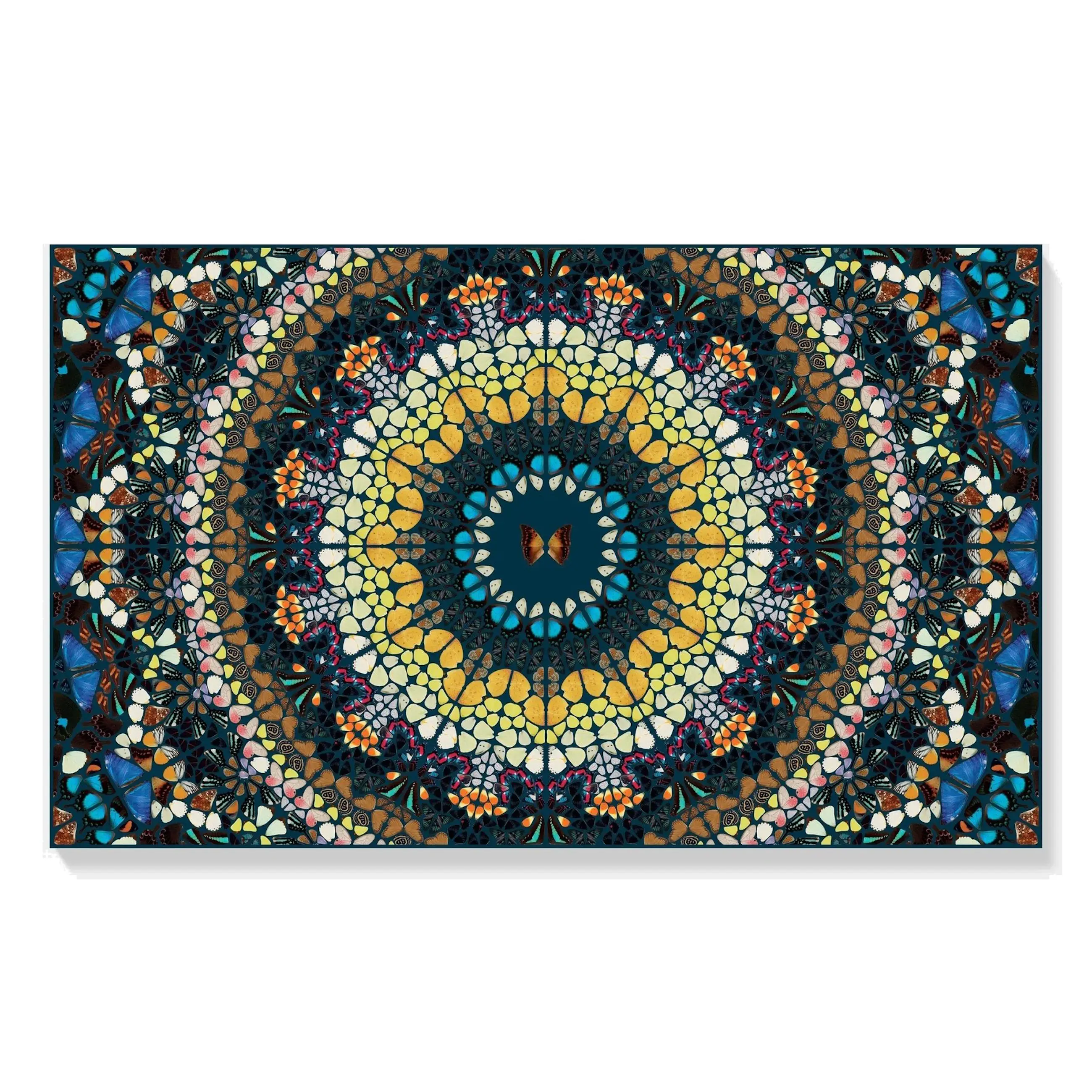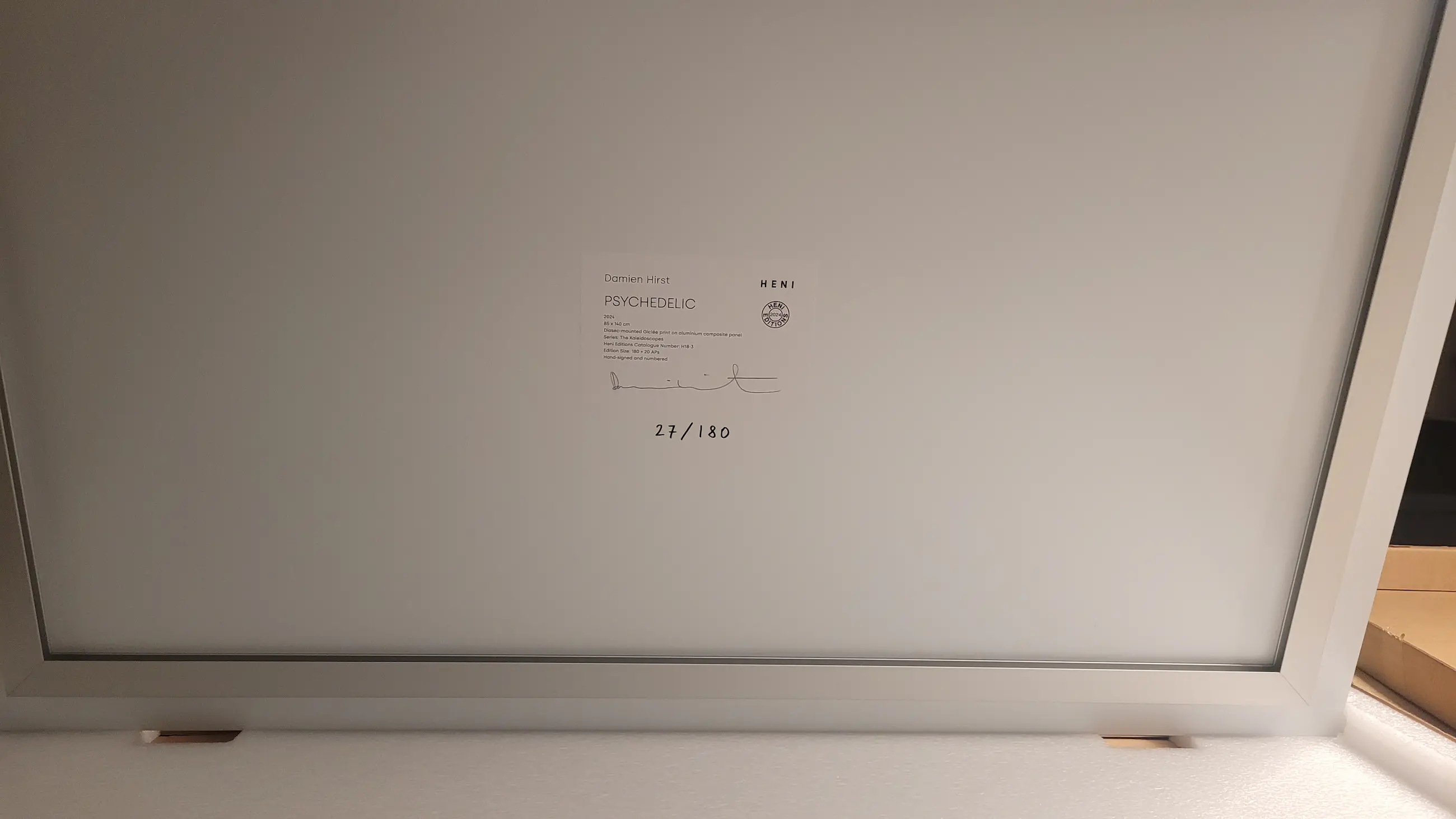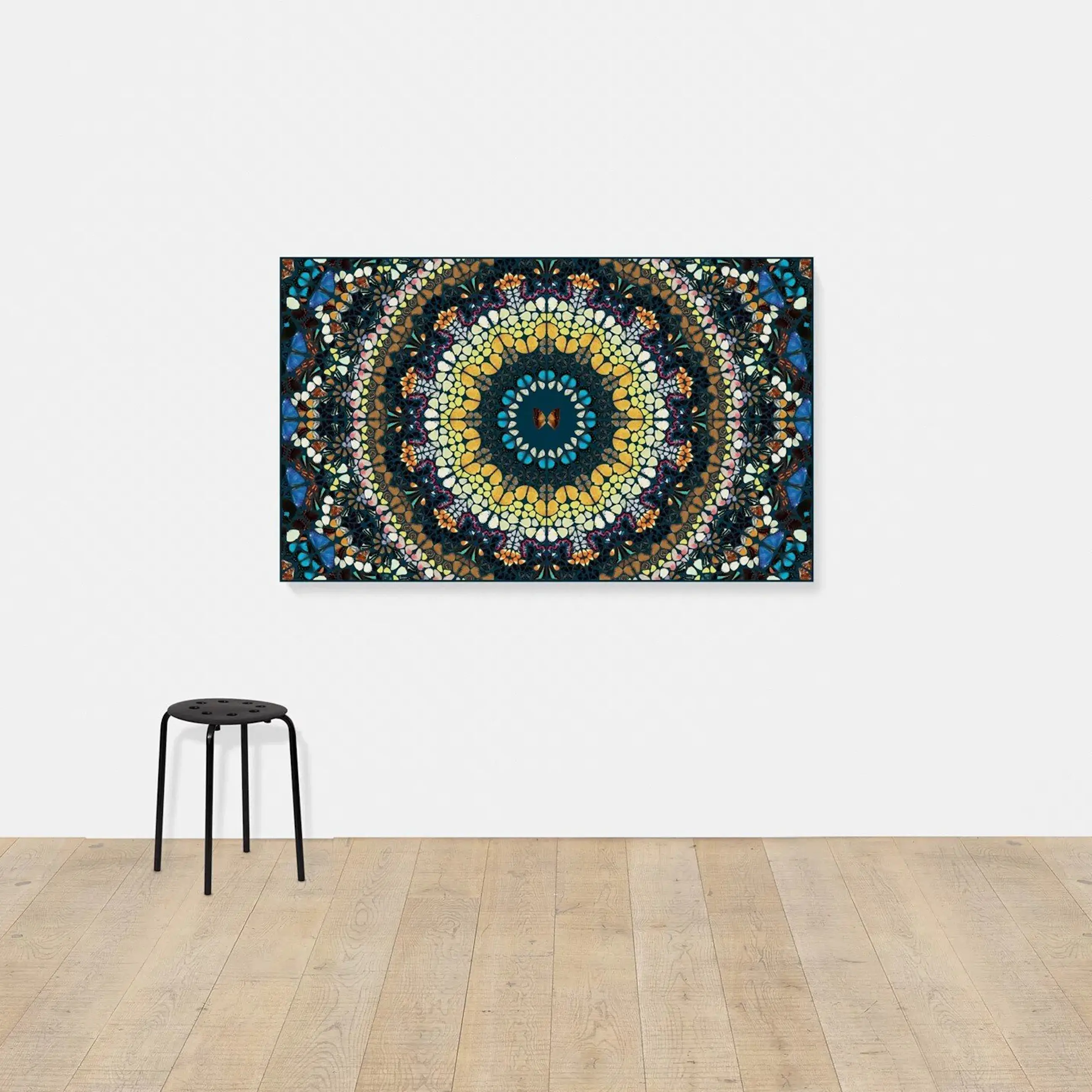"Psychedelic" uit de The Kaleidoscopes-serie van Damien Hirst is een levendige voortzetting van de verkenning van de kunstenaar van felgekleurde vlindervleugels gerangschikt in geometrische patronen. De symmetrische composities, geplaatst tegen levendige achtergronden, creëren een dynamisch visueel effect, waarbij de vlinders lijken te verschuiven en te roteren voor de ogen van de kijker. De ingewikkelde structuur en vloeibaarheid van het stuk dagen de perceptie van tijd uit, waardoor de vlinders levend lijken, maar toch bevroren in de tijd.