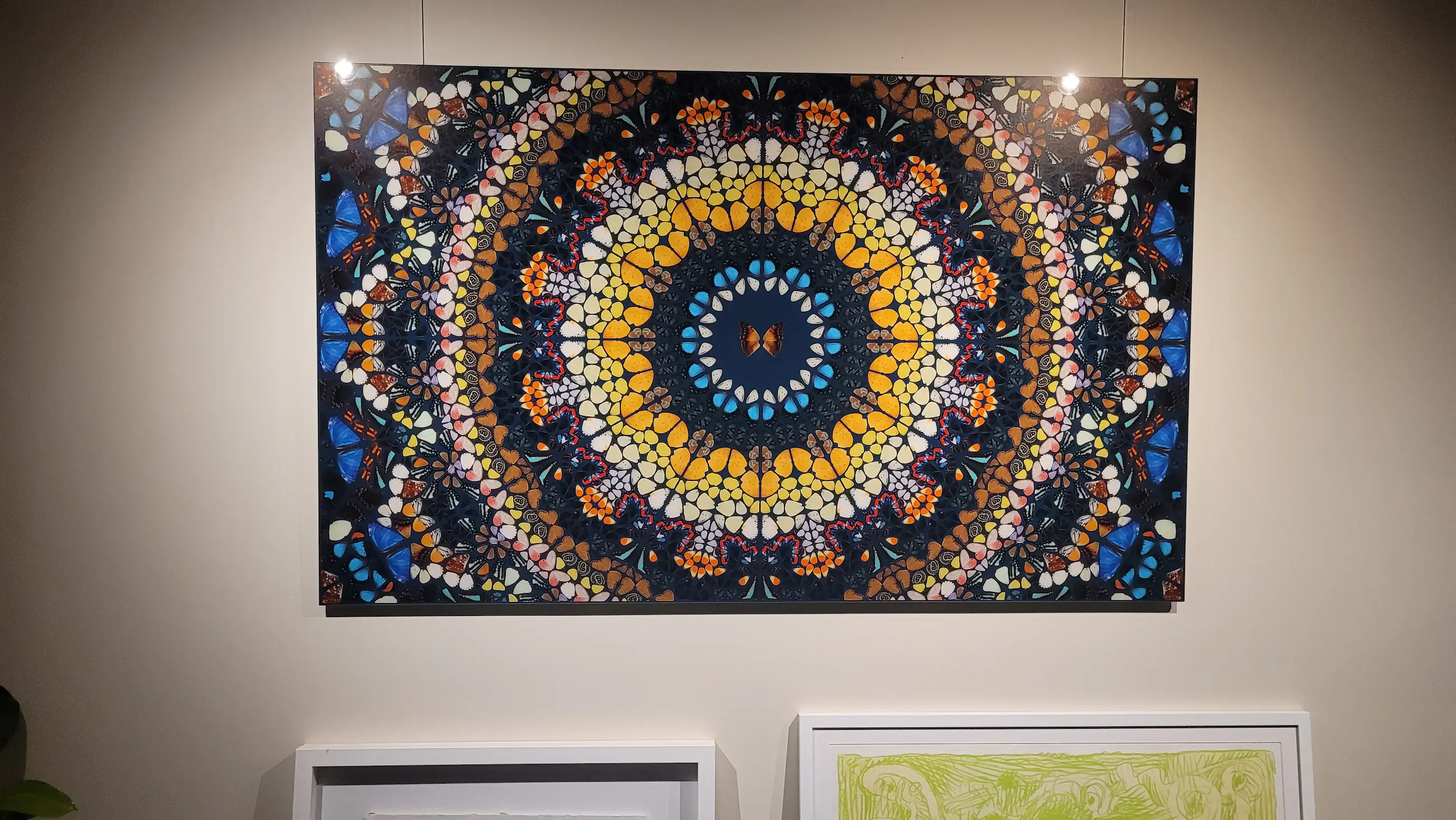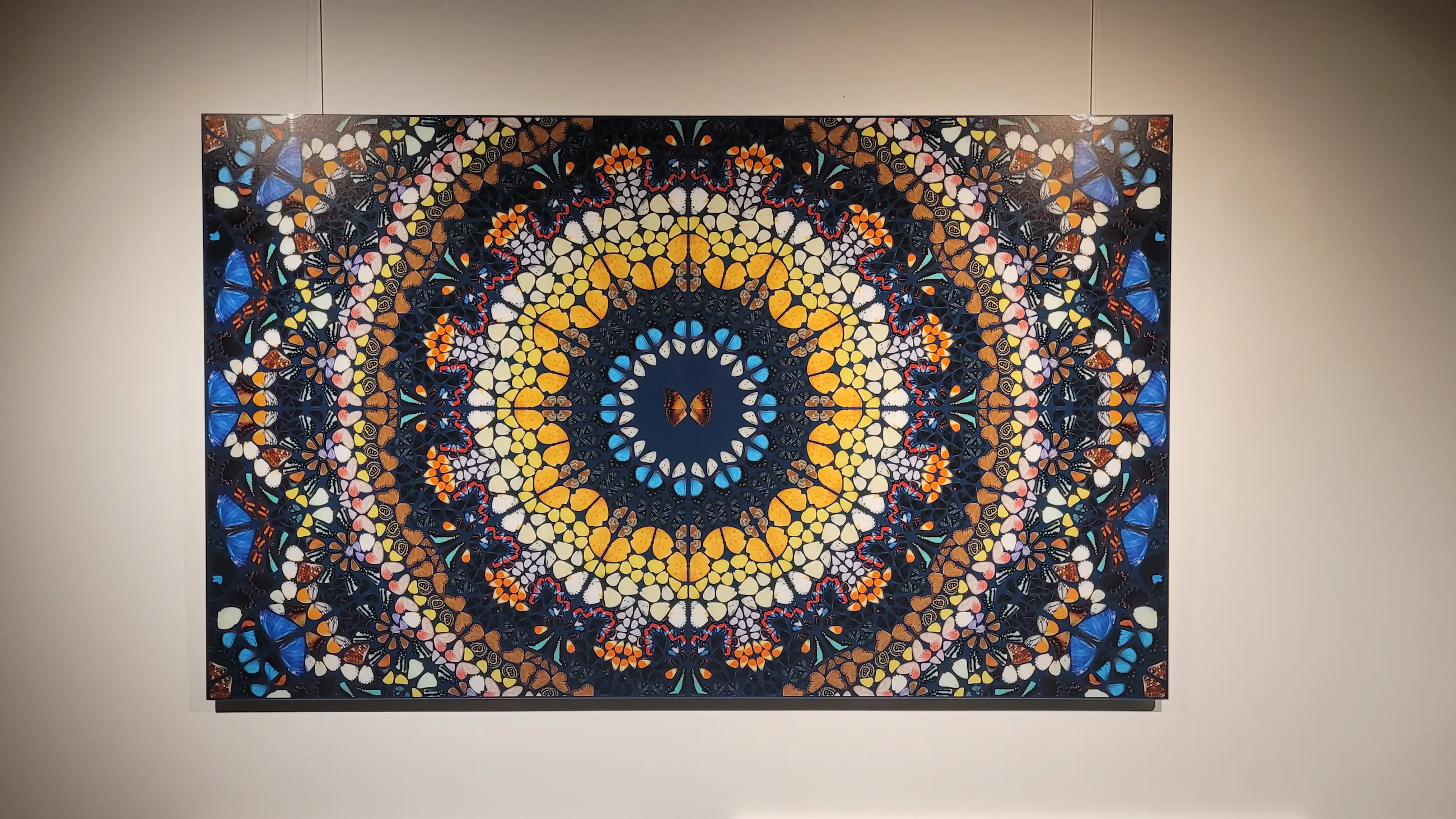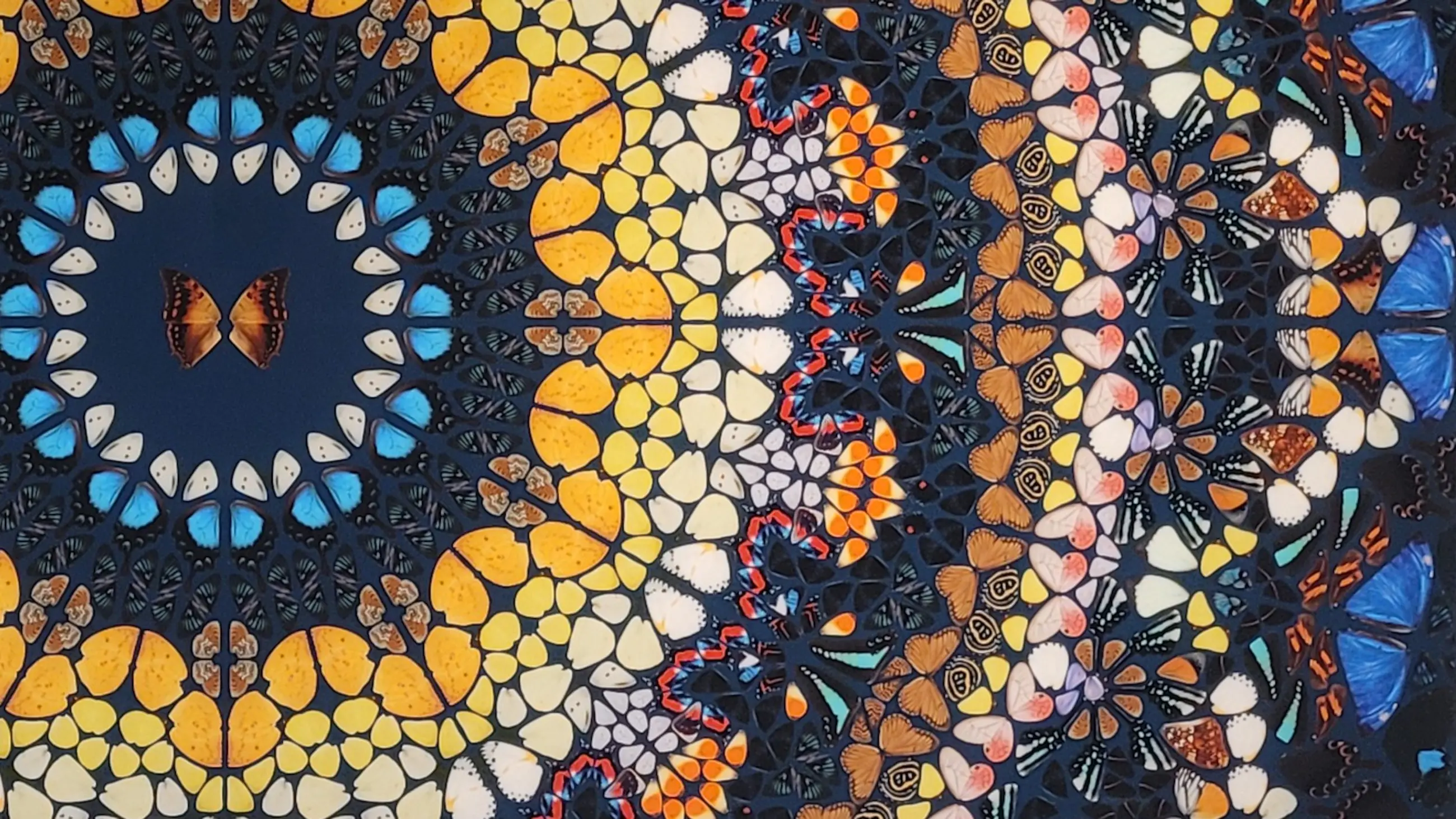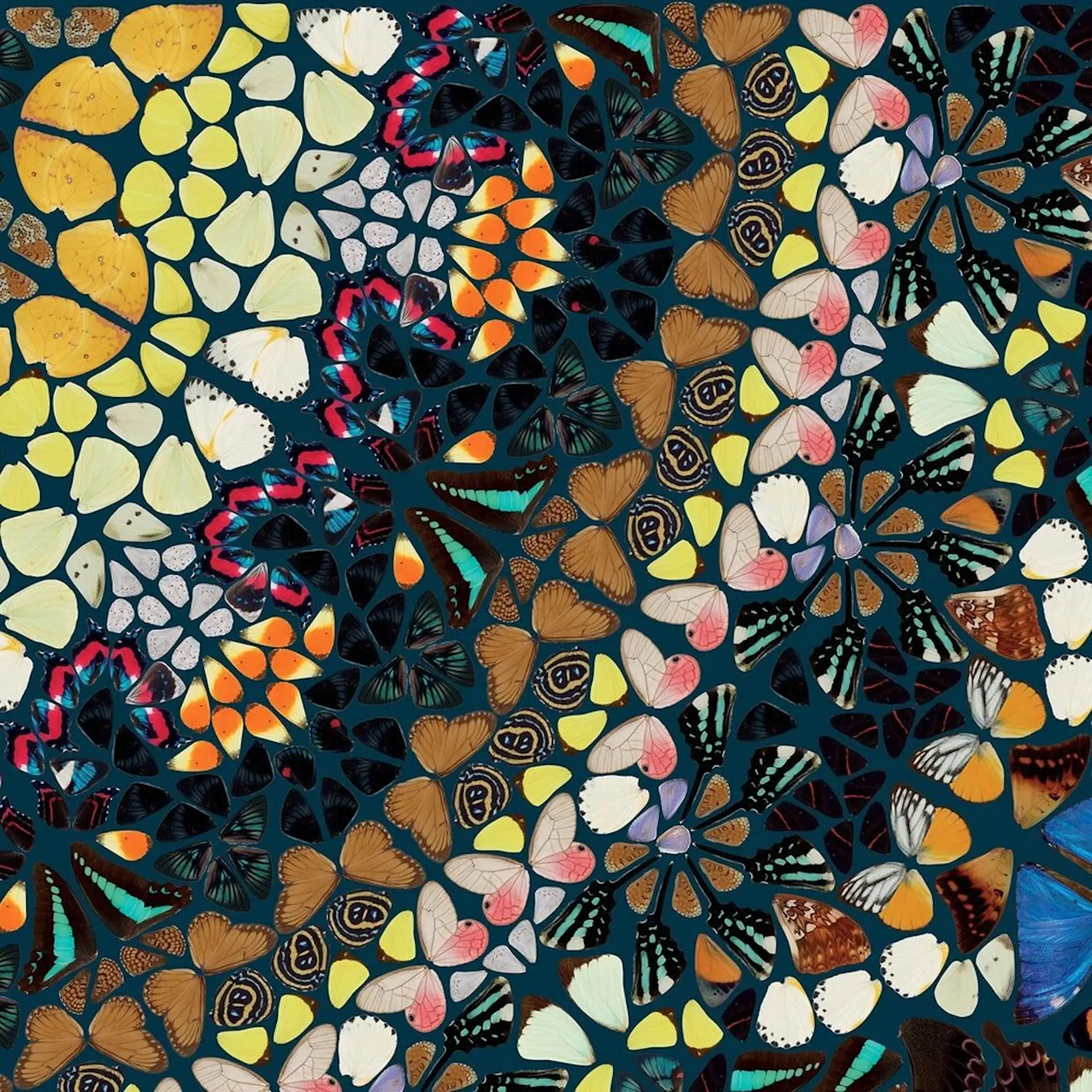Prachtig en imposant werk van Damien Hirst met honderden felgekleurde vlindervleugels gerangschikt in geometrische patronen.