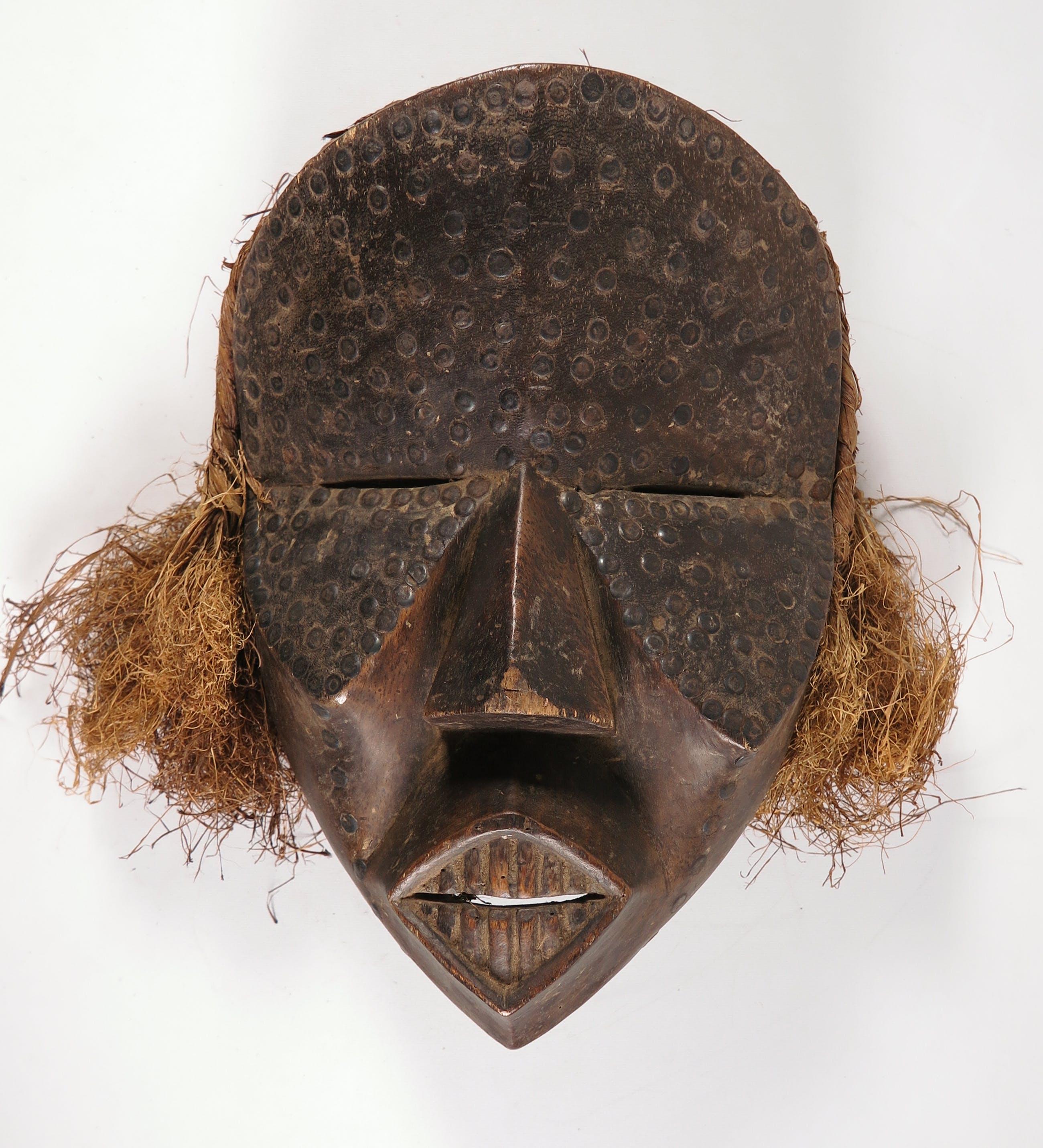 Gestoken houten vrouwelijk masker met plantenresten en nagels.