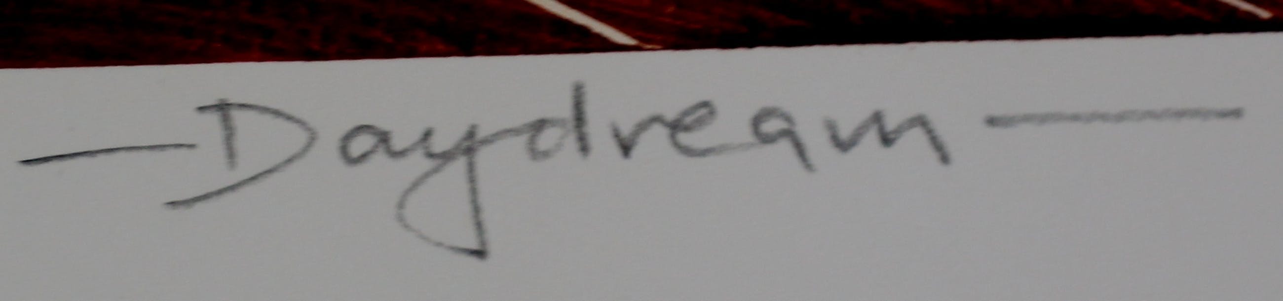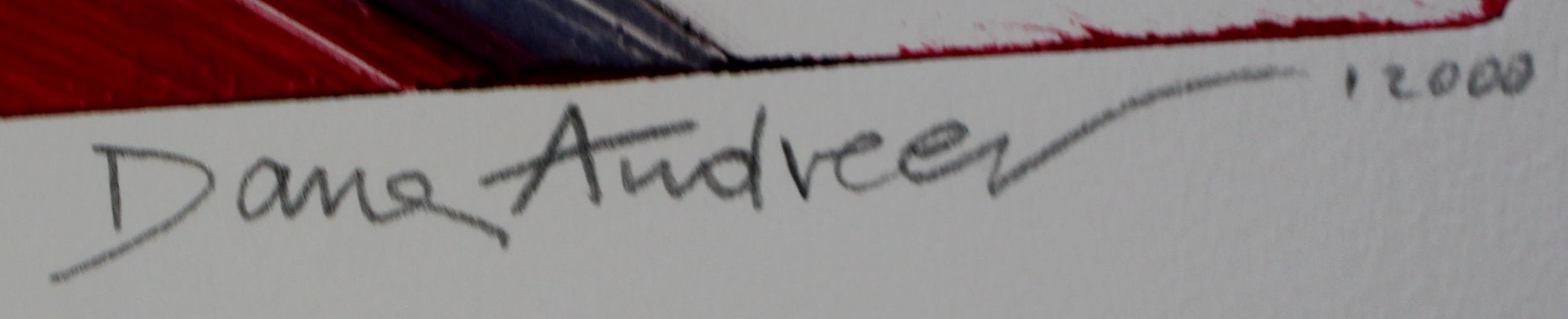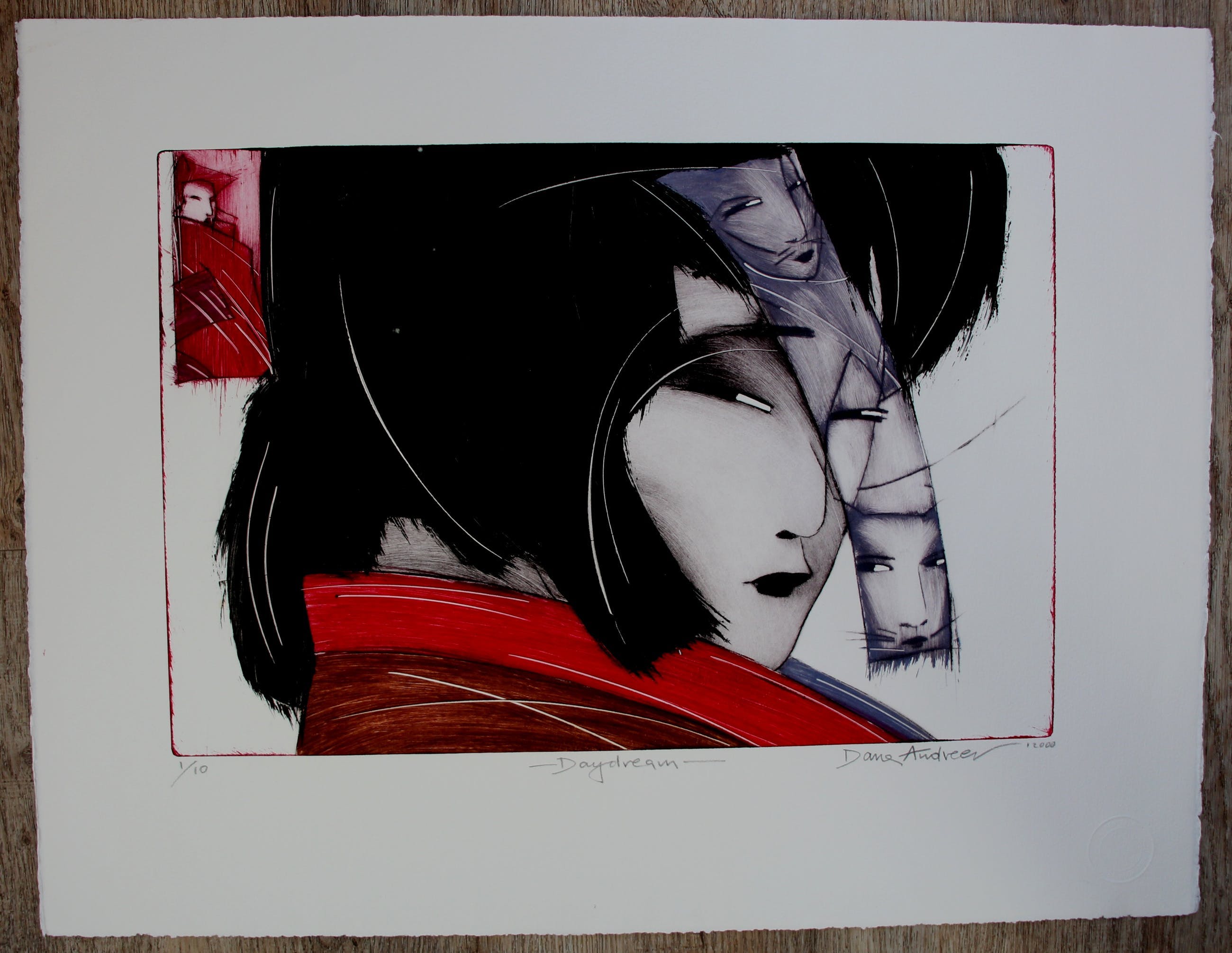Kleurenets van Dana Andreev uit 2000. Titel: Daydream. Oplage: 2/10. Afmetingen blad: H50 x b65cm. Afmetingen voorstelling: H32.5 x b49cm. Het werk is rechtsonder gesigneerd door de kunstenares met potlood. De authenticiteit van het aangeboden werk wordt volledig gegarandeerd. Een certificaat van echtheid kan, op aanvraag, worden gemaild.
