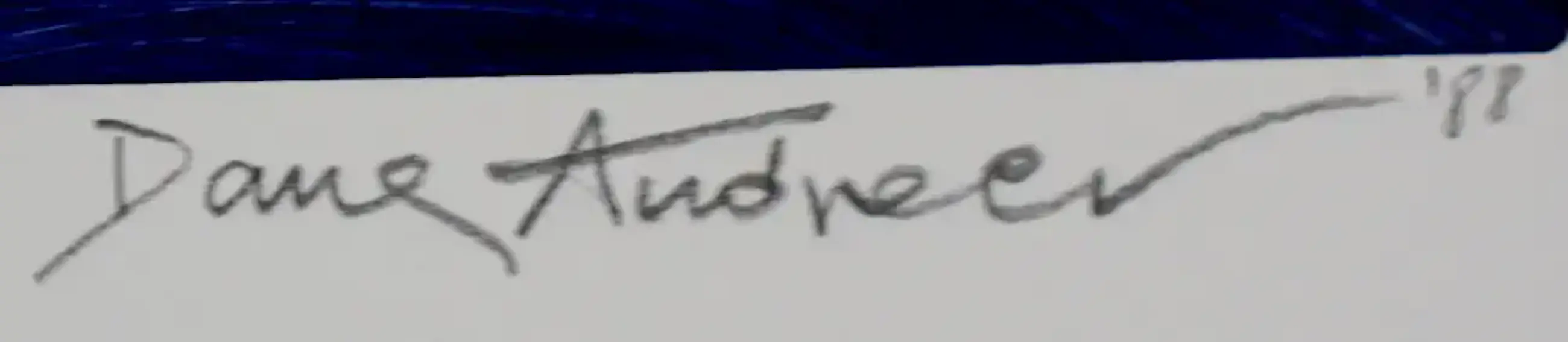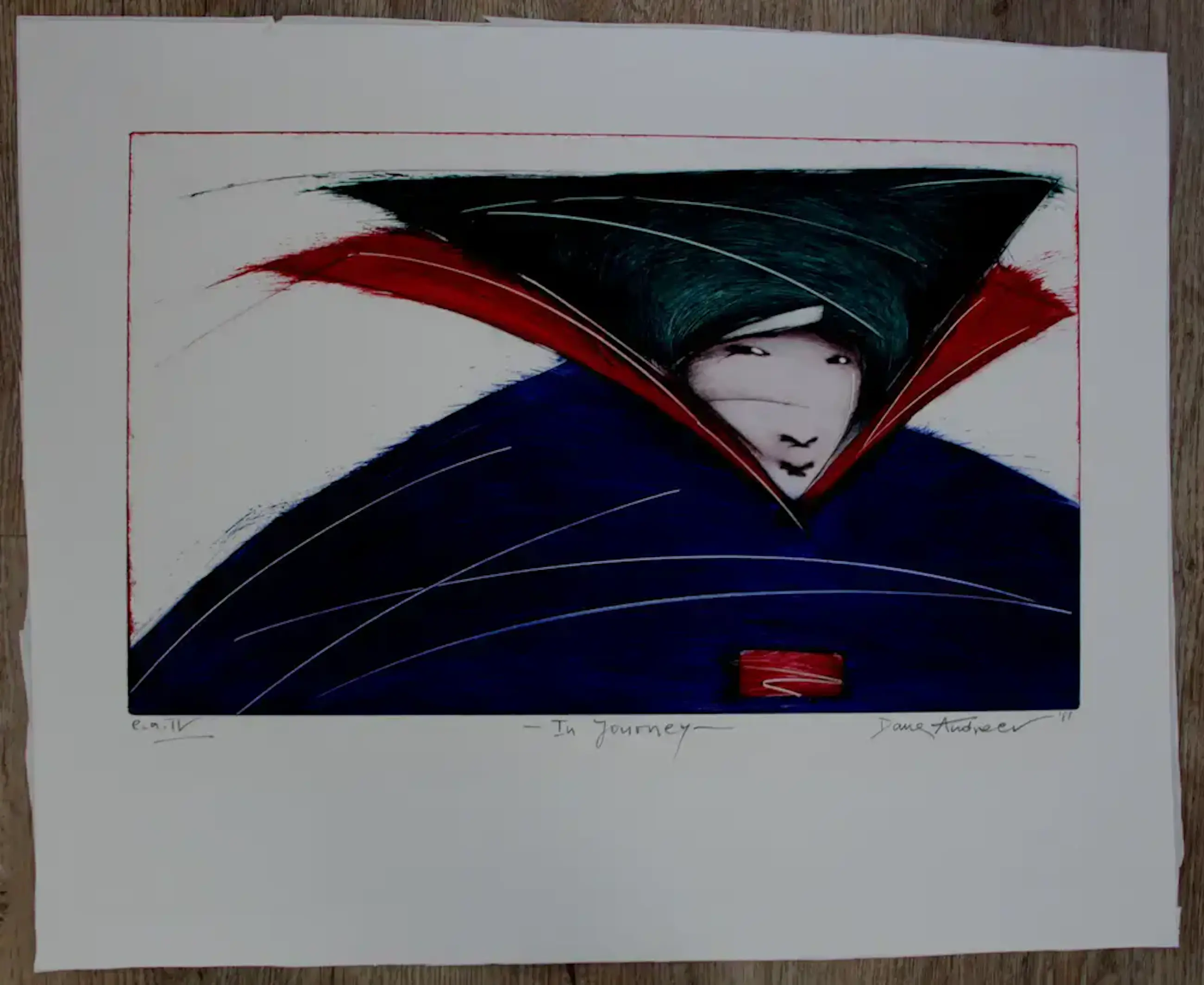 Kleurenets van Dana Andreev uit 1988. Elke nummer van deze serie is een uniek item. Geen van de etsen heeft namelijk dezelfde kleuren. Hierdoor is elk item een unicum. Titel: In Journey. Oplage: E.A, IV. Afmetingen blad: H50 x b65cm. Afmetingen voorstelling: H29.5 x b39cm. Het werk is rechtsonder gesigneerd door de kunstenares met potlood. De authenticiteit van het aangeboden werk wordt volledig gegarandeerd. Een certificaat van echtheid kan, op aanvraag, worden gemaild.