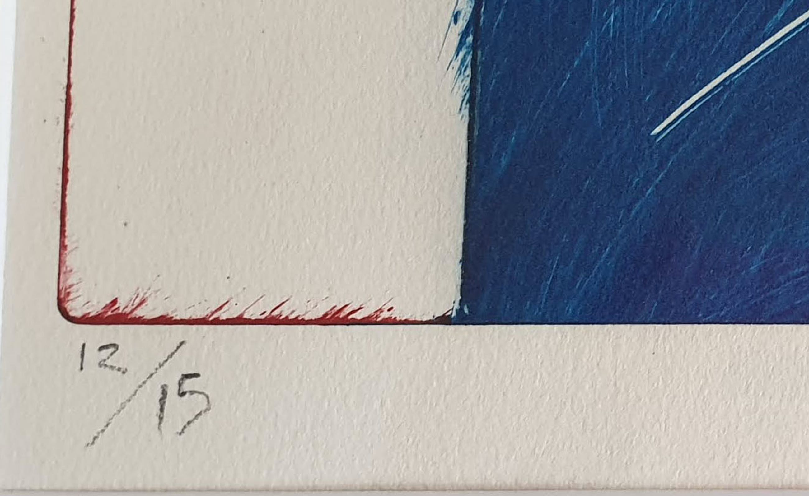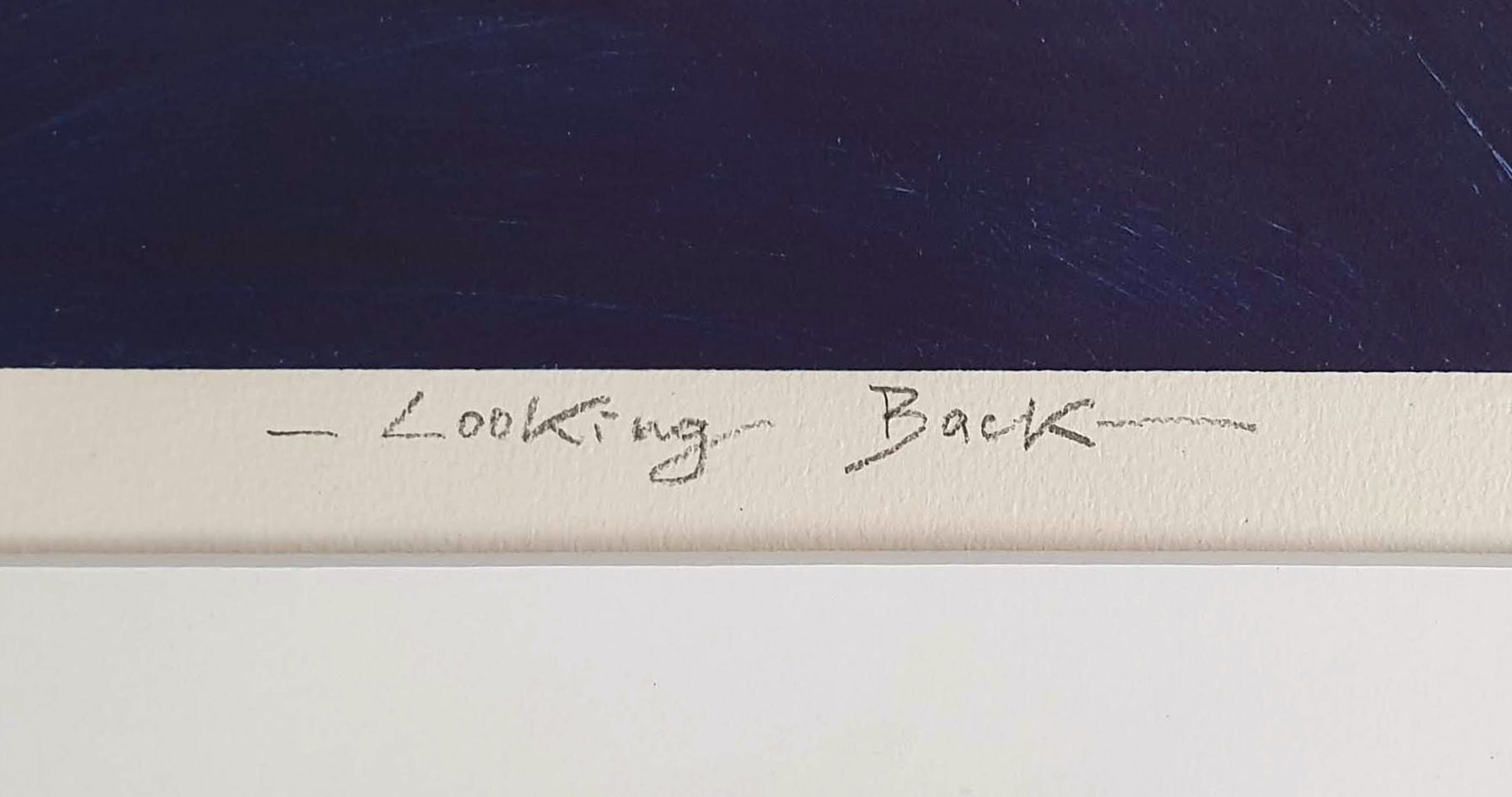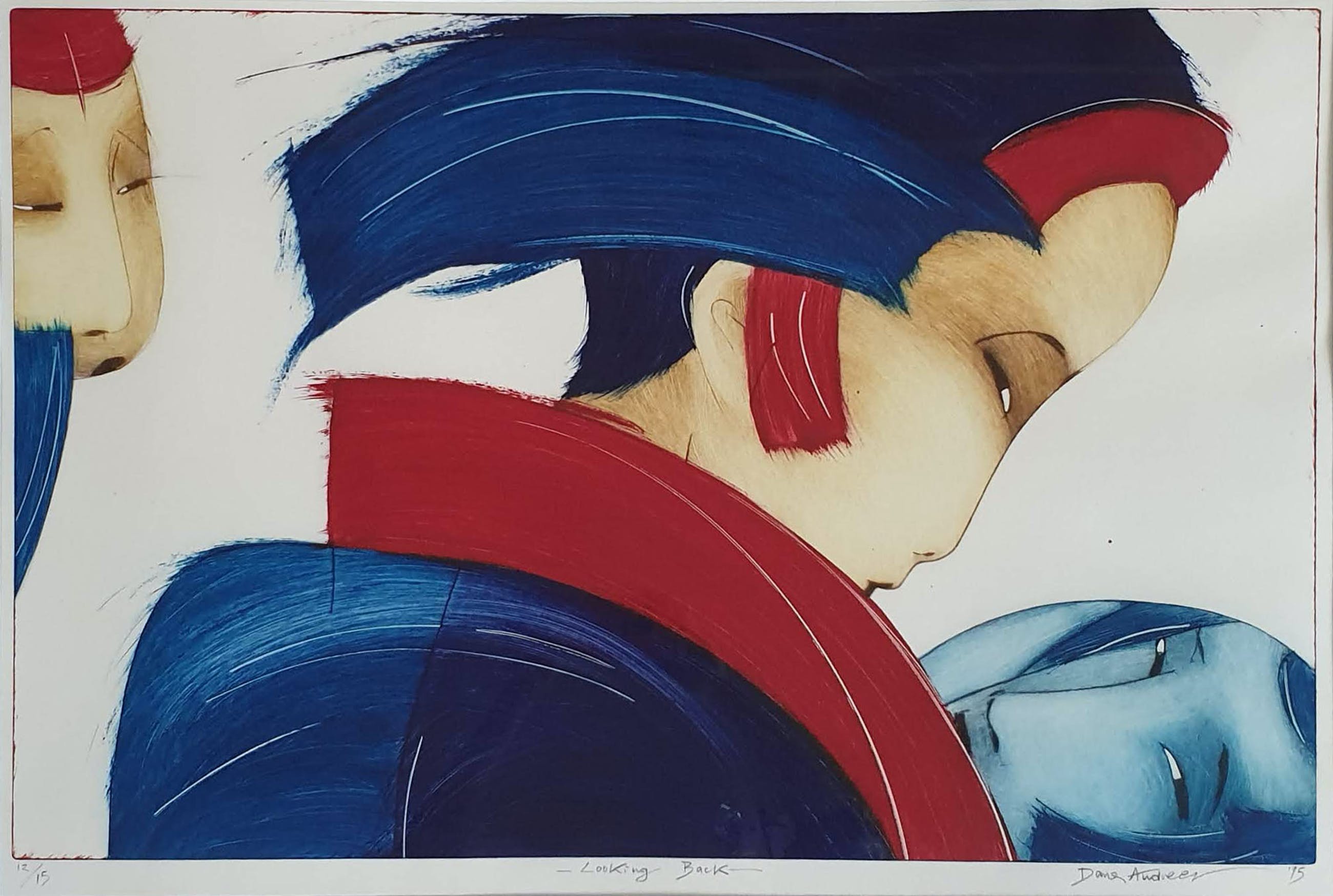 Ingelijste ets van Dana Andreev met de titel: 'Looking back' uit 1995. Het werk is rechtsonder met de hand gesigneerd door de kunstenaar.