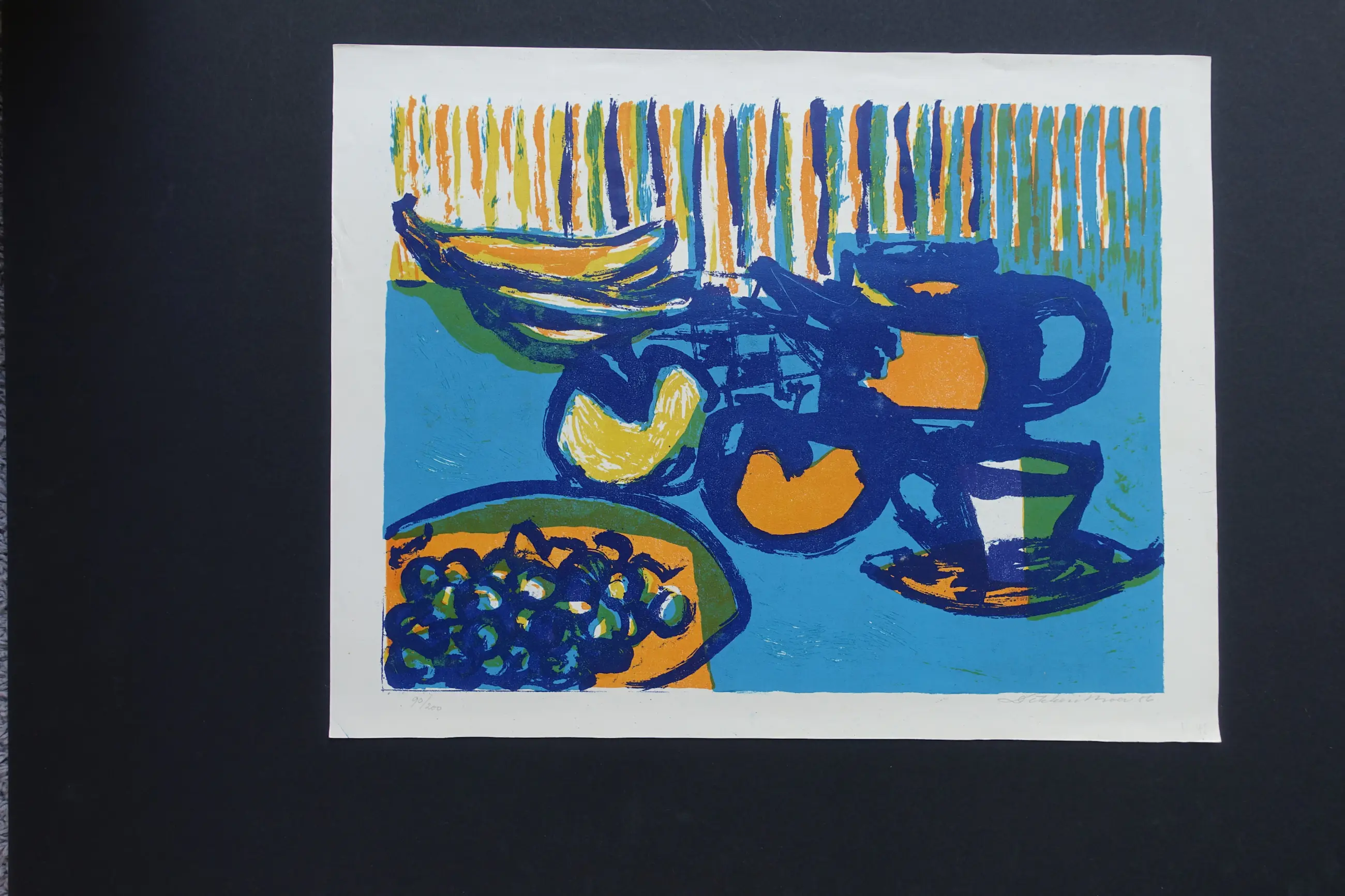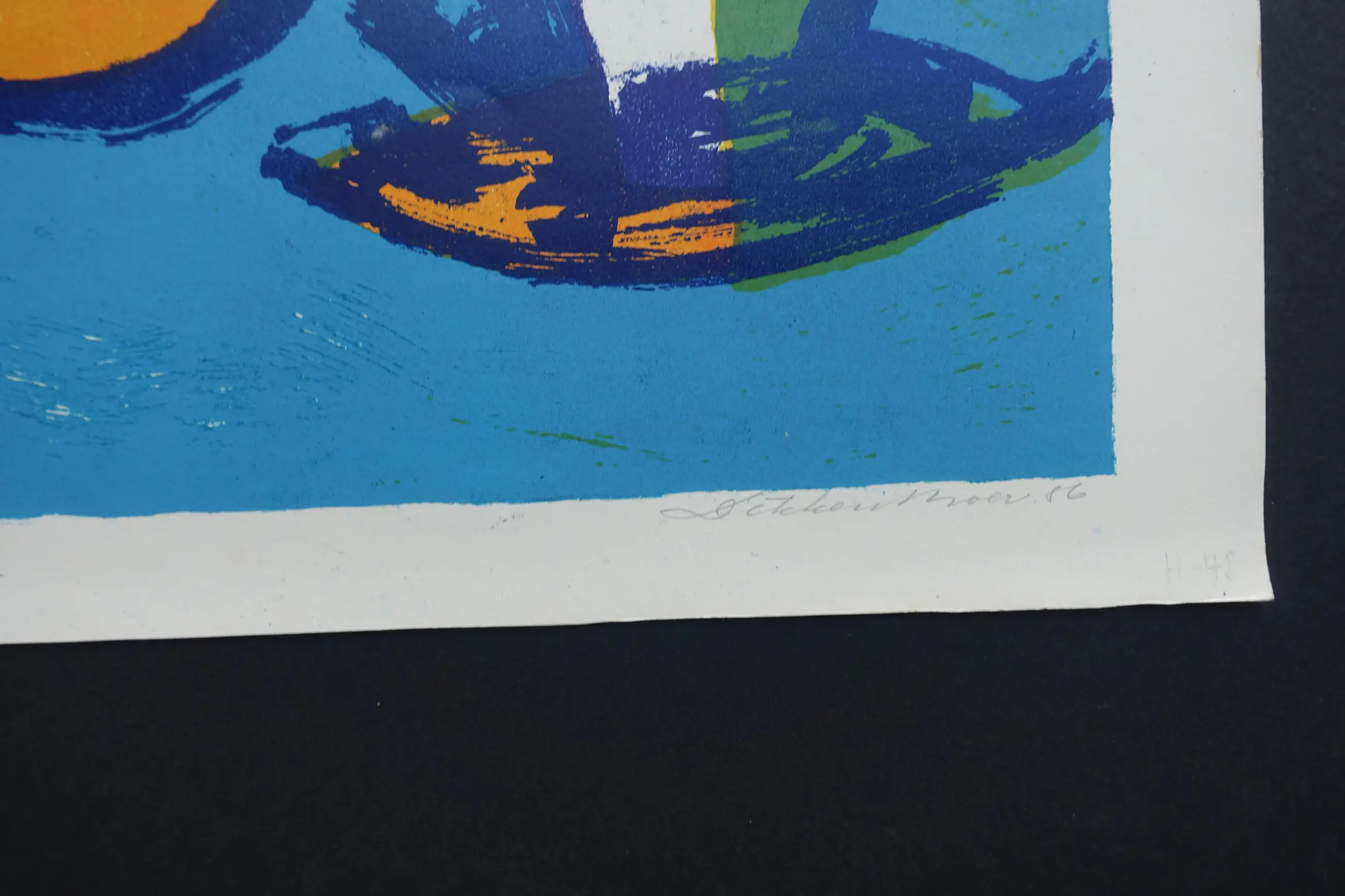 Dynamische kleurenlitho uit de vijftiger jaren van de vorige eeuw. Formaat van het blad 39 x 50 cm. Gesigneerd en gedateerd met potlood. Oplage 90/200. Uitstekende conditie