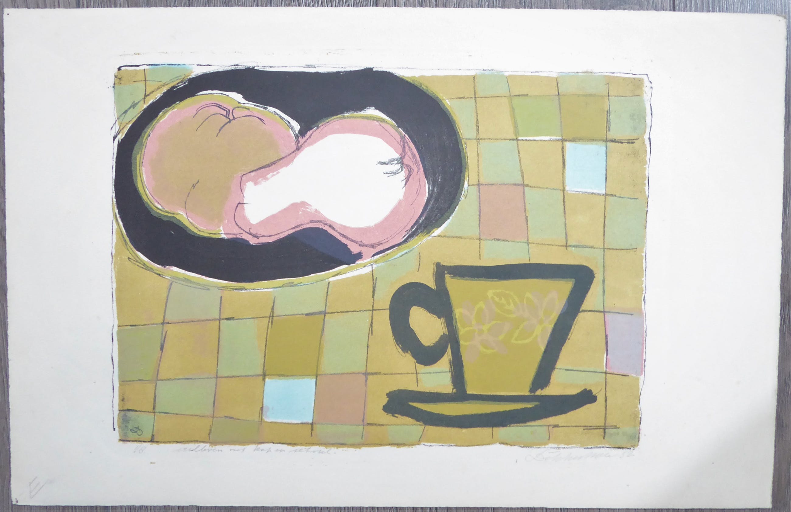 Gesigneerde litho. Linksonder in potlood '1/8' en 'stilleven met kop en schotel', rechtsonder 'Dikkenboer 52'. Mooi voorbeeld van de Rotterdamse meester van de kleurgrafiek, uit zijn beste periode. Beeldgrootte 24,5 x 34,5 cm.