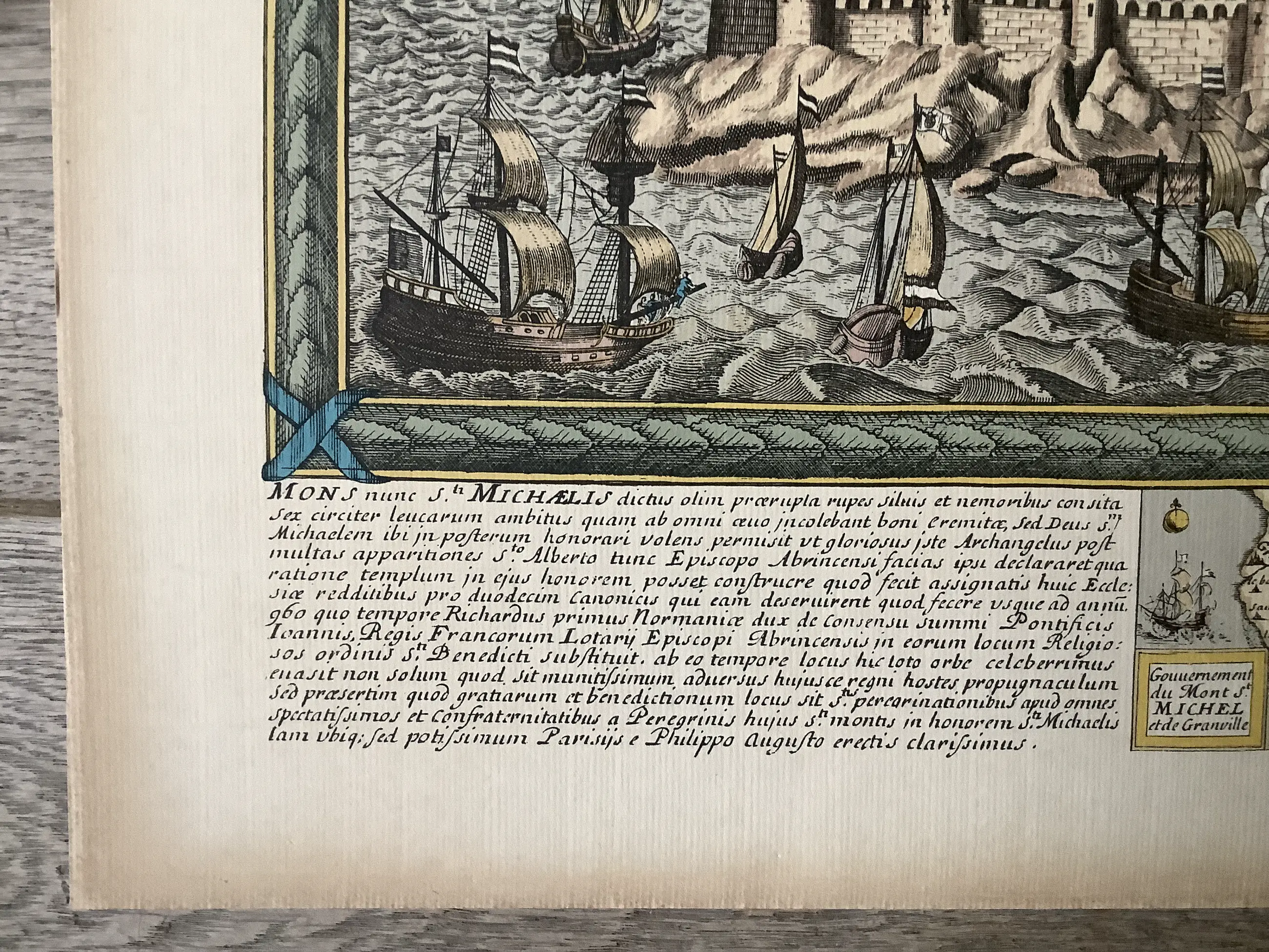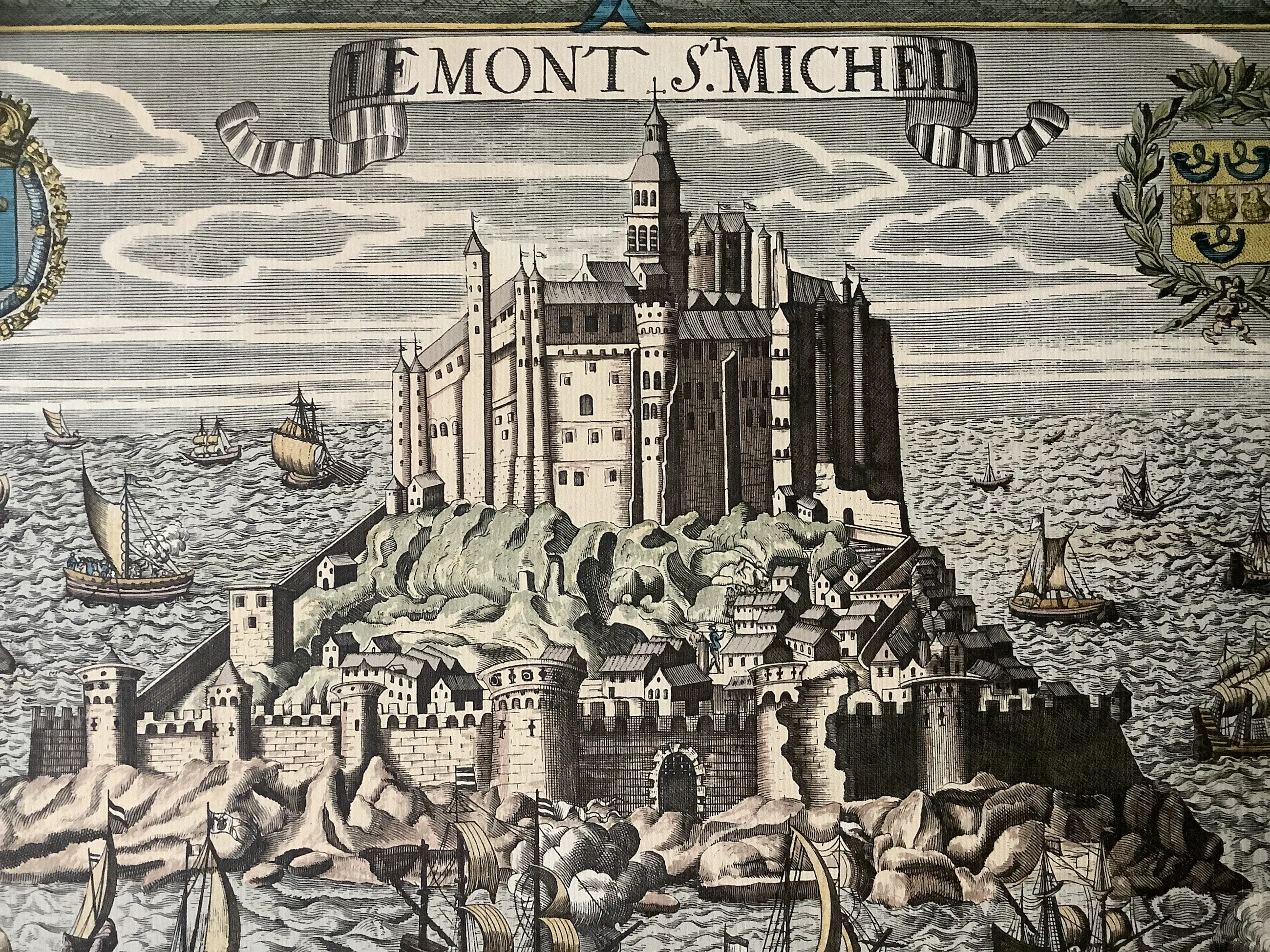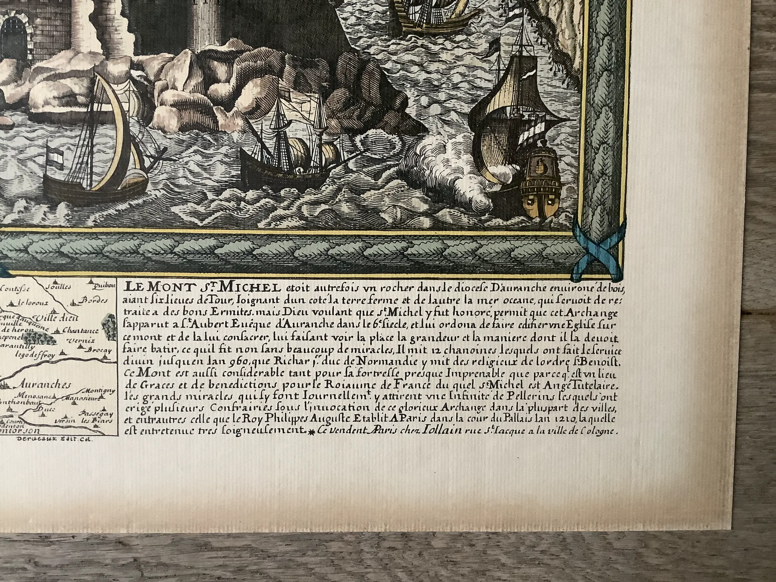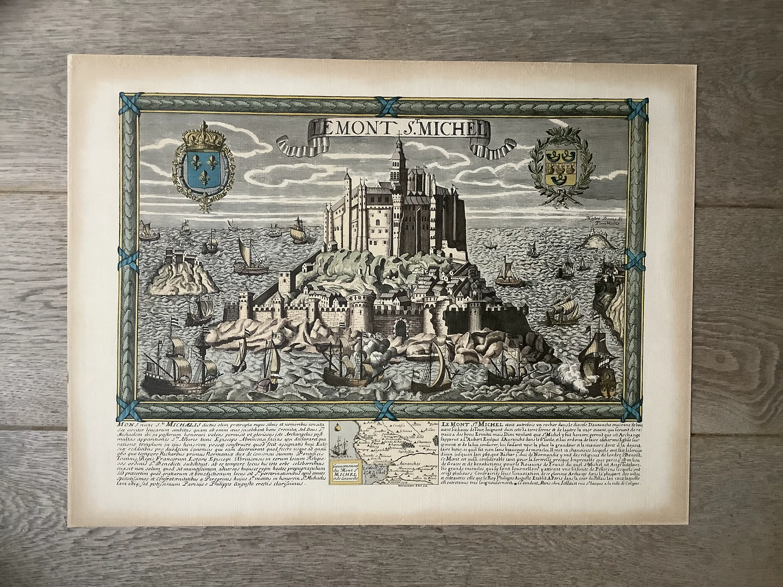 Le Mont St.Michel. Gravure naar Jollains origineel uit 1680. Editions d'Art, Daniel Derveaux. Gravure in 9 kleuren, op Velin papier. Watermerk onderin LANA 1590. Papier is wat donker verkleurd maar in mooie staat. Niet ingekaderd.
