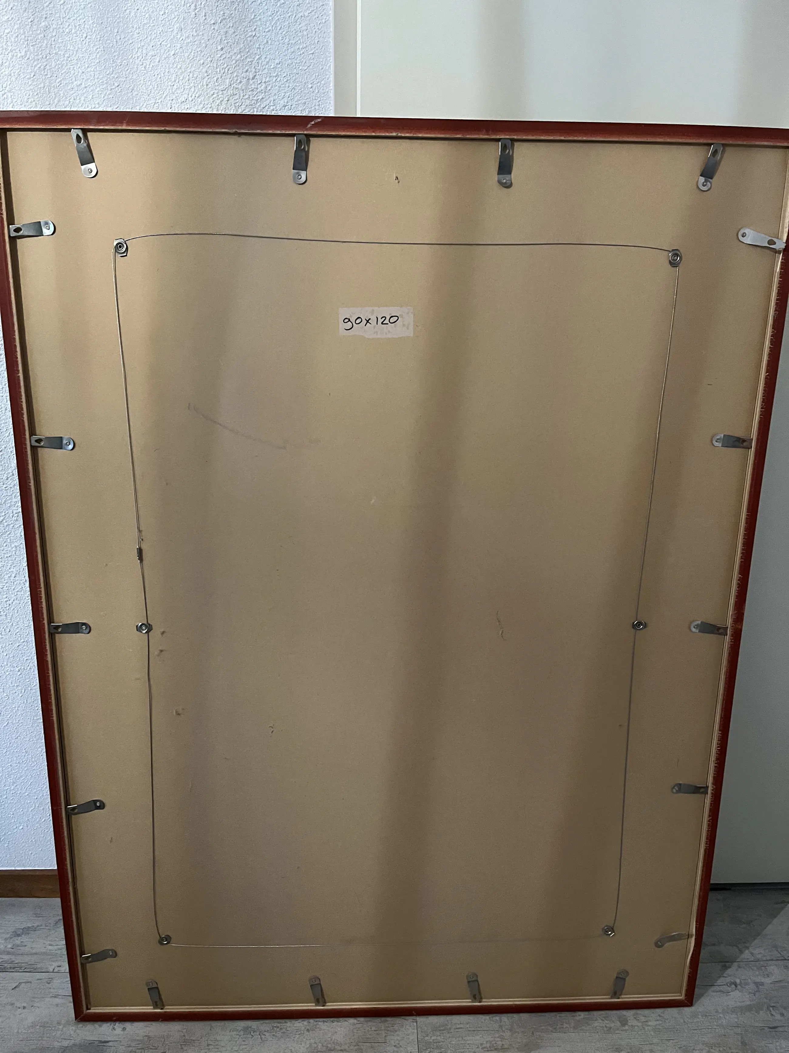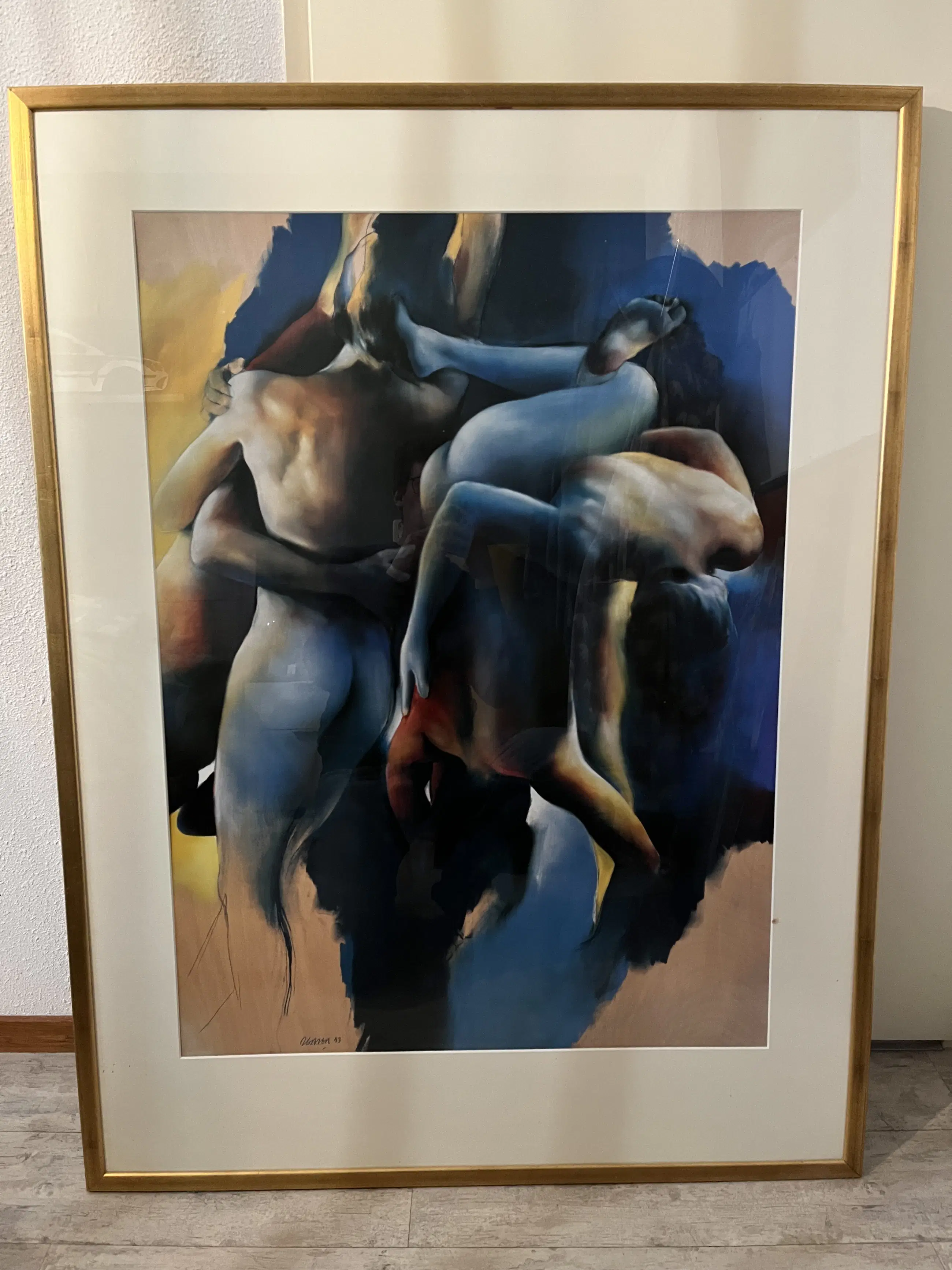 Een werk gemaakt door Daniel Gasser, genaamd mythologies. Groot schilderij in goede staat. Lijst vertoont slijtage, zie foto's.