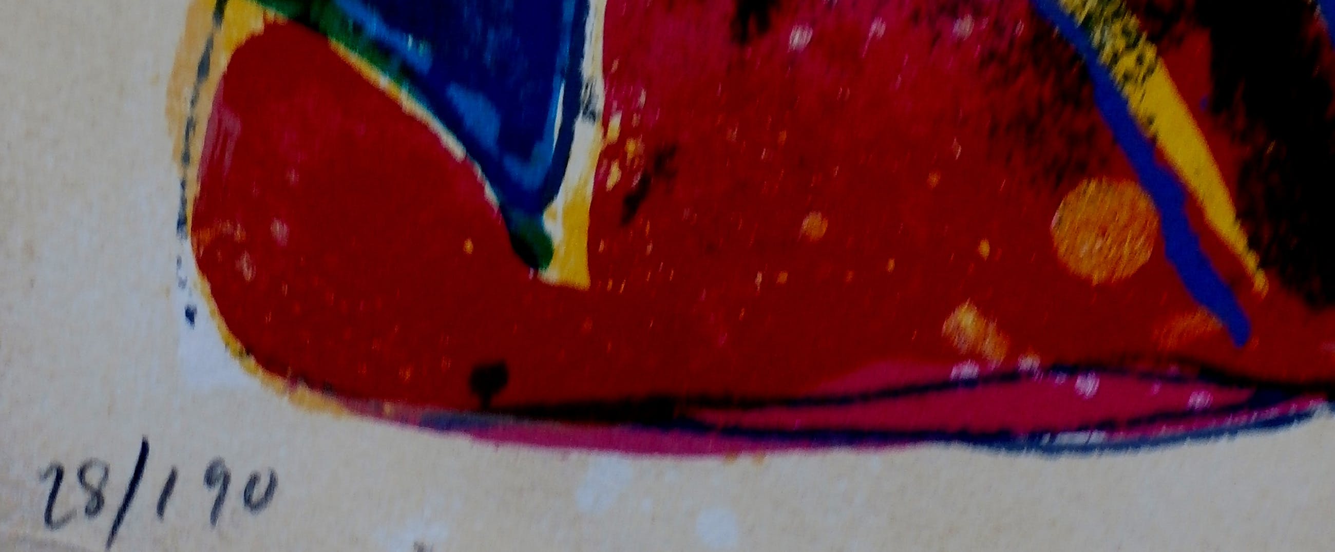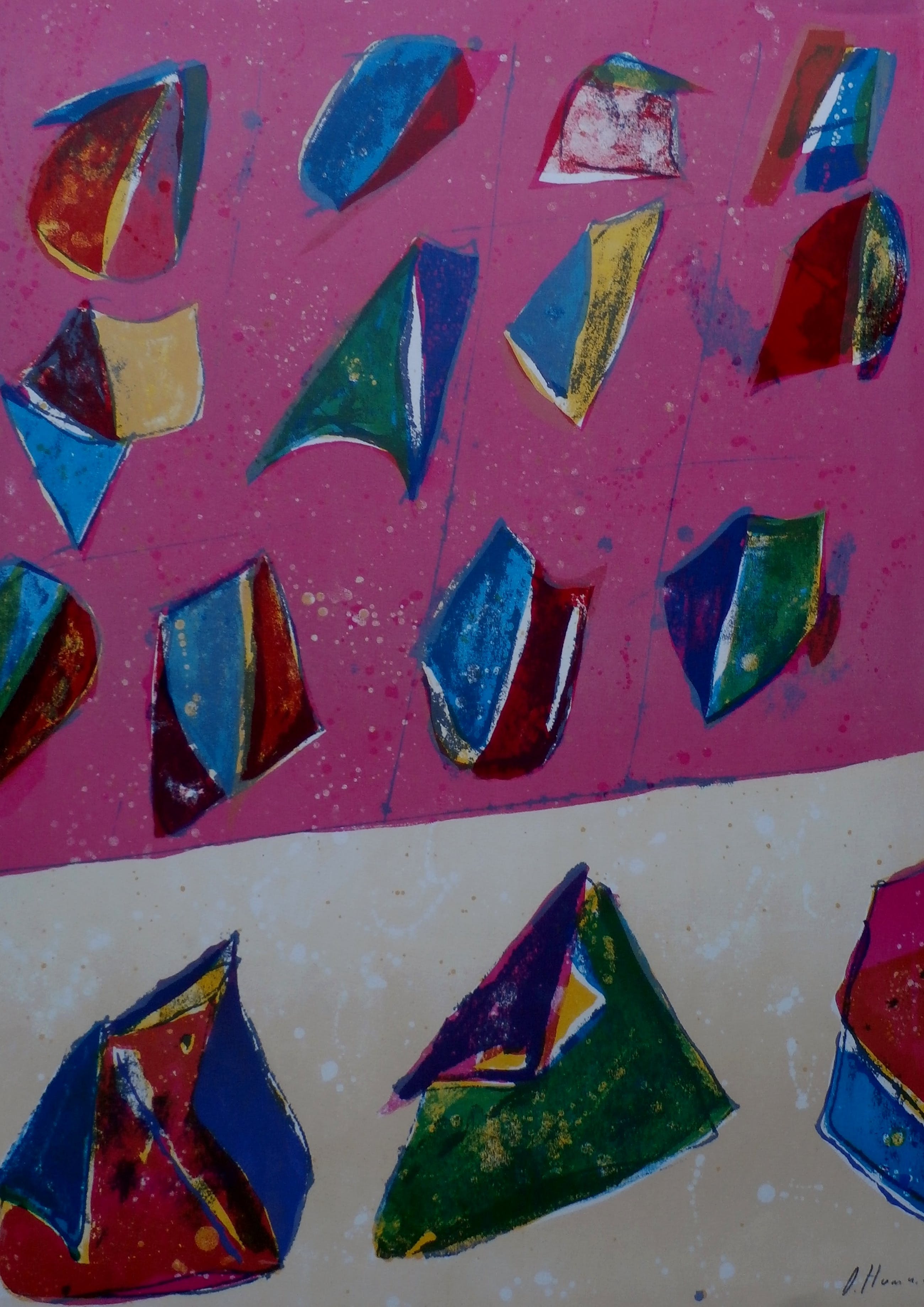 Titel: Abstracte compositie Jaartal: 1980 Afmetingen: 75 cm x 53 cm Oplage: 190/190 Gesigneerd: Ja, handgesigneerd Materiaal: Litho op stevig papier Ingelijst: Nee