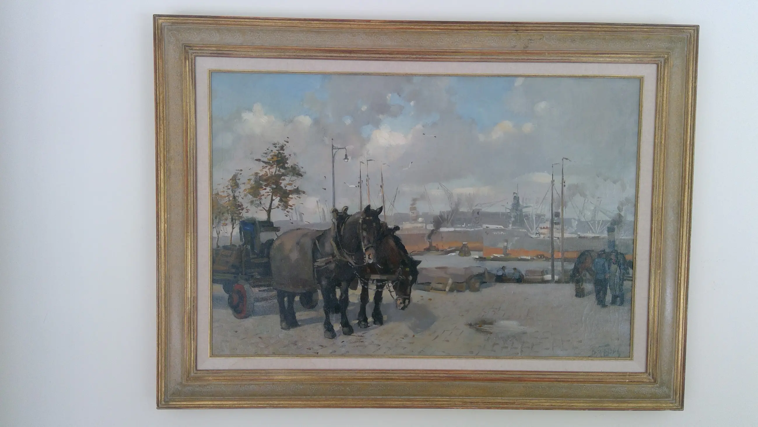 Een bijzonder fraai schilderij van de bedrijvigheid in de Rotterdamse haven bij de Boompjes. Mooie vlakverdeling met rechts en links paarden en tussendoor een doorkijk naar machtige stoomschepen. De plas water geeft aan de voorkant een extra accent.