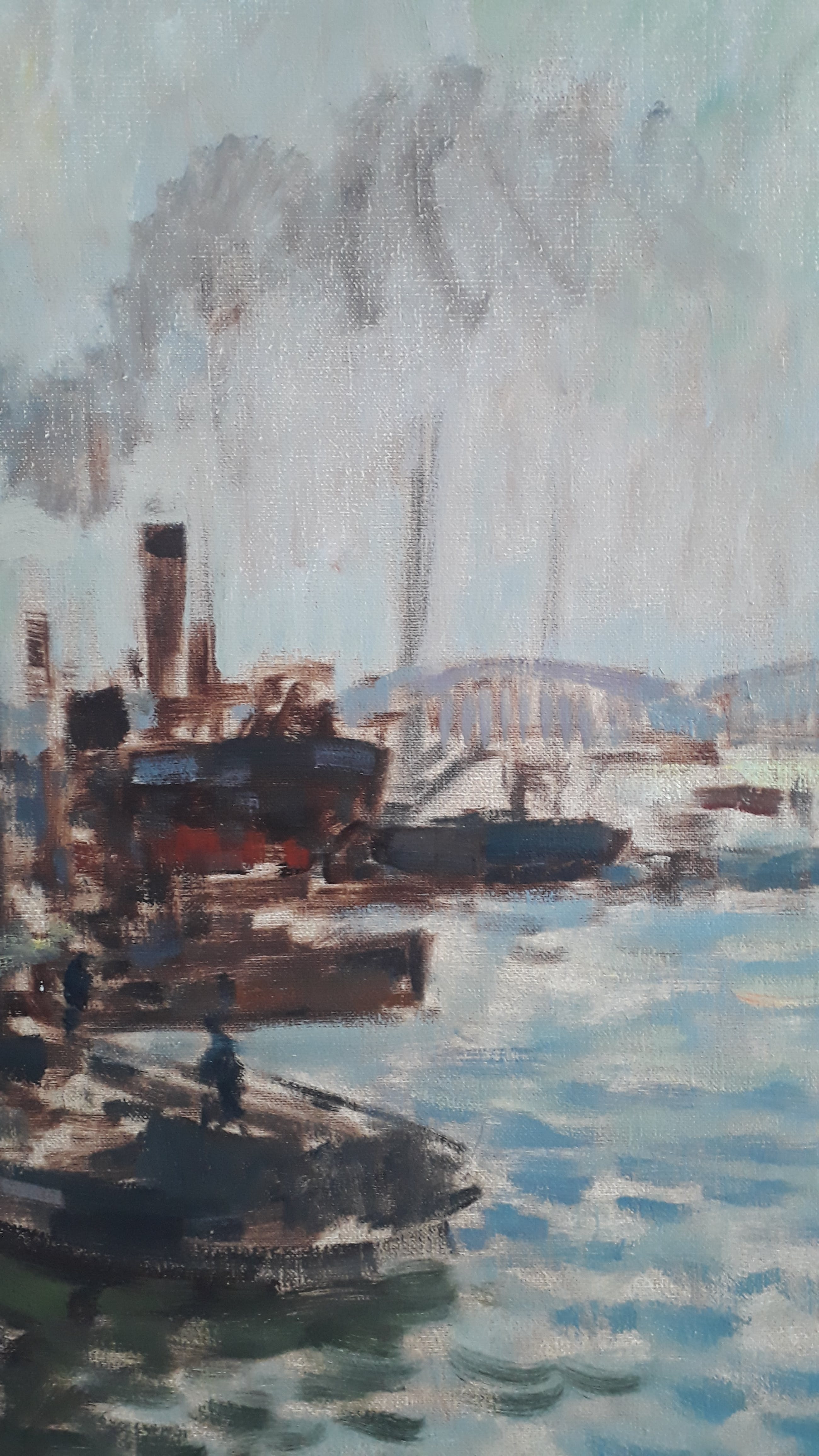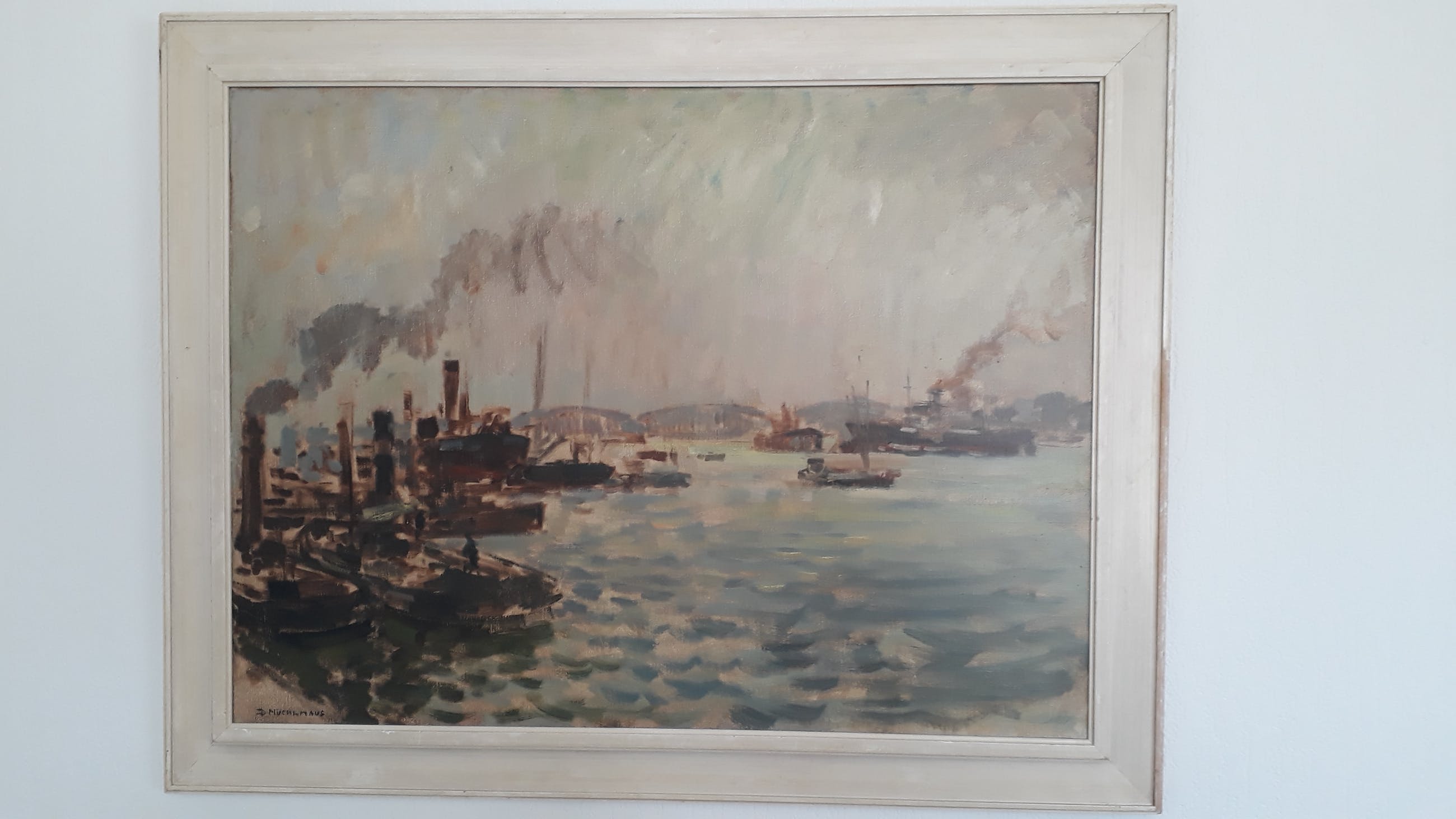Vlot geschilderd doek. Haven van Rotterdam was een geliefde plek van Muehlhaus. Hij signeerde zijn werk zowel met Muehlhaus als Mühlhaus. Omdat in de database van kunstveiling Muhlhaus staat heb ik dit aangehouden in de titel. Vanwege de grote van het werk, gaarne ophalen.