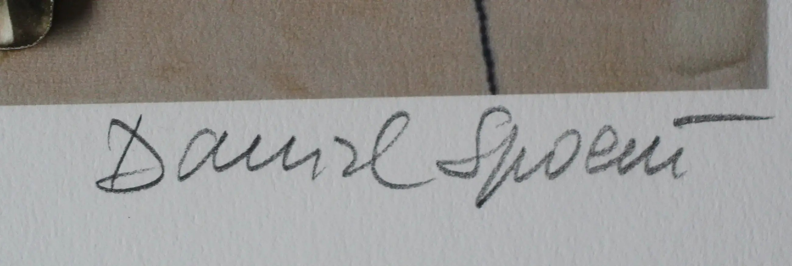 Prachtige 3 D zeefdruk van Daniel Spoerri. Alle atributen zitten ook daadwerkelijk op de zeefdruk "geplakt". Nummer: E.A. Jaar: 2014. Afmetingen voorstelling: H 44 x b100 cm. Afmetingen blad: H56,0 x b112,0 cm. Alle voorwerpen zijn in 3D in het werk verwerkt. Het werk is rechtsonder gesigneerd door de kunstenaar.