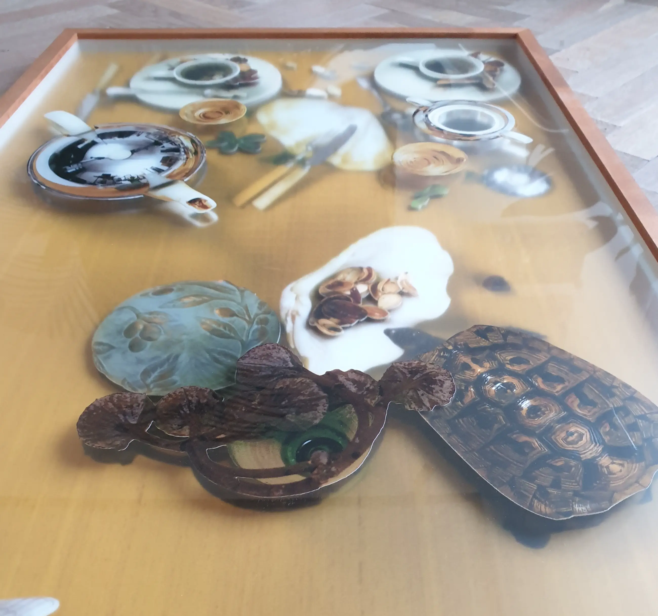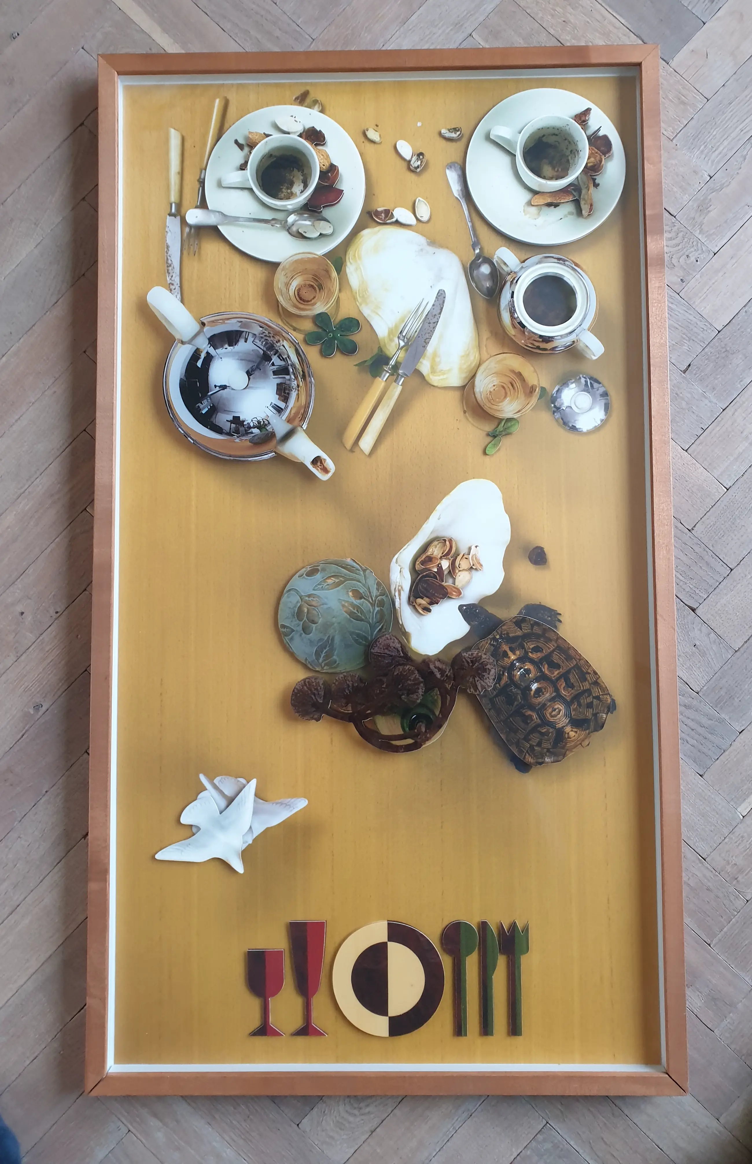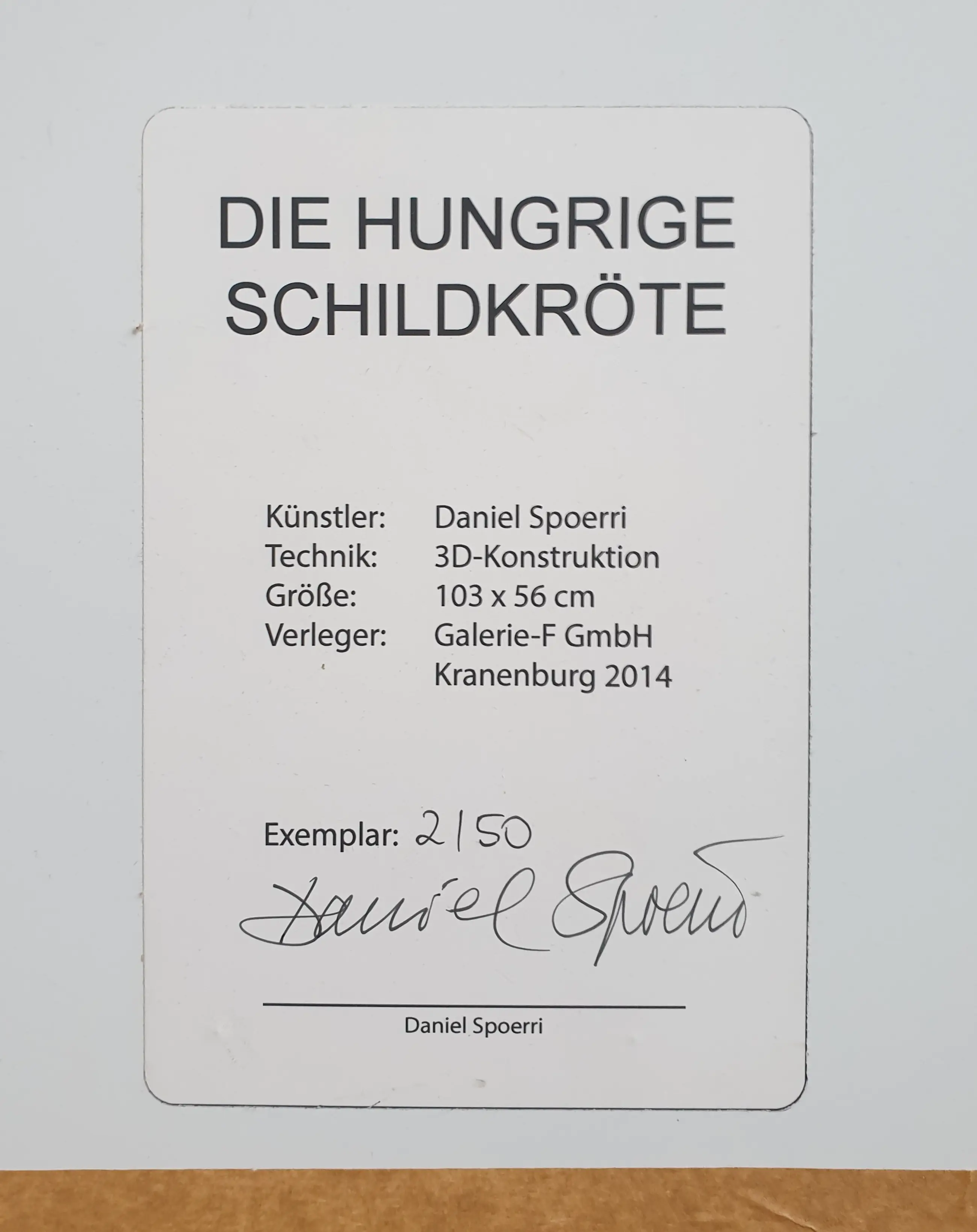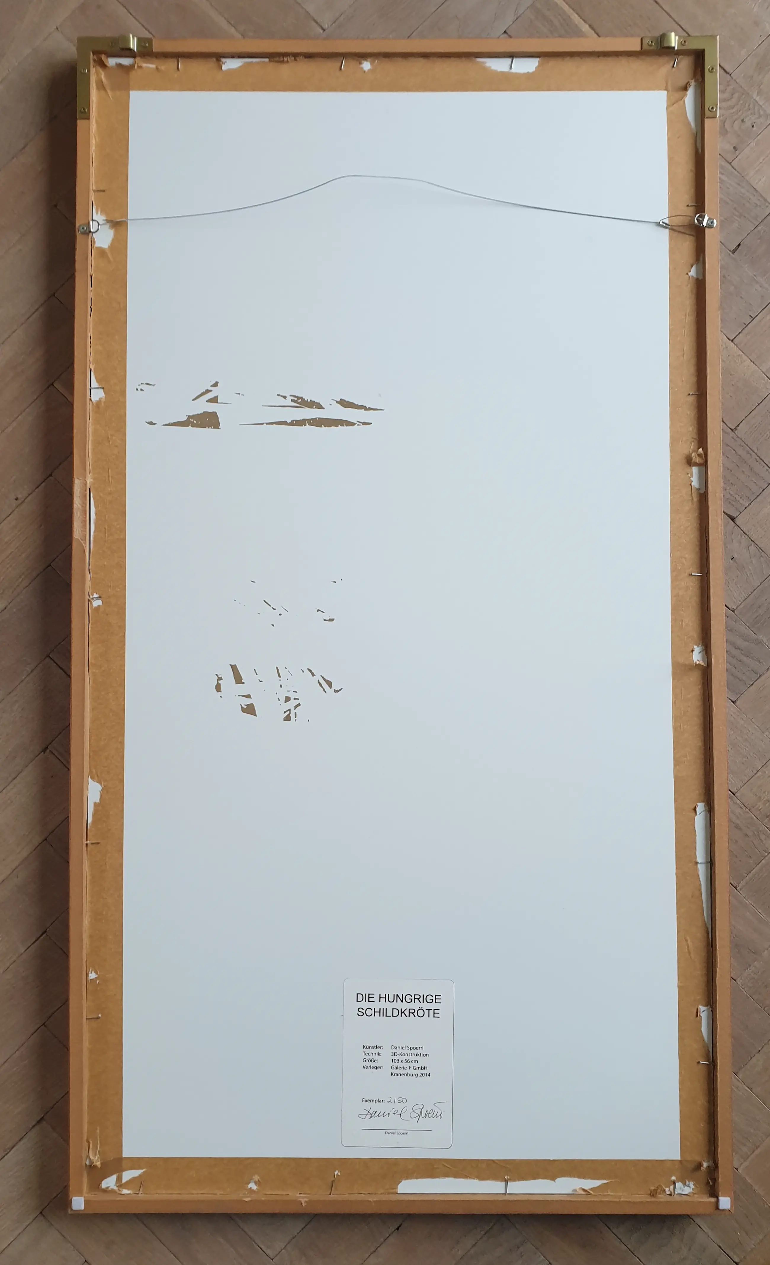 Zeefdruk op papier en Acrylglas van Daniel Spoerri (1930). Deze 3D constructie is ingelijst en gemaakt in 2014. Uitgave Galerie F te Duitsland. Formaat 106 x 59 x 4 cm. Het werk staat vermeld en afgebeeld in het boekje met alle multiples van Spoerri op bladzijde 15. Een kopie wordt bij geleverd. Het werk is gesigneerd en genummerd 2/50 op de achterzijde. De lijst moet aan de onderzijde wat beter vastgezet worden. Dat is een kleinigheid voor een lijstenmaker. wordt aangetekend verstuurd. Afhalen heeft de voorkeur i.v.m grootte.