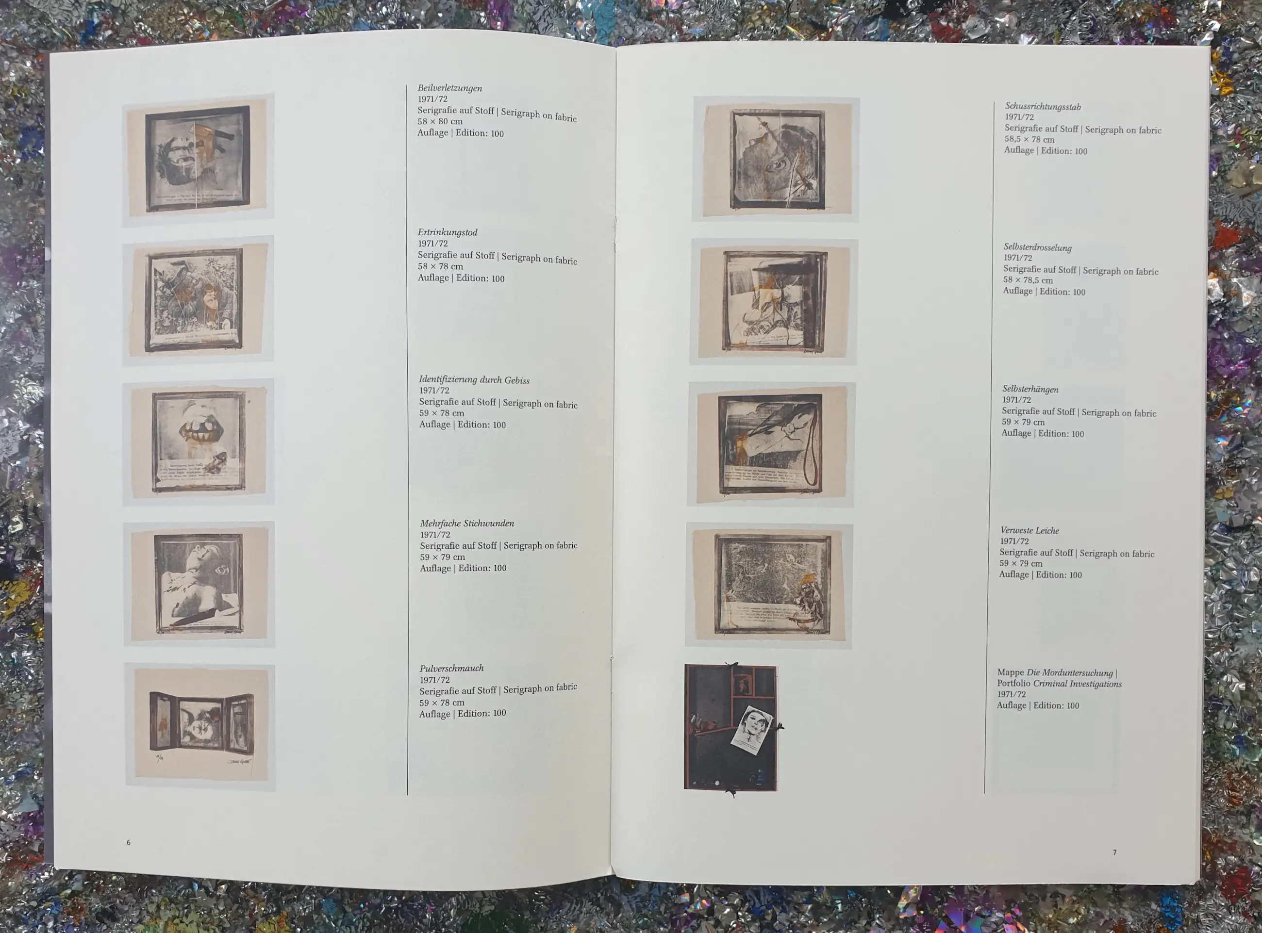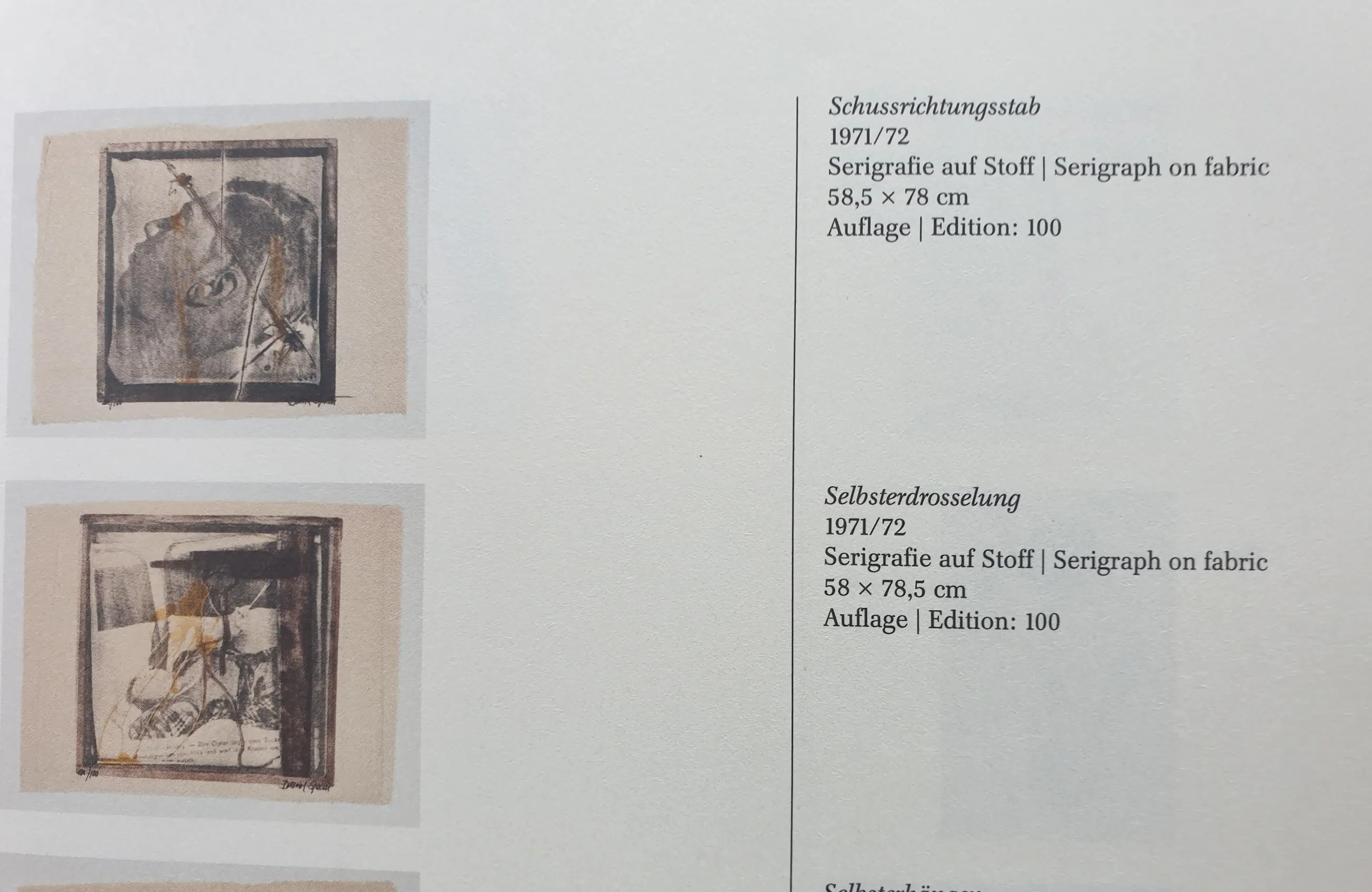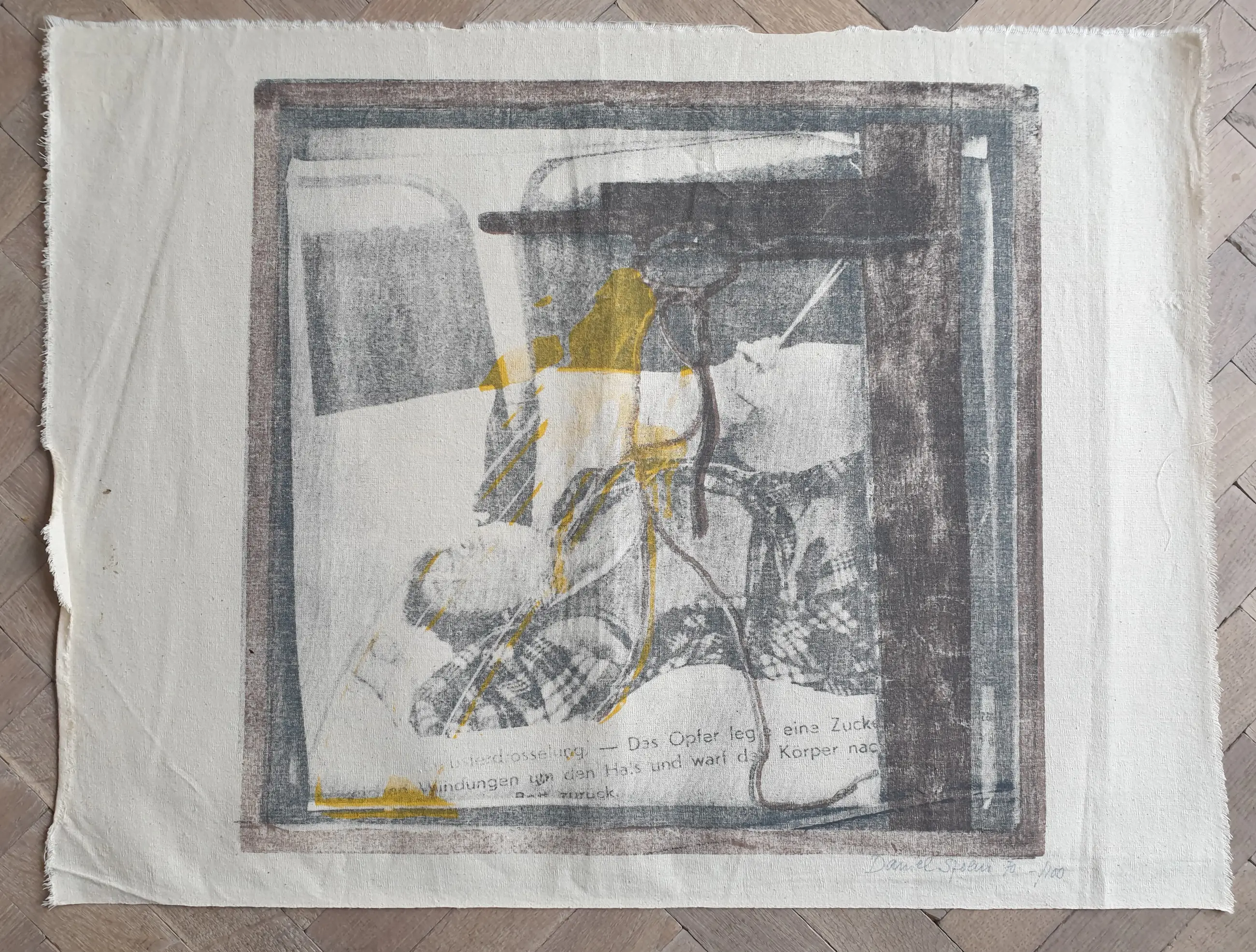 Zeefdruk op textiel (kaasdoek) van Daniel Spoerri uit 1970. Dit werk in een oplage van 100 heeft als formaat 59 x 78 cm. Het is ingelijst in een aluminium lijst van 60 x 60 cm. Het werk komt uit de map "Die Morduntersuchung" en is getiteld "Selbsterdrosselung". Het werk staat afgebeeld in de catalogus met alle "multiples". U krijgt daarvan een kopie. Wordt aangetekend verstuurd. Afhalen of brengen heeft de voorkeur.