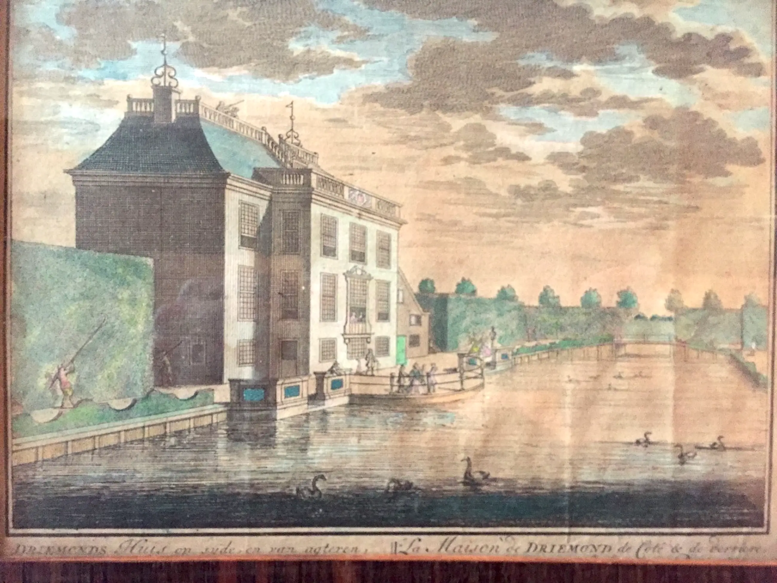 A3 29 Daniël Stoopendaal of Daniël Stopendaal "DRIEMONDS Huis op syde, en van agteren, langs de Kom te sien." te Weesp Gravure ingekleurd 1719 19 x 25 cm Kopergravure met tweetalig onderschrift. Uitgegeven in: "De Zegepralende Vecht", 1719. Graveur: Daniël Stoopendaal.