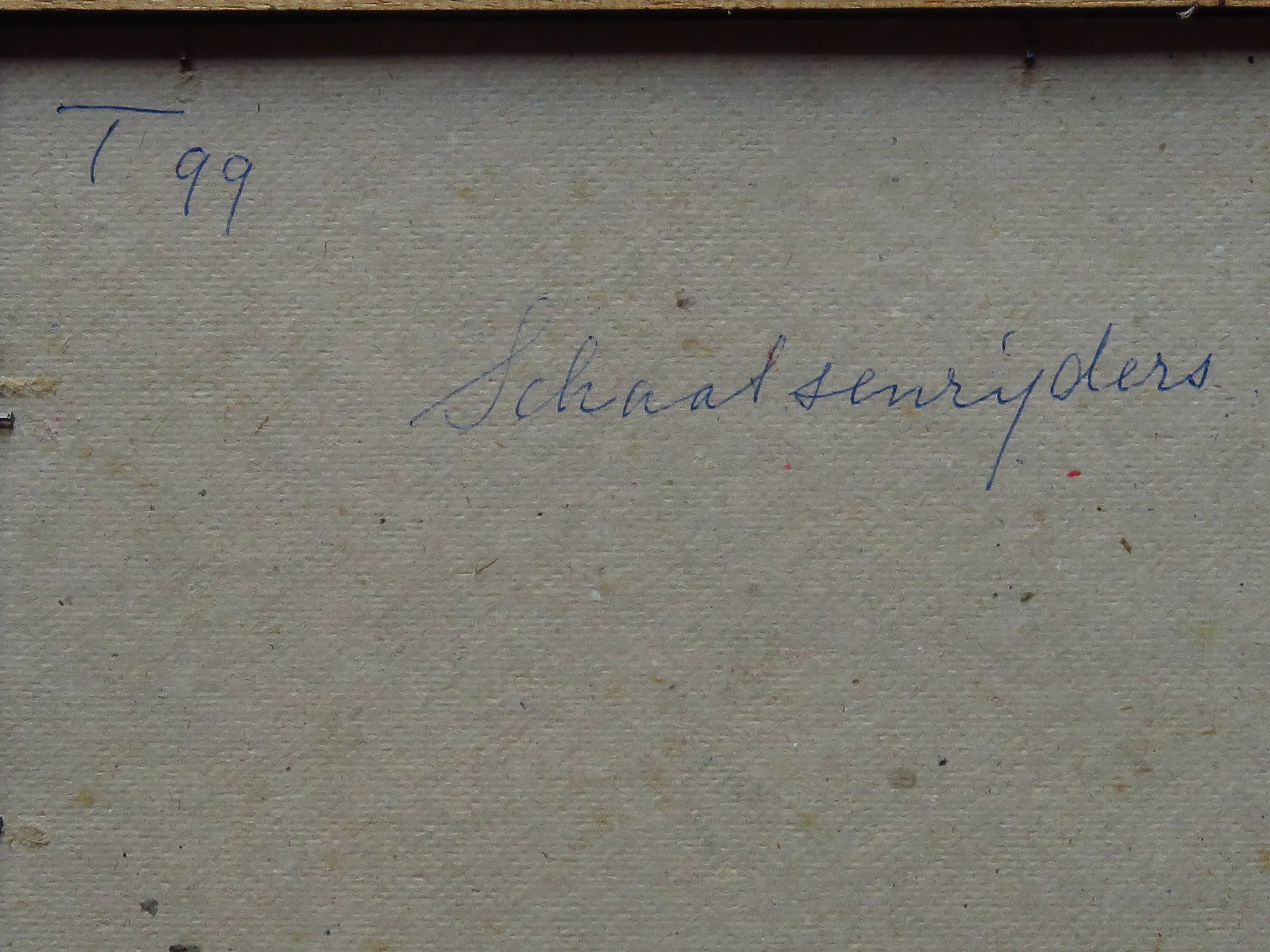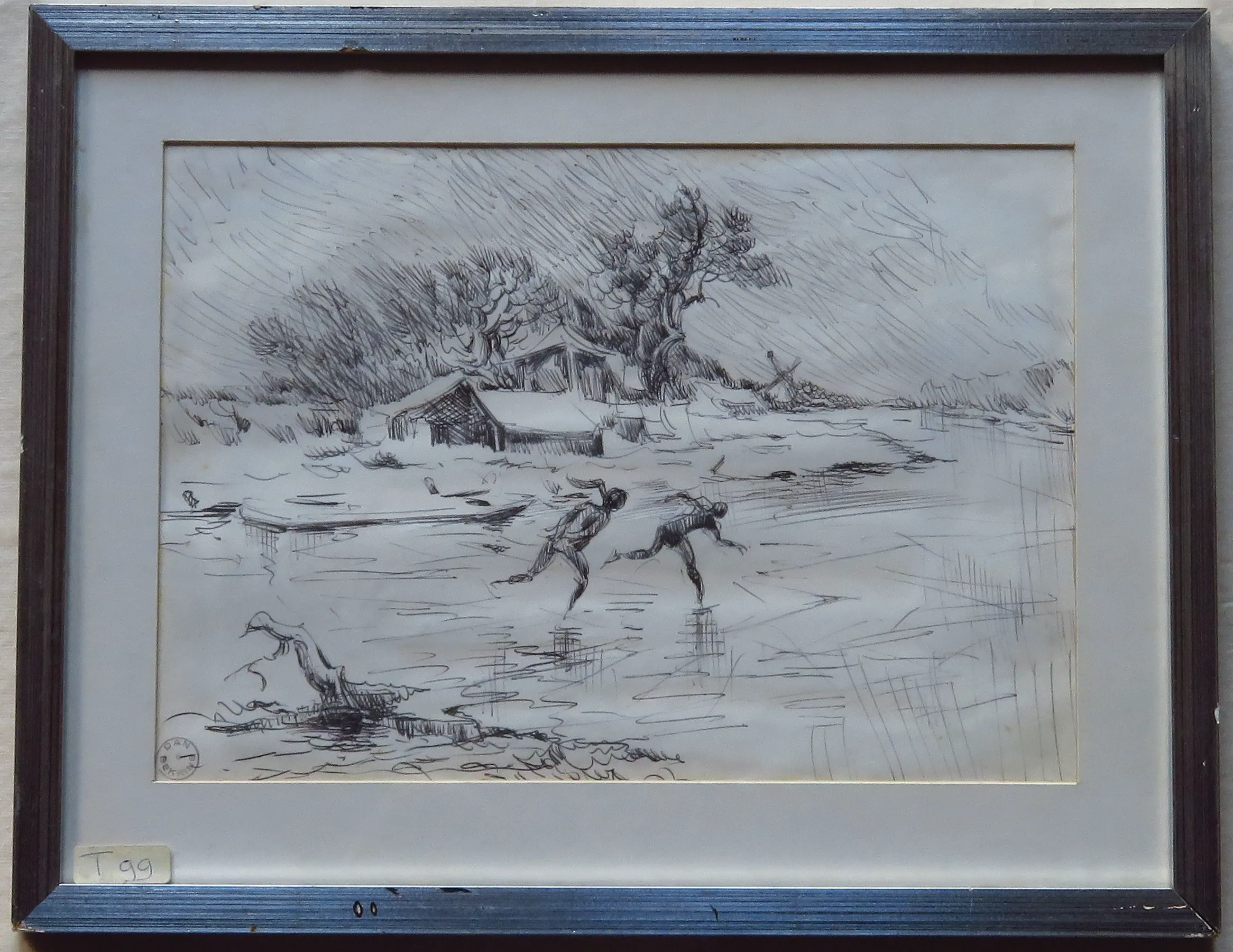 Gesigneerd: met stempel op voor- en achterzijde ( de titel is wel door de kunstenaar geschreven) Titel: Schaatsenrijders Nummer: T99 (op sticker op het glas en op de achterkant)