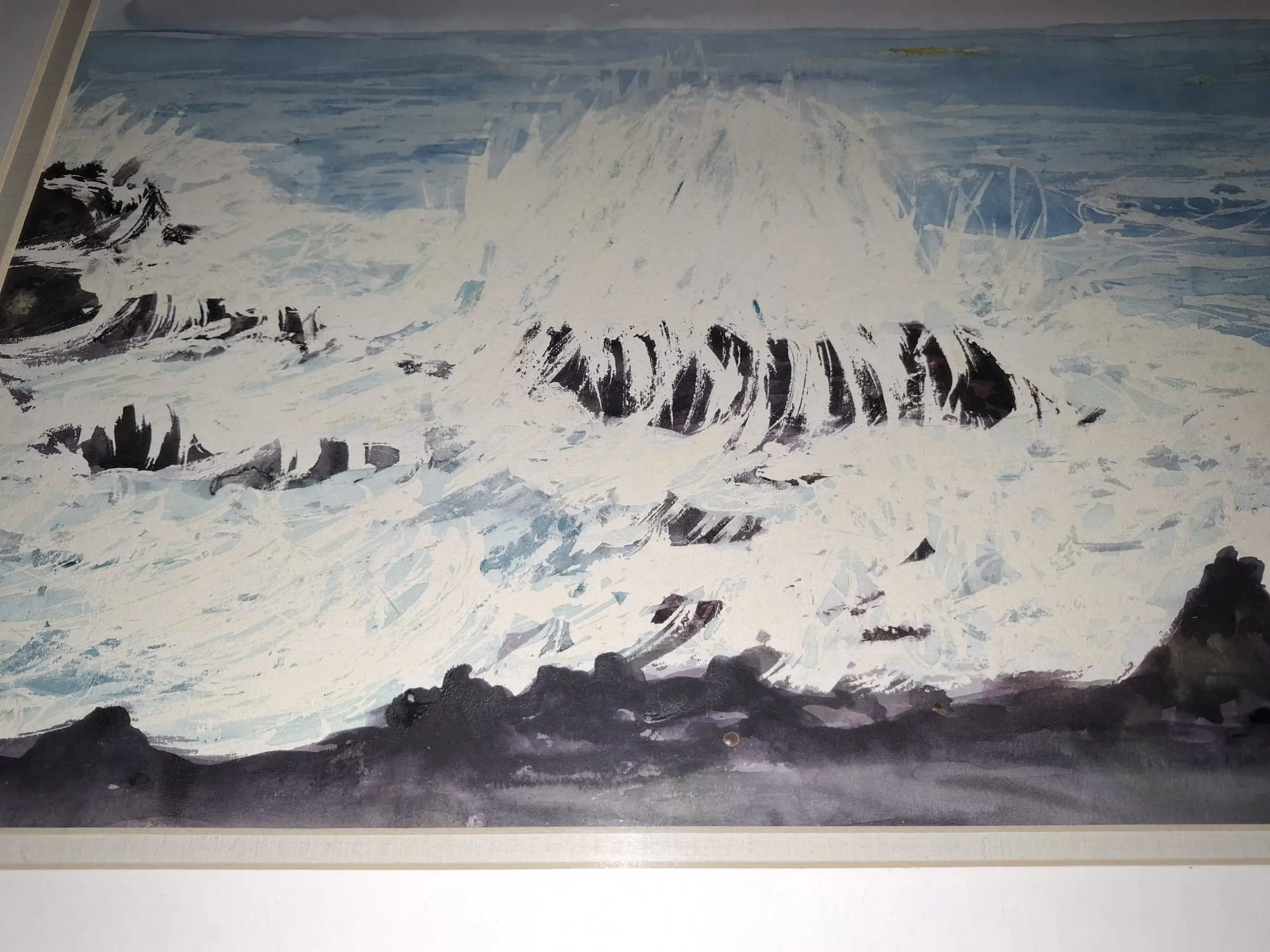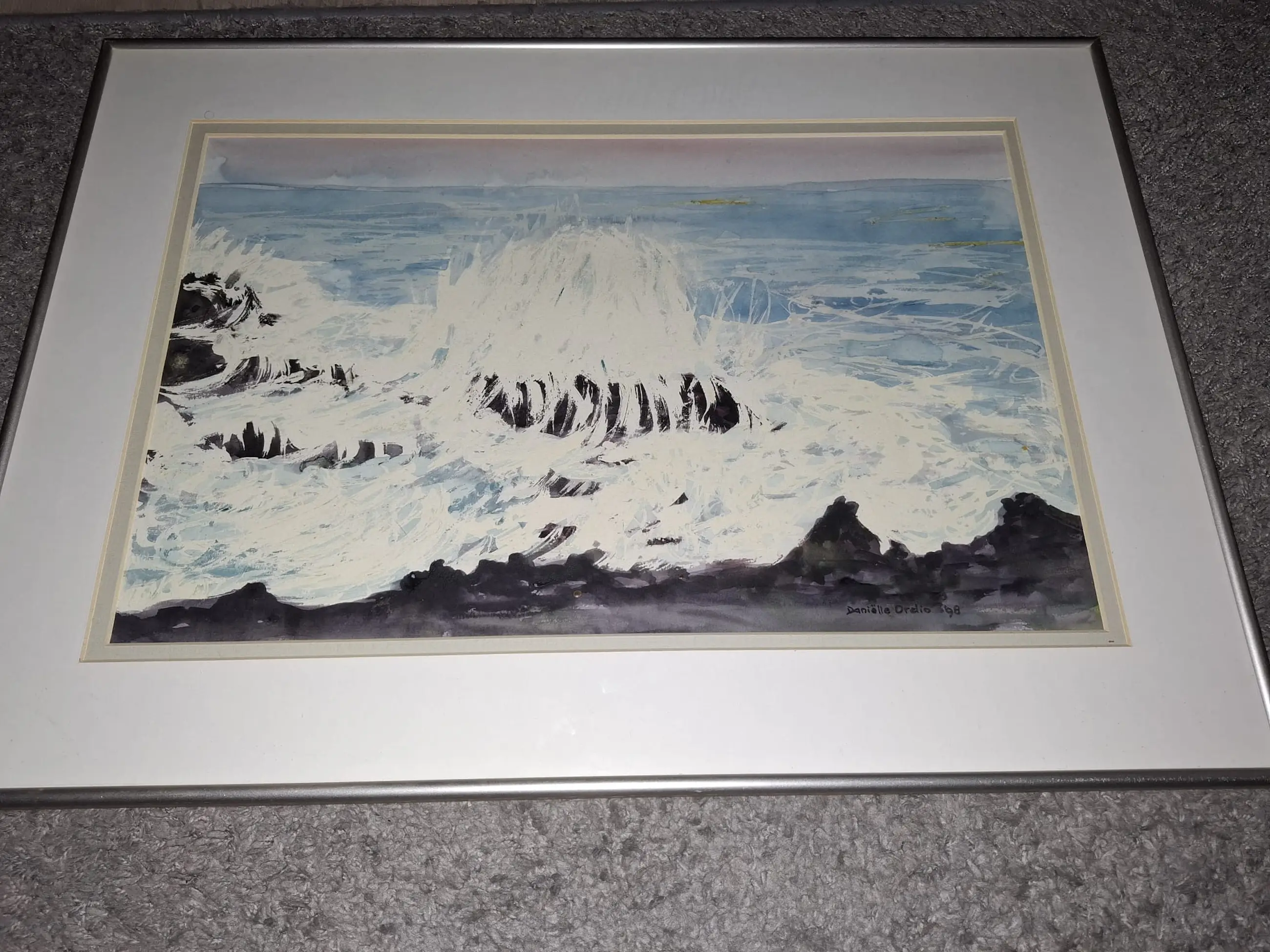 Adembenemend aquarel schilderij van machtige witte golven die tegen zwarte rotsen beuken. De impressionistische stijl vangt de wilde energie van de oceaan met vloeiende verfstromen, subtiele lichtreflecties en dynamisch schuim. Danielle Orelio - 1998
