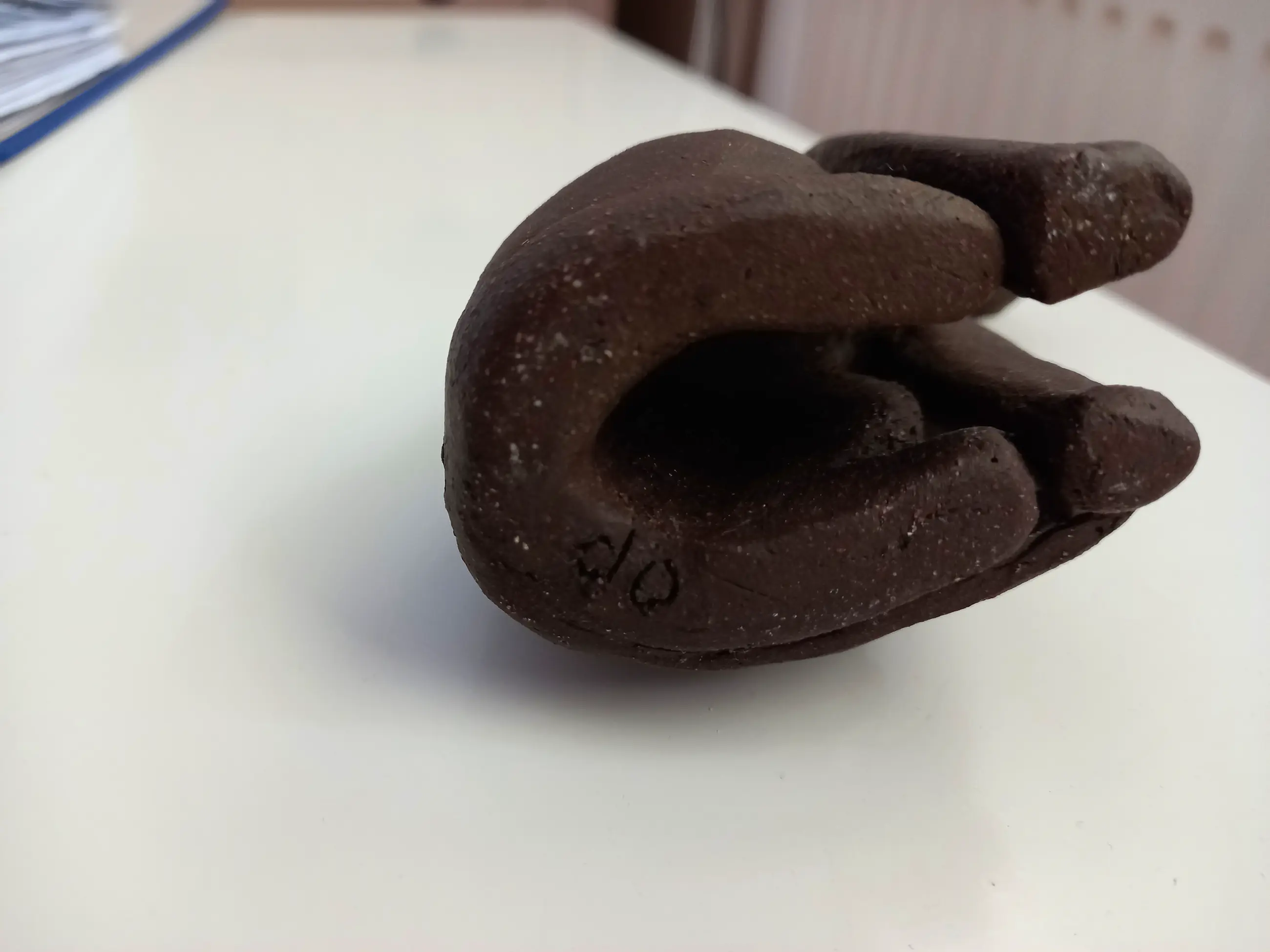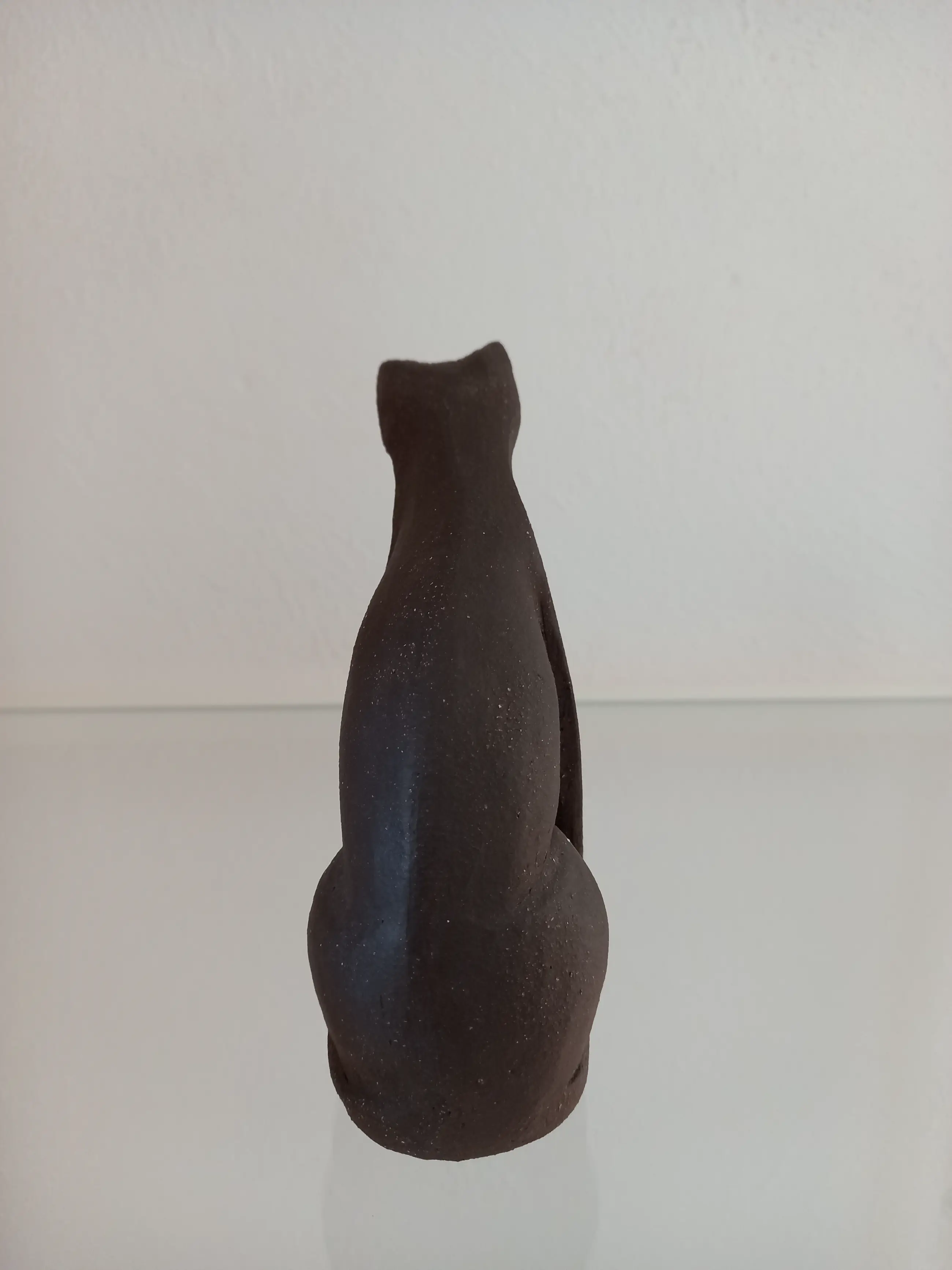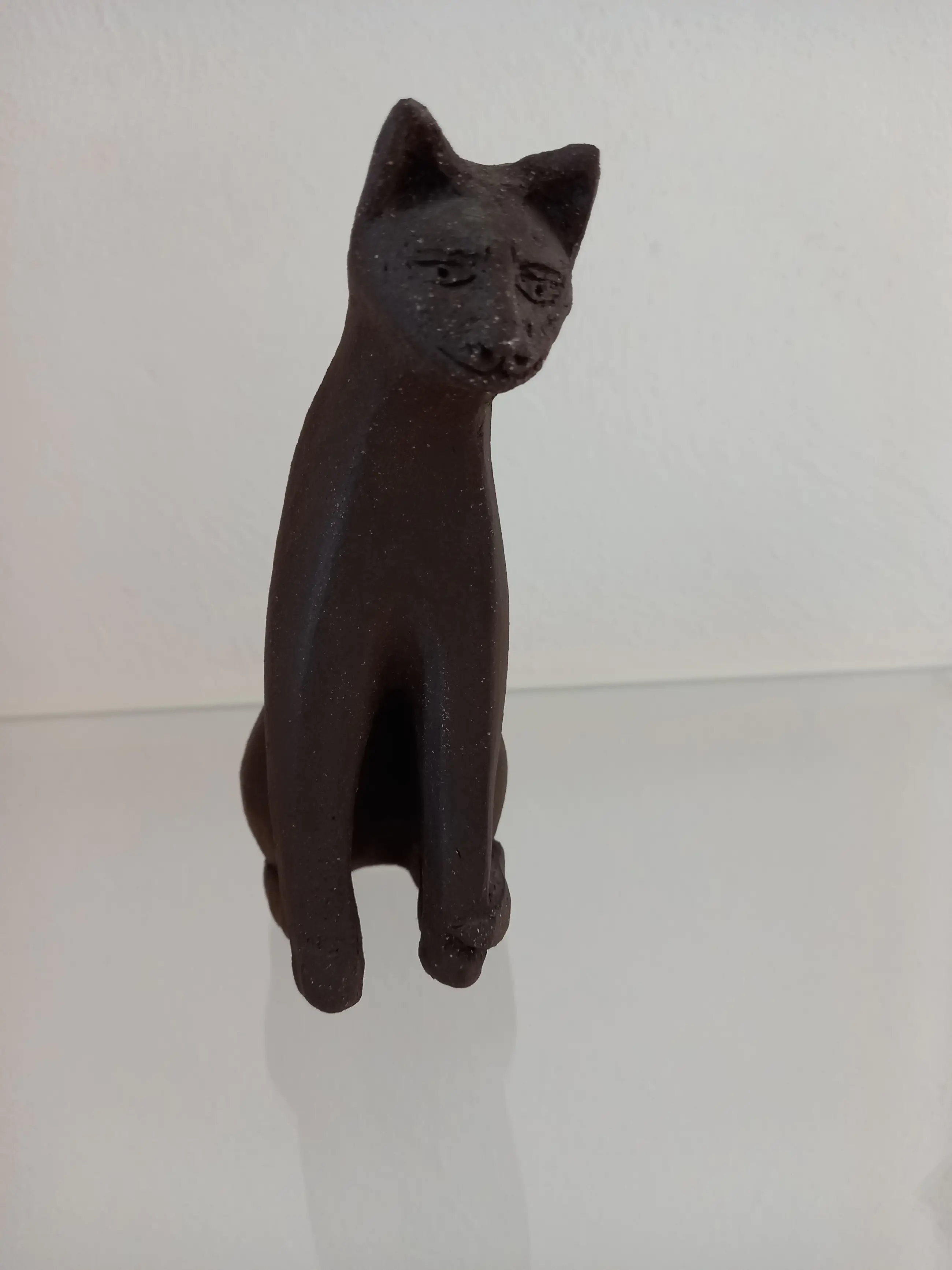 Het beeldje van de zittende poes is is in 1990 aangeschaft door mijn schoonouders. Het beeldje is gemaakt van klei met mangaan en heeft een heel donkerbruine, bijna zwarte kleur, afhankelijk van de lichtinval. Op de liggende foto kunt u de signatuur van de kunstenares zien.