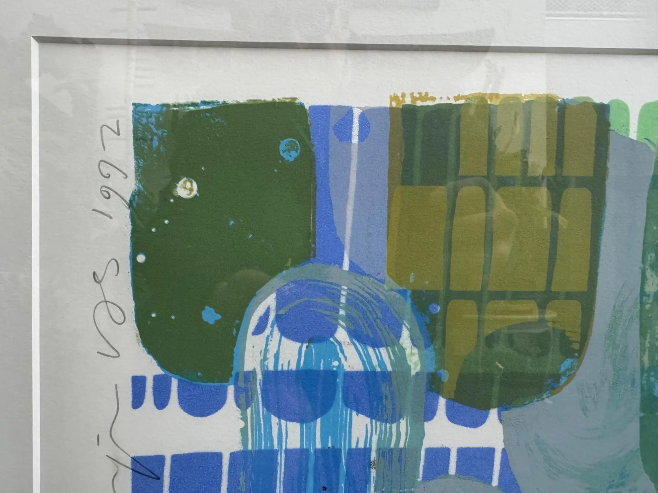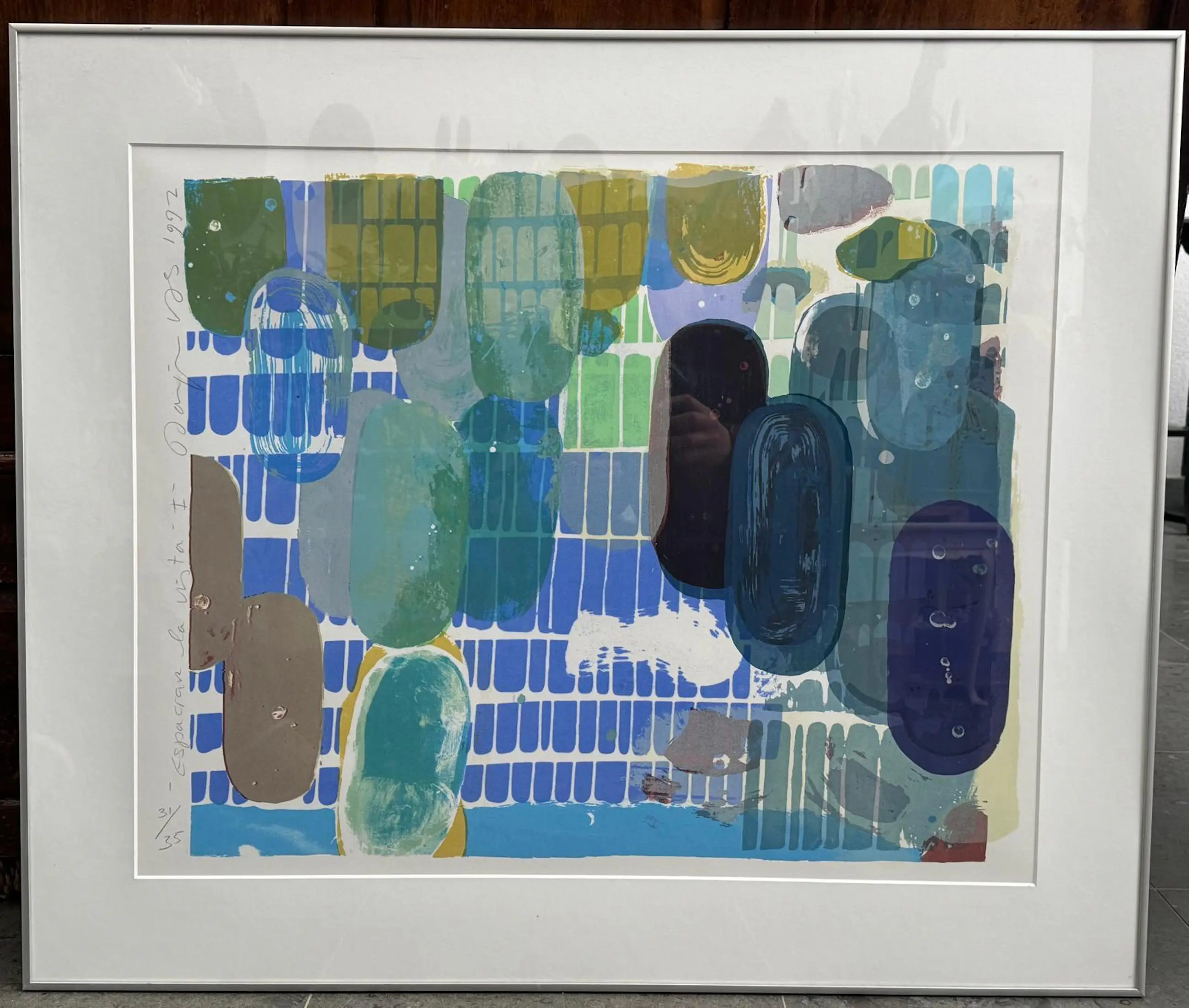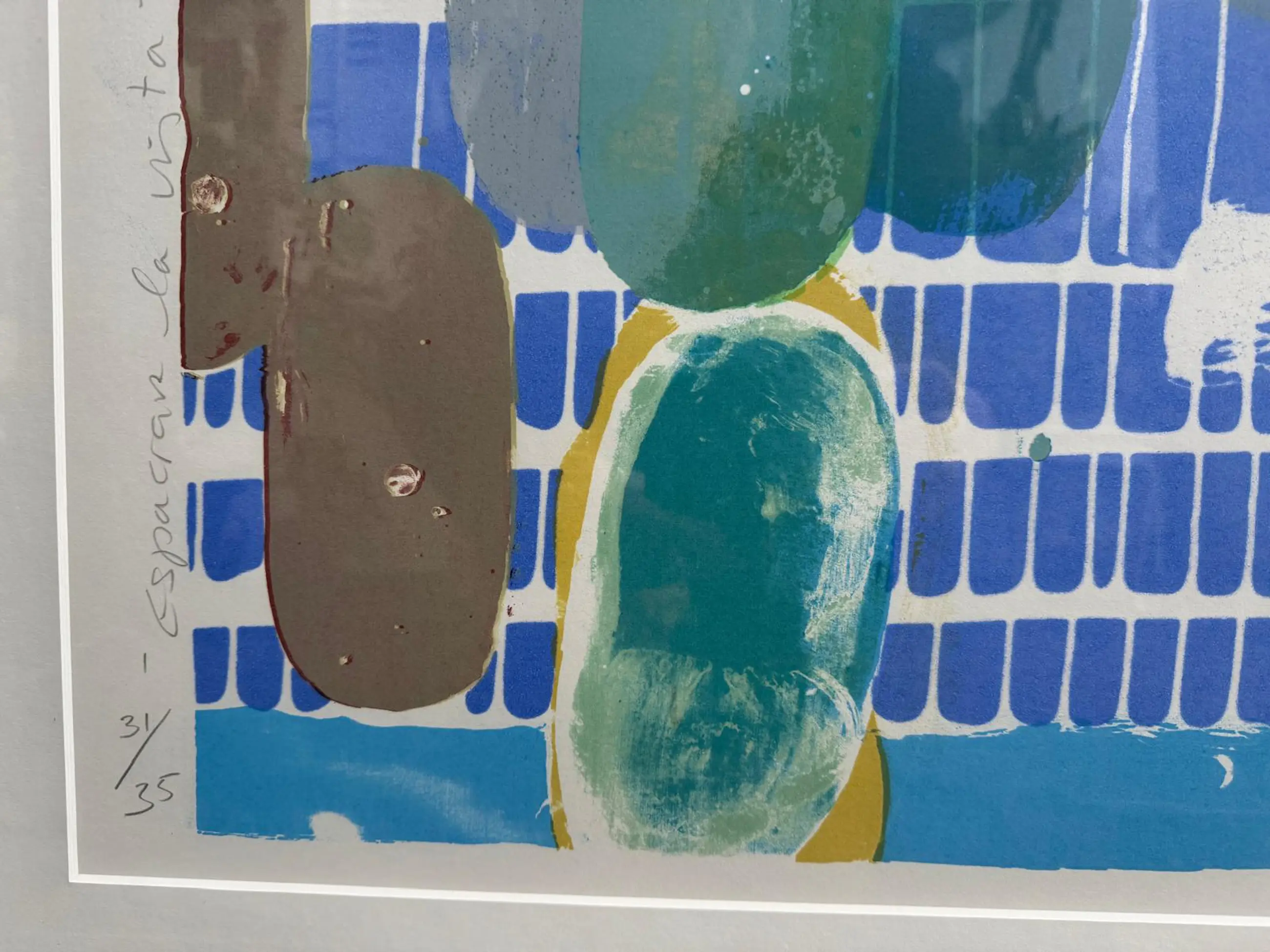 Het landschap is vertaald naar lyrisch abstractisme. Van enkele gouaches uit haar Spaanse periode heeft Darja zeefdrukken van gemaakt. Daar is deze een van. Deze zeefdruk is in perfecte staat, met passe-partout en een aluminium strakke lijst.