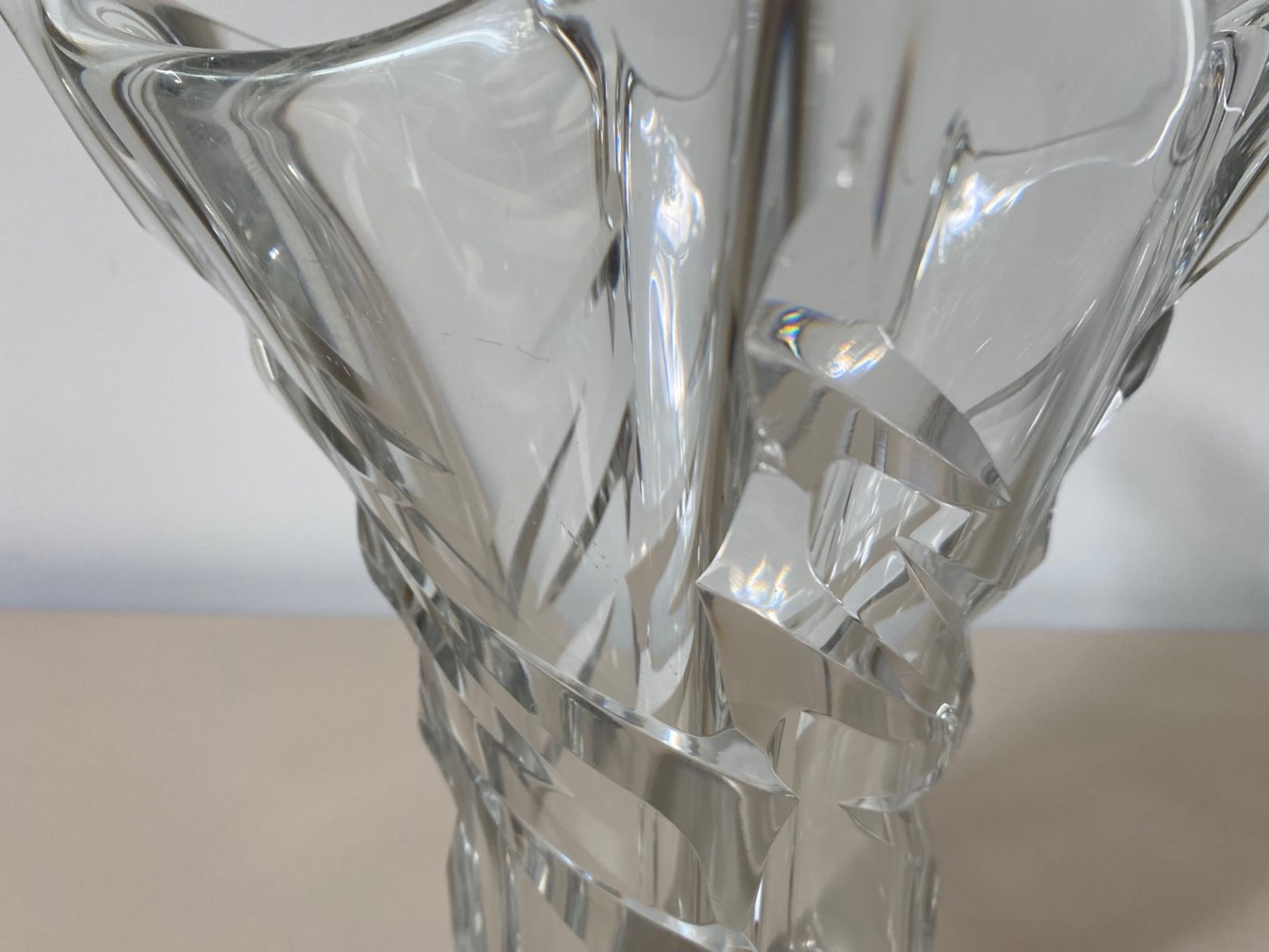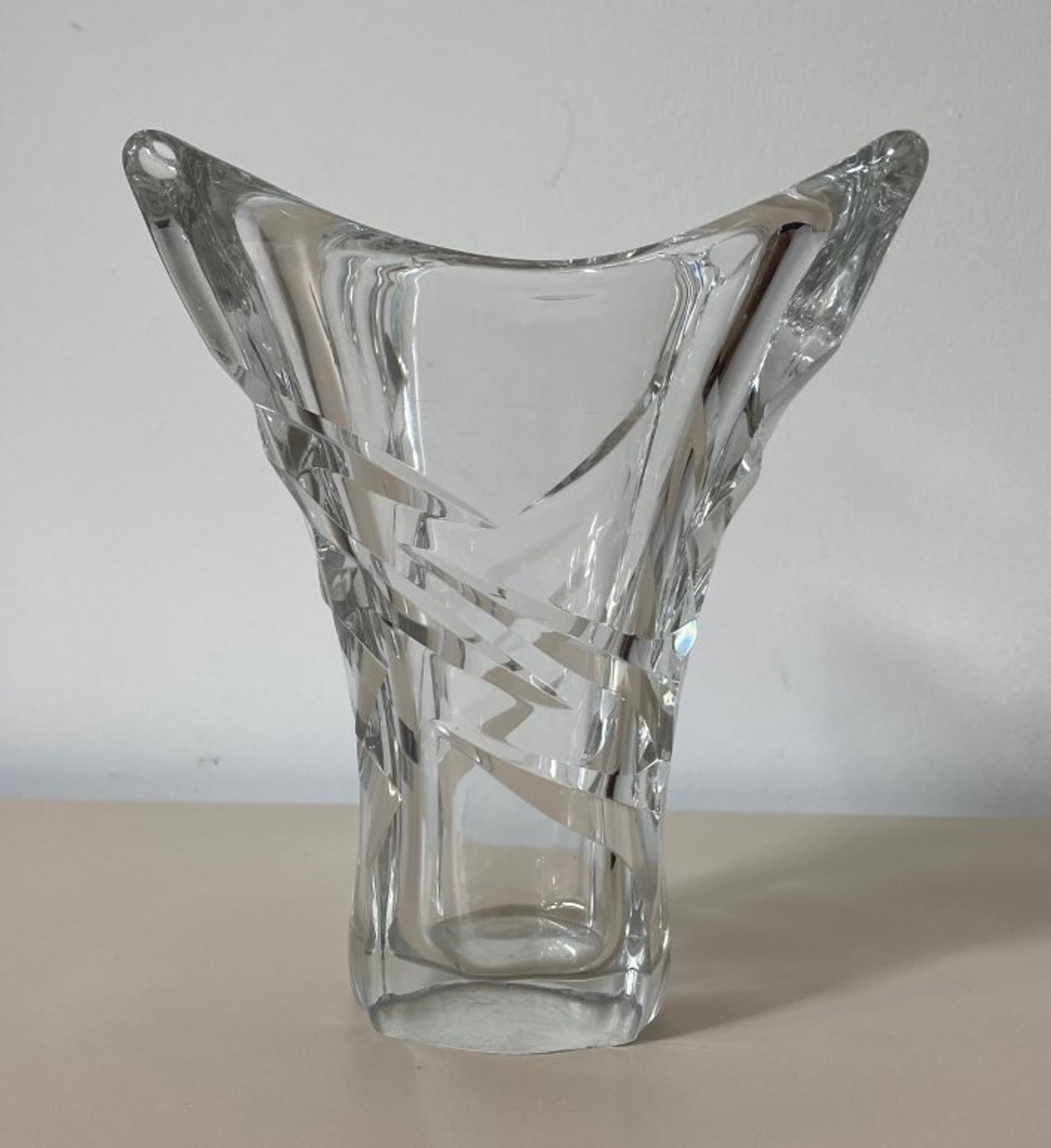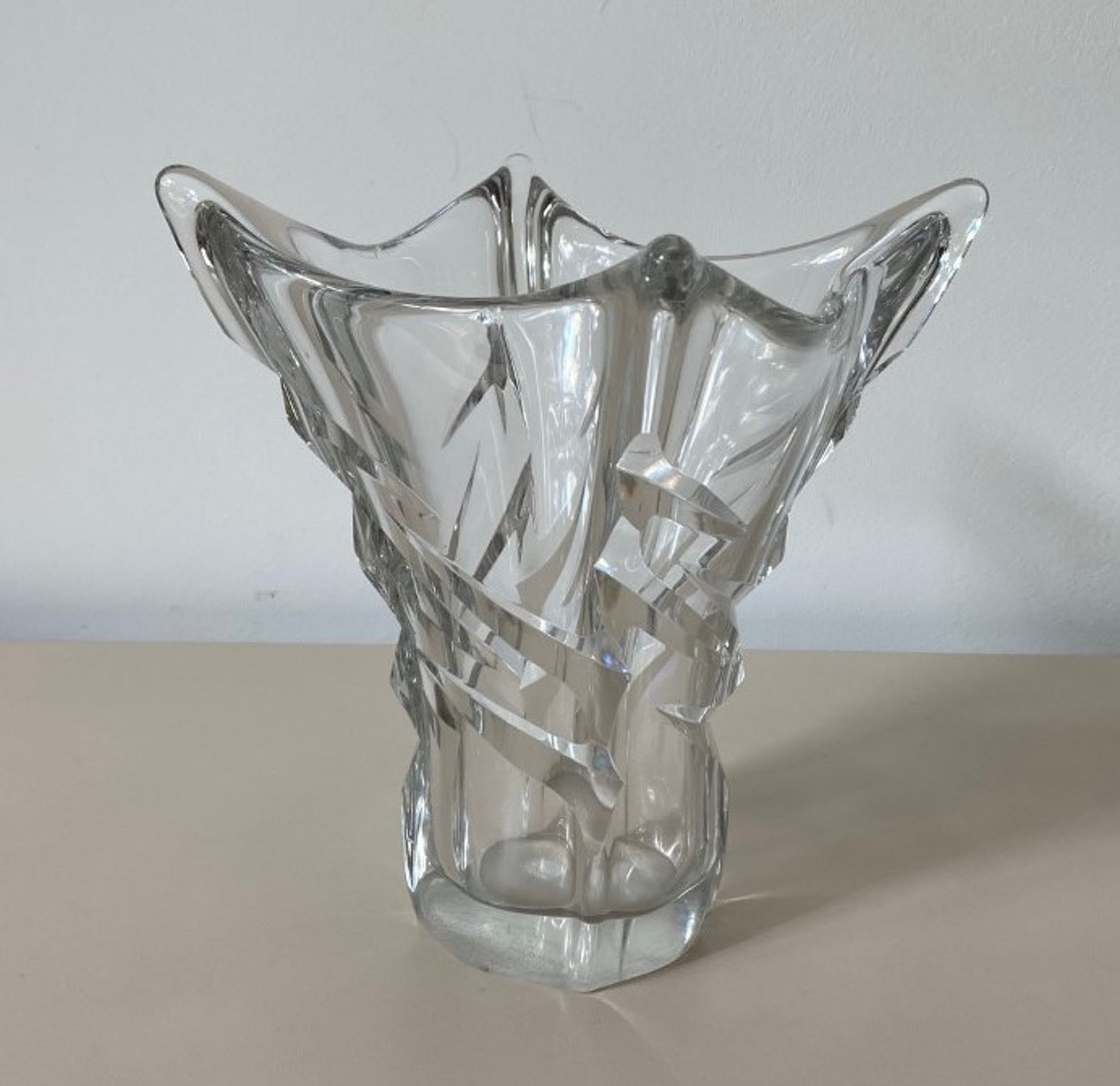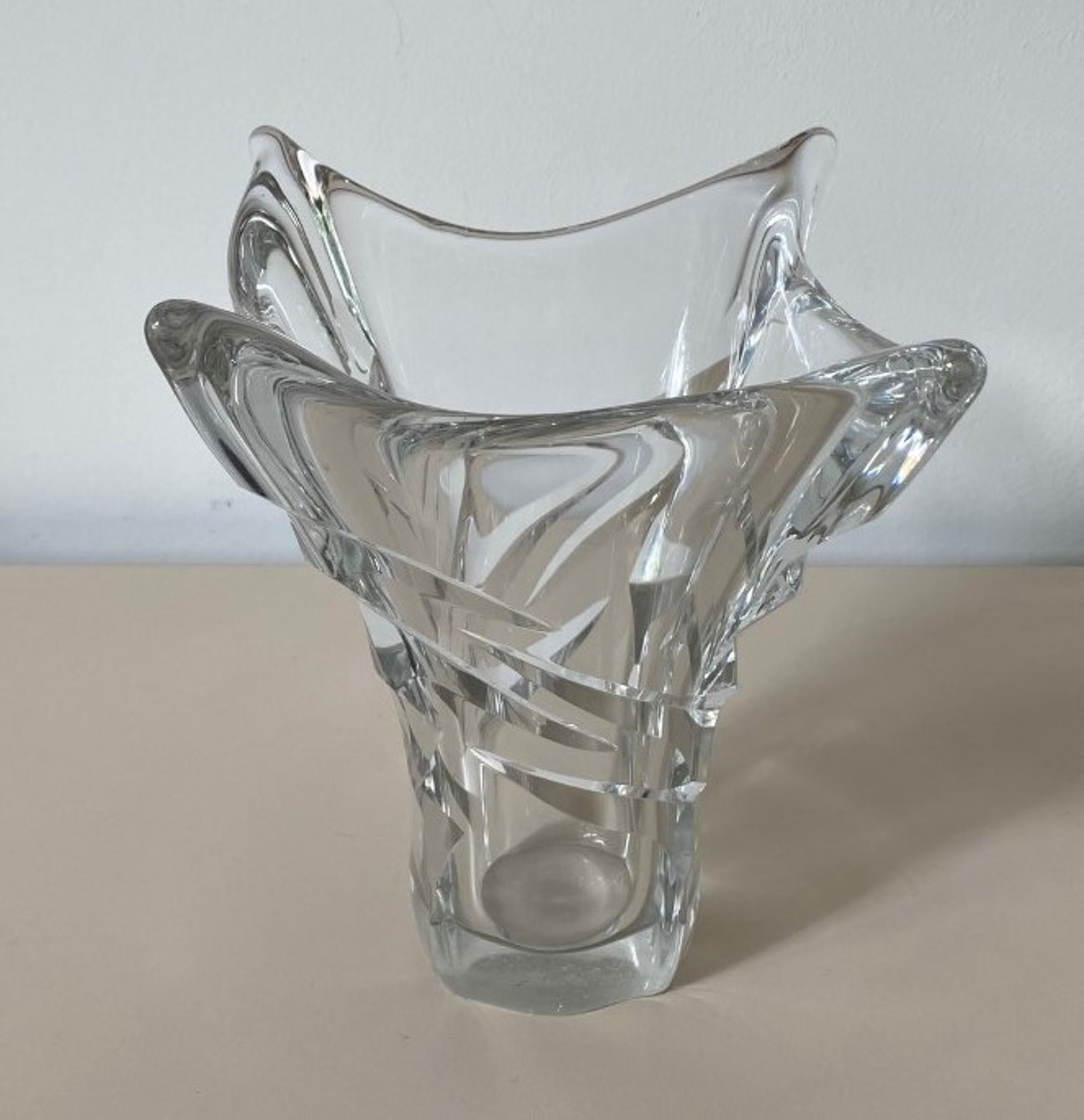 Kristallen facet geslepen vierkante vaas handgemaakt bij Daum uit Nancy in Frankrijk. In goede gebruikte conditie en aan de voorzijde met diamantpen gesigneerd.