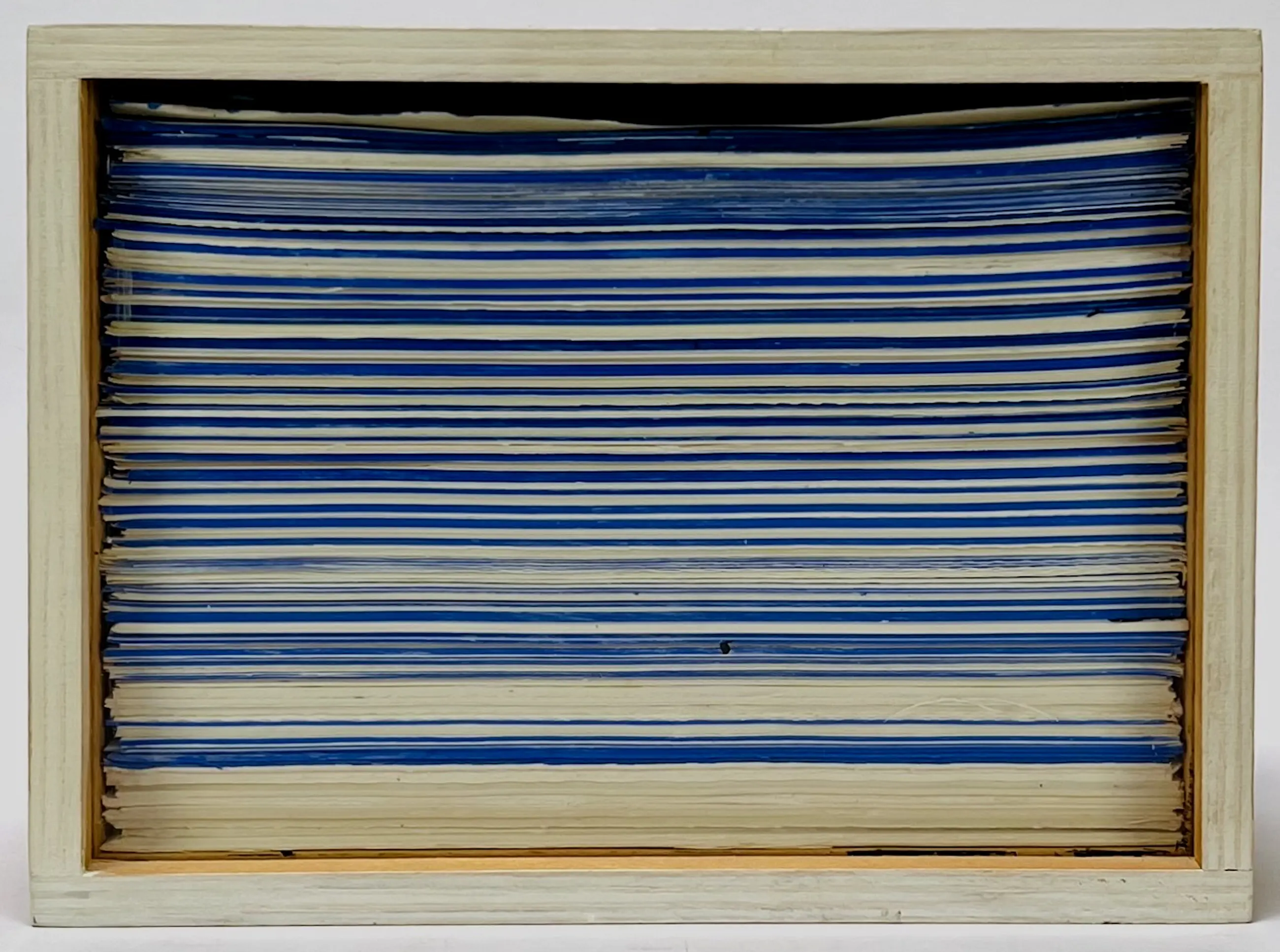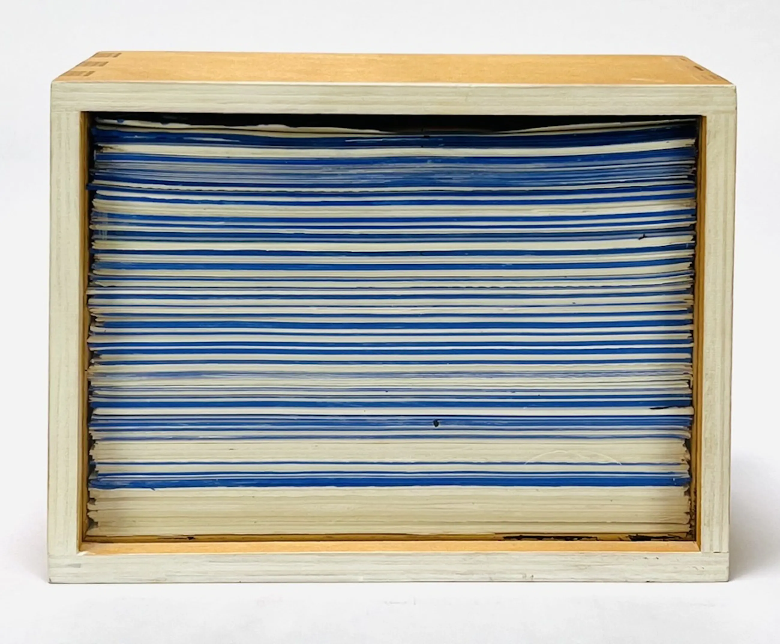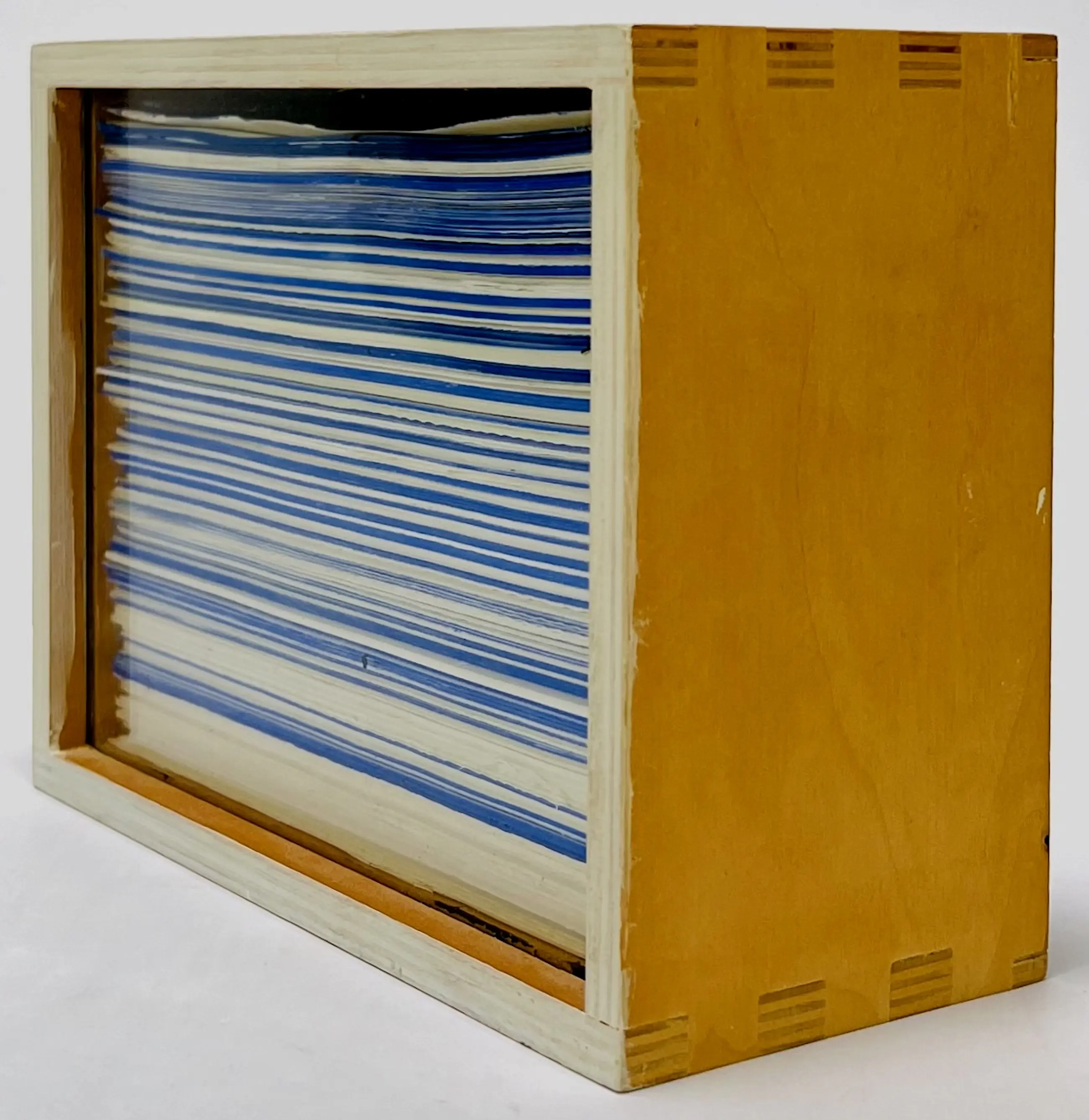 Kunstobject in de vorm van een houten kistje gevuld met wit en blauw papier achter glas door Dave Meijer (1955). Jaar: 2004. Afmetingen object: H14 x b19 x b7.5cm. Het object is, achterop, gesigneerd en gedateerd ('2004) door de kunstenaar. De authenticiteit van het aangeboden werk wordt volledig gegarandeerd. Een certificaat van echtheid kan, op aanvraag, worden gemaild.