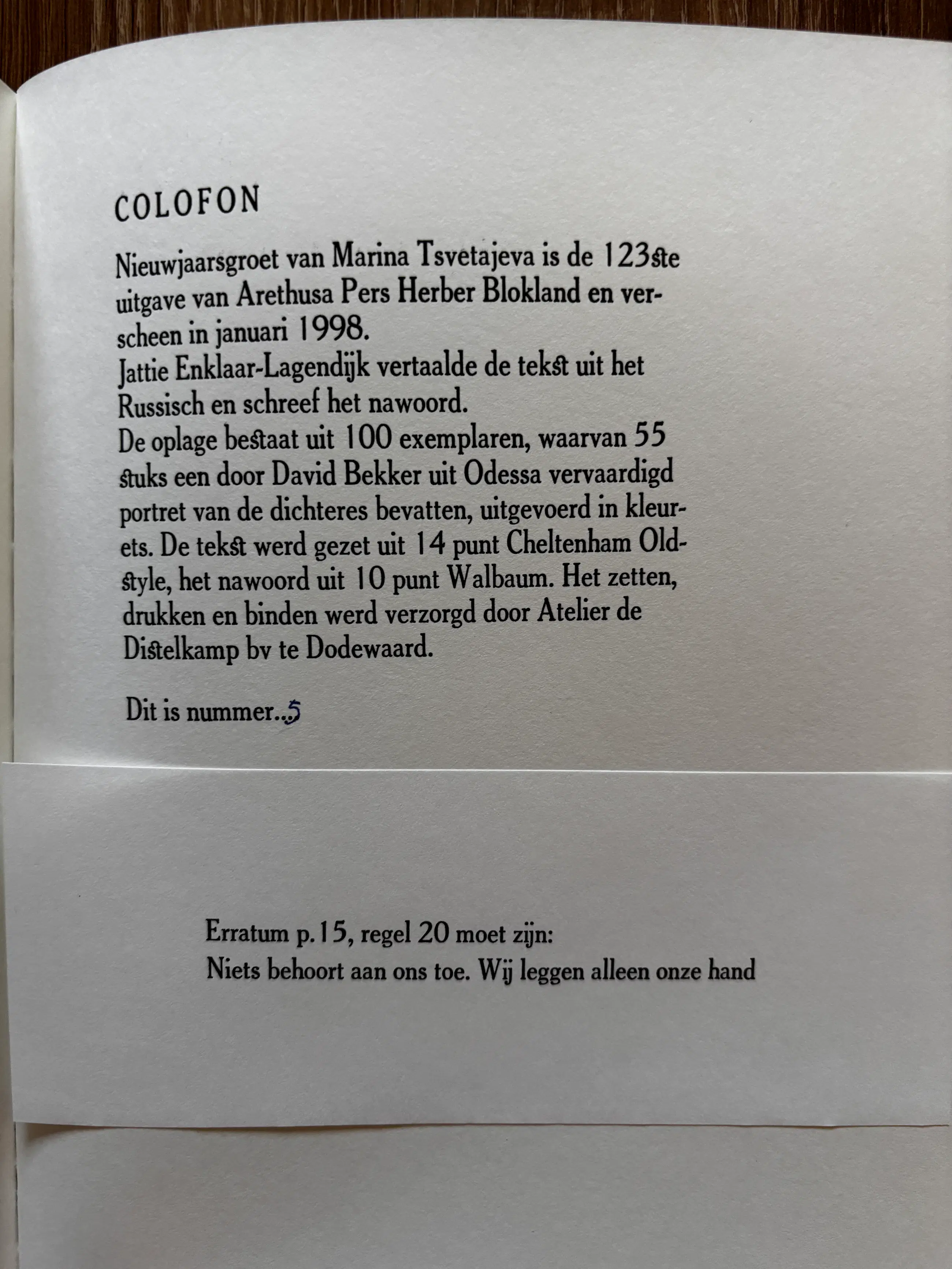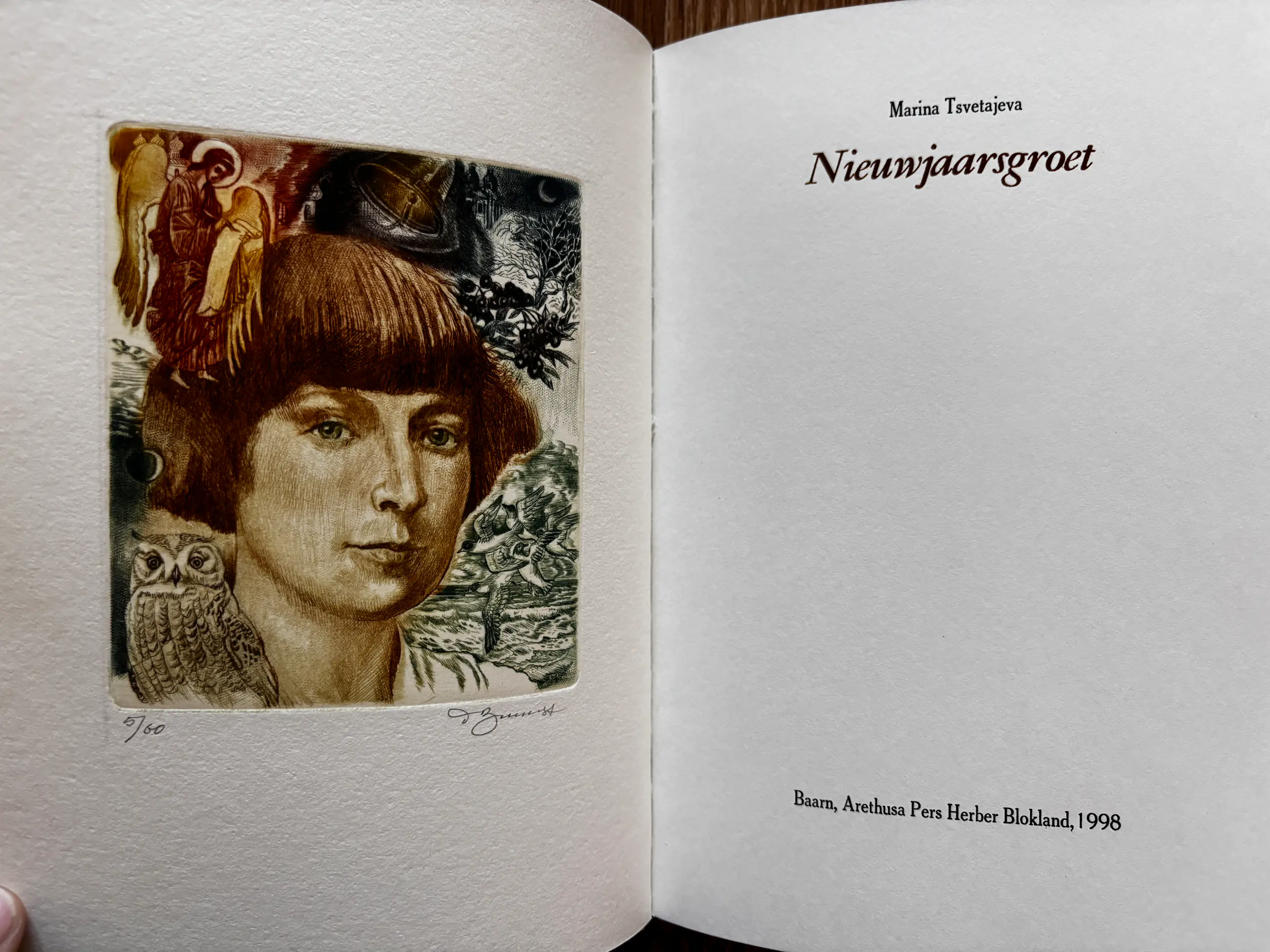 Marina Tsvetajeva - Nieuwjaarsgroetboek met originele ets van David Bekker. Afbeeldingsformaat 12,5 x 11 cm, handgesigneerd. Boekformaat 25 x 18 cm.