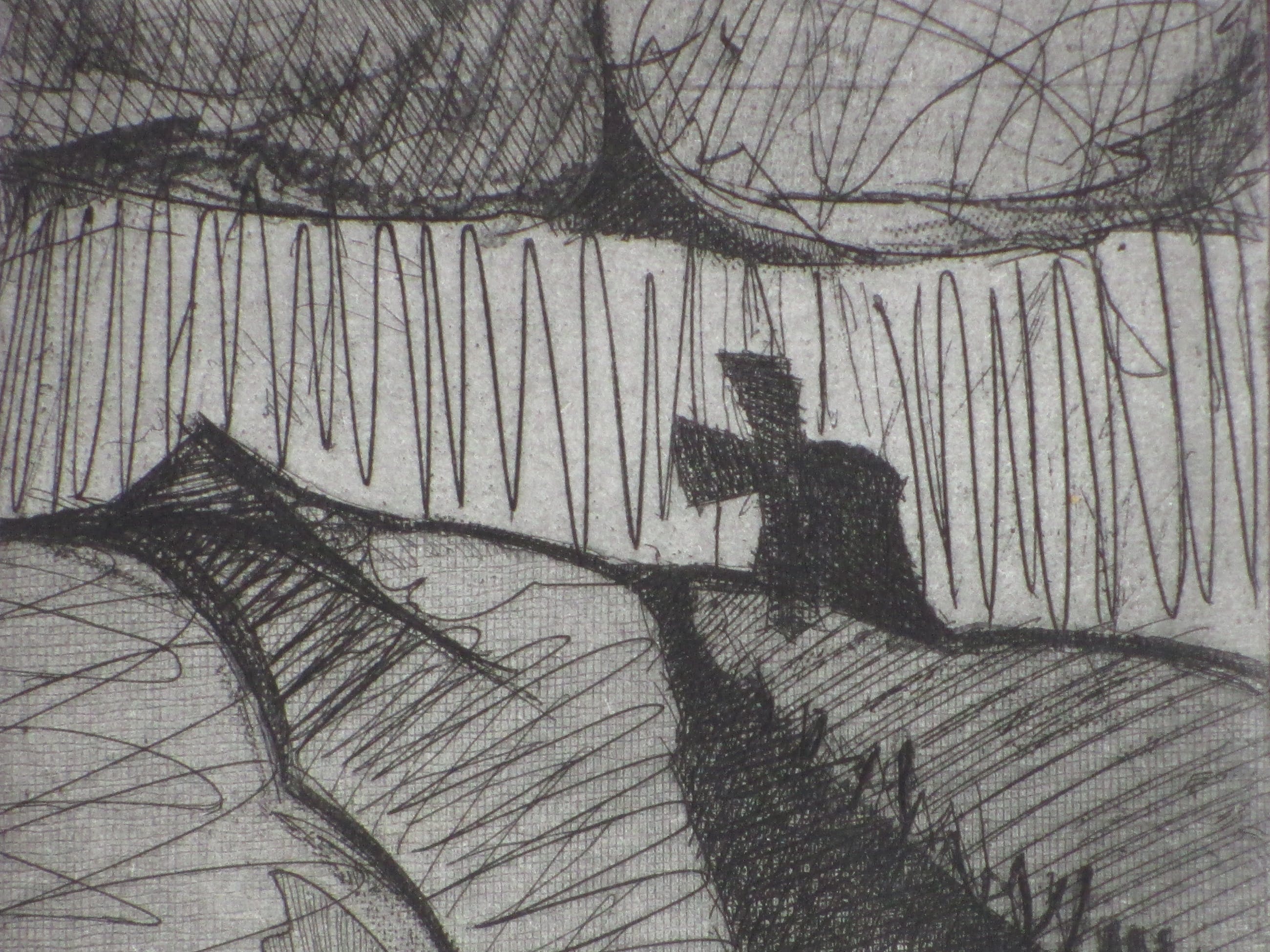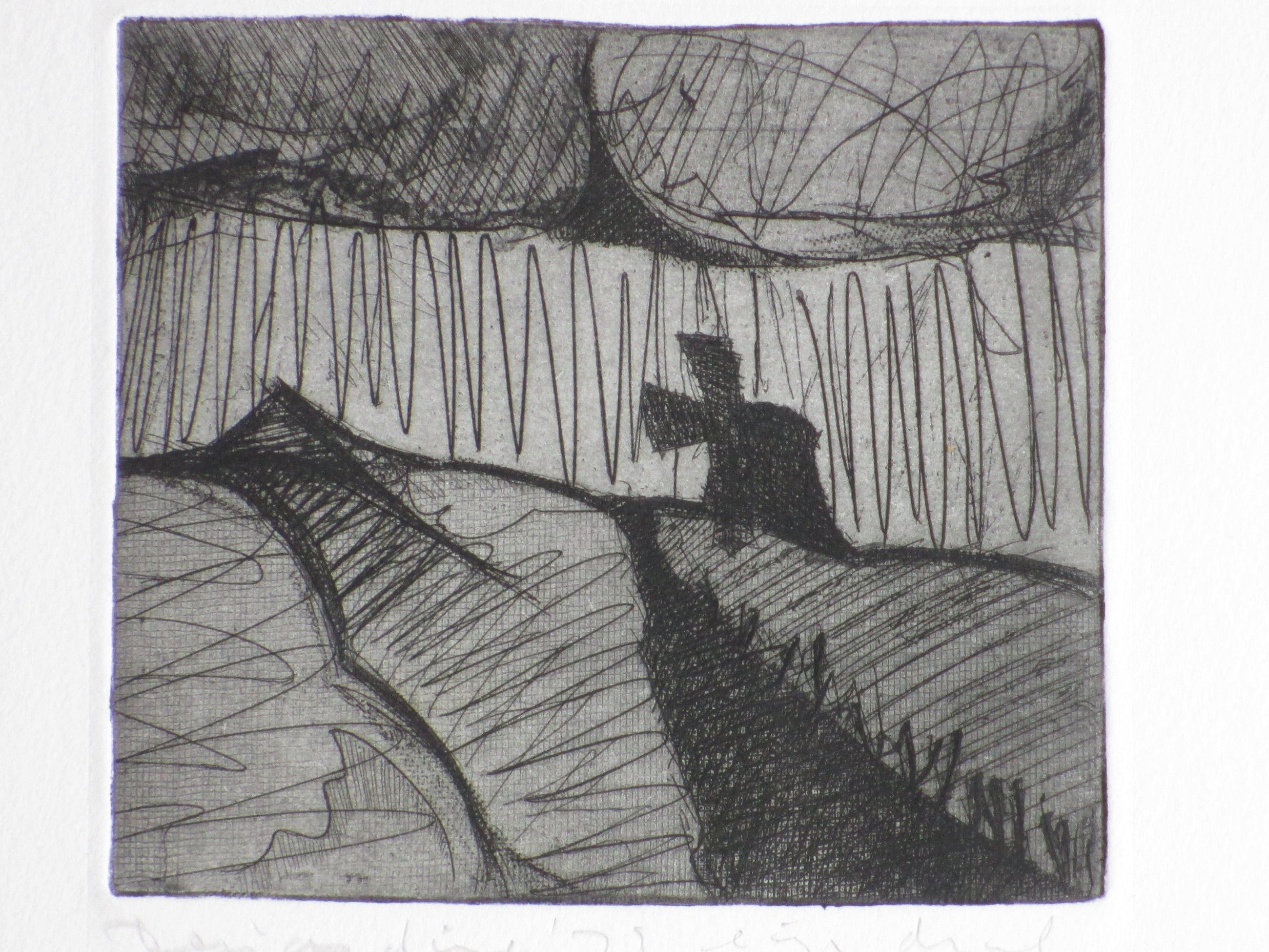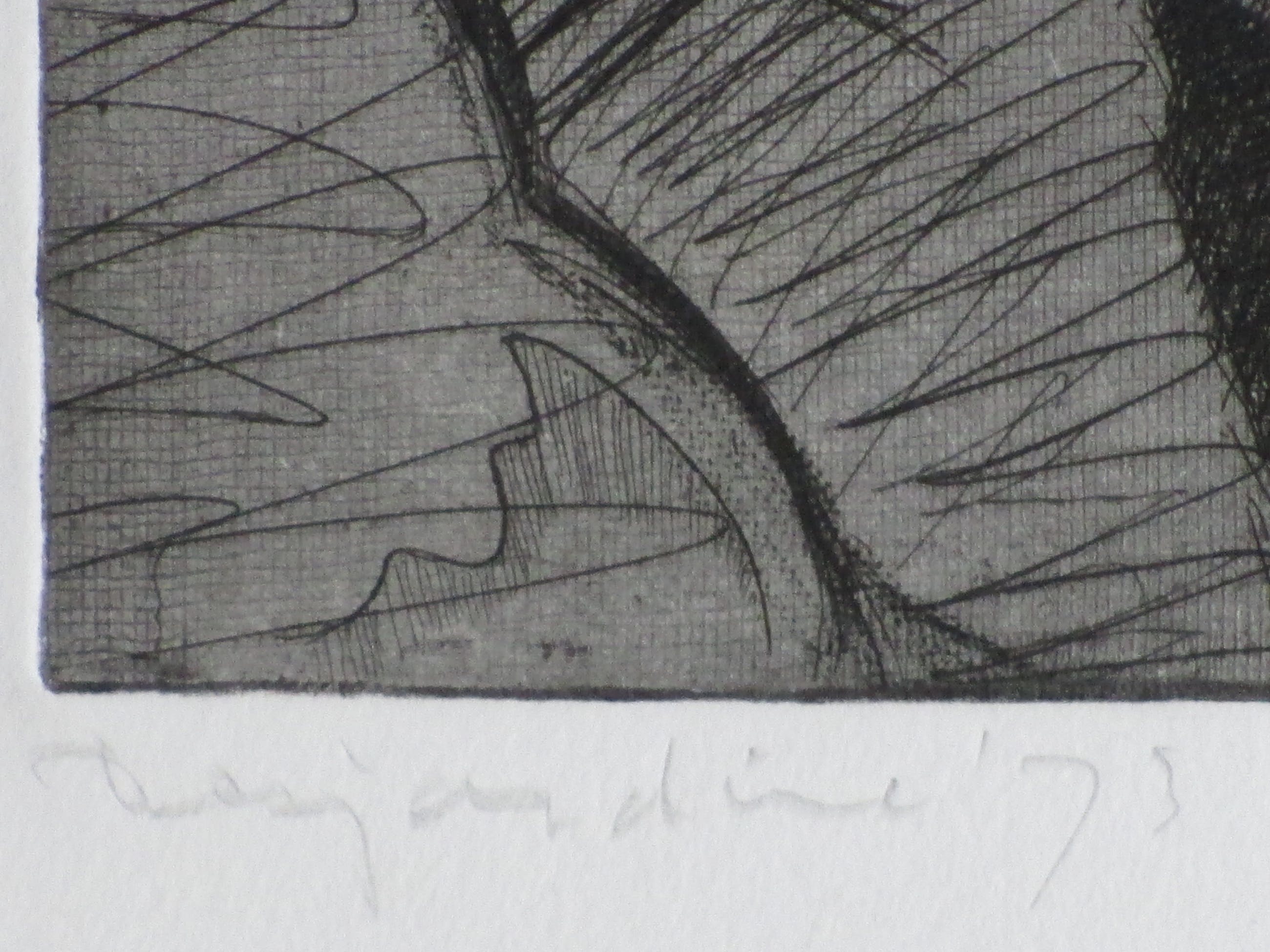 Ets door David DesjardineVoorstelling van een abstract landschap met een molenLosbladig, beeldmaat 12x13, bladmaat 17x25Gesigneerd en gedateerd l.o. 'Desjardine '73' en annotatie 'eigen druk'Authenticiteit volledig gegarandeerd
