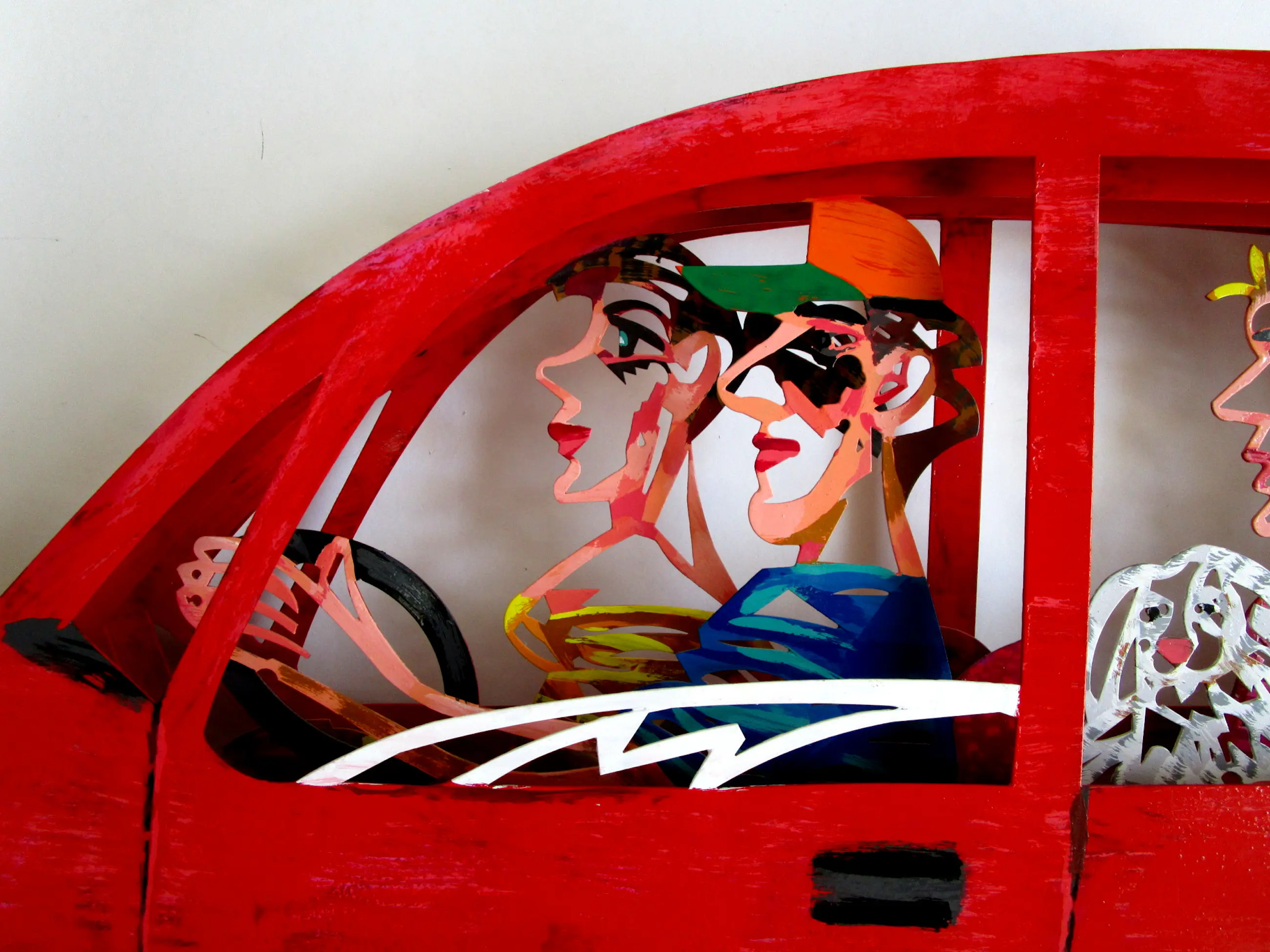 3D-wandsculptuur van David Gerstein Techniek: Handgeschilderd uitgesneden aluminium / 4 lagen Titel: "Gezinsauto" Oplage: 295 exemplaren, dit is nummer 6/295 Afmetingen van het object: ca. 119 cm x 71 cm x 16 cm Conditie: in zeer goede staat, zie foto's!