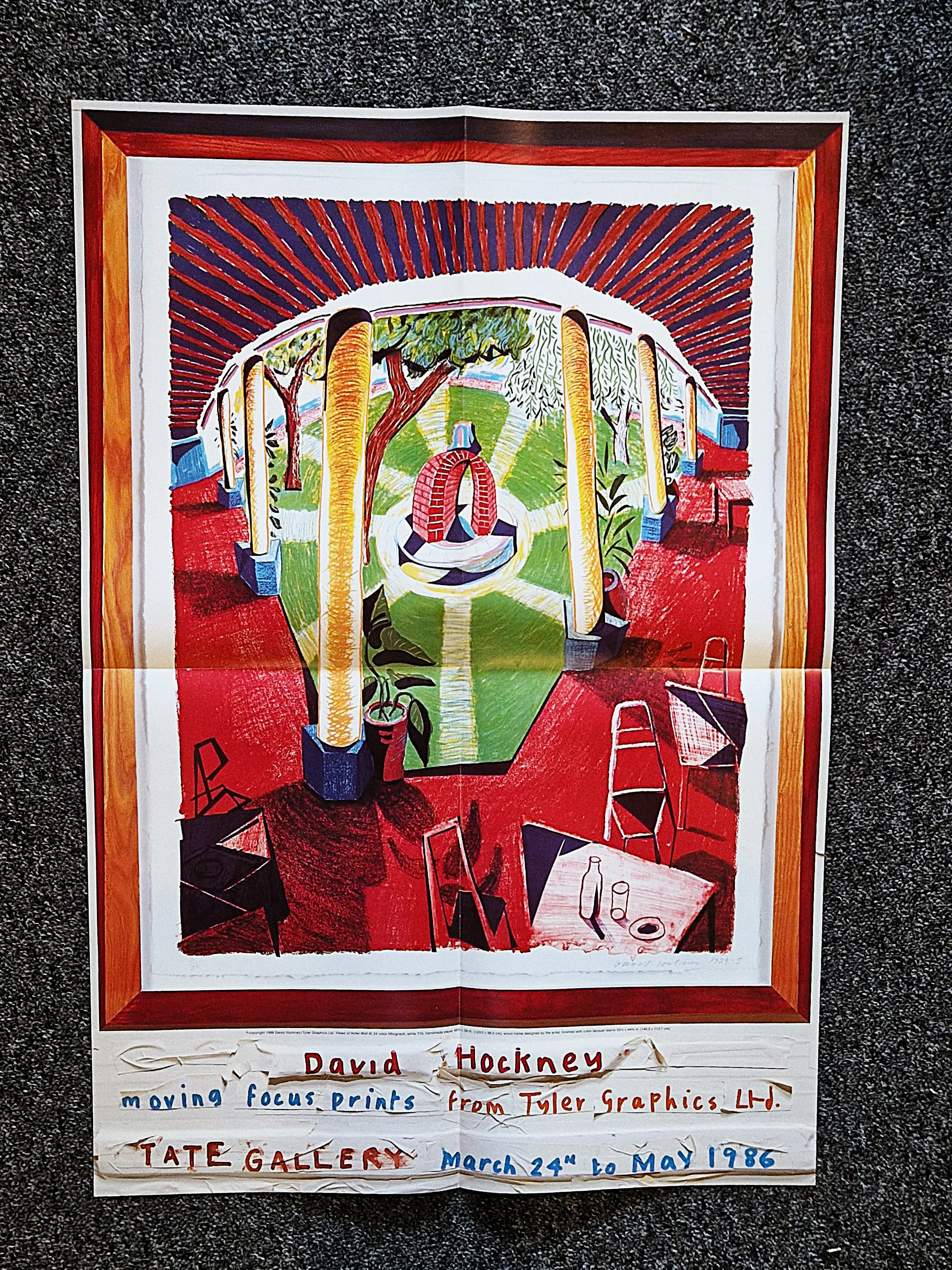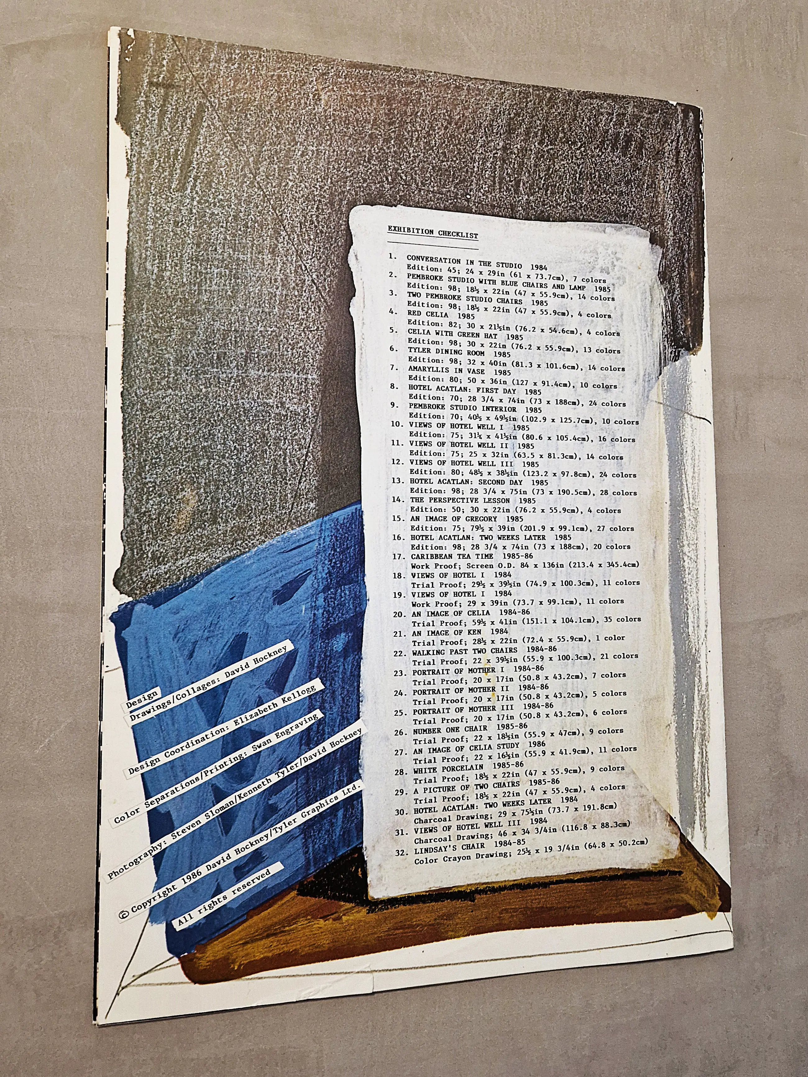 David Hockney, Moving Focus Prints, Tate Gallery, March – May 1986. A fully illustrated catalogue designed by David Hockney listing 32 works from his Moving Focus series of prints. The catalogue was produced by Tyler Graphics Ltd to accompany the exhibition.