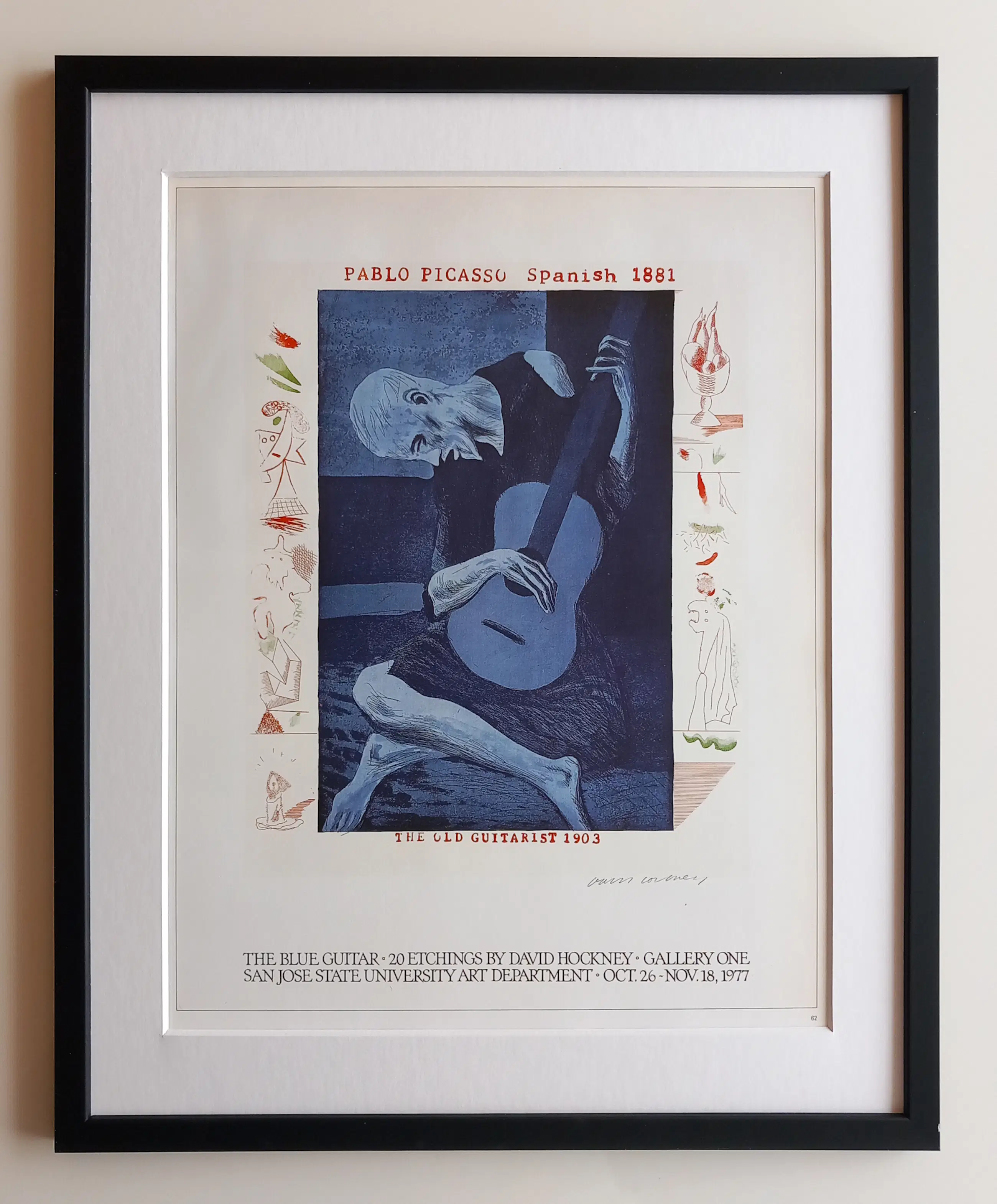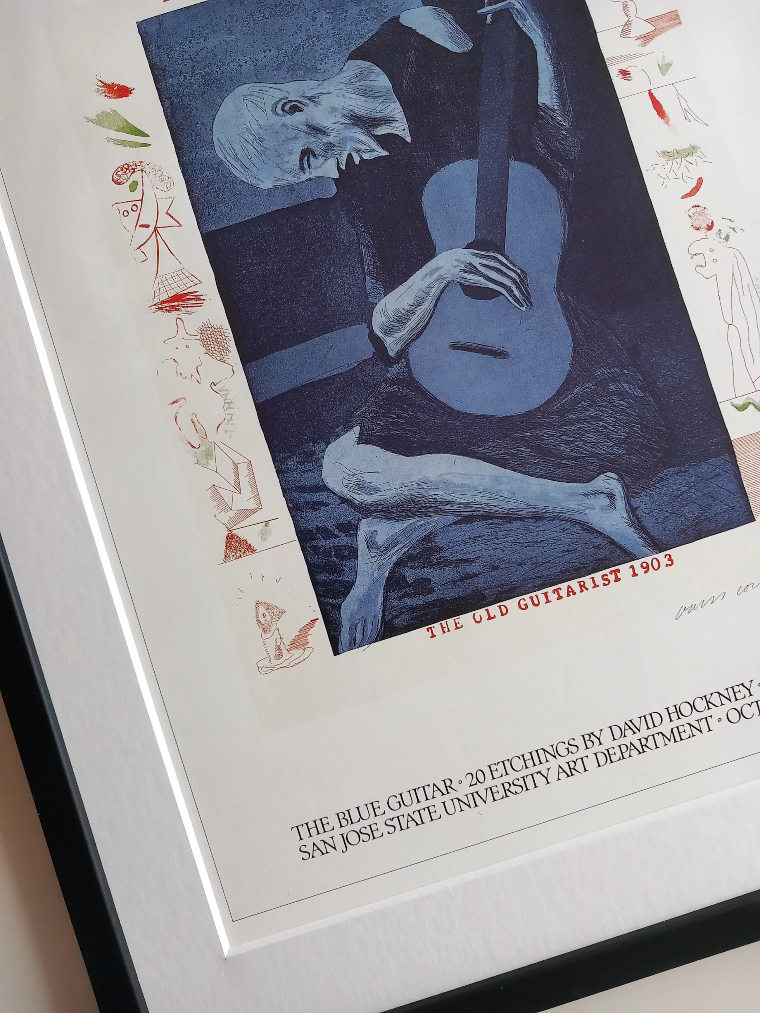 Dit is een vintage offset lithografie van de kunsttentoonstellingsposter uit 1977 voor 'The Blue Guitar: 20 Etchings by David Hockney' aan de San Jose State University. De litho bevat Hockneys ets uit 1976-7 met aquatint 'The Old Guitarist' (naar Pablo Picasso) uit zijn serie 'Blue Guitar' en is uitgegeven in een gelimiteerde editie.