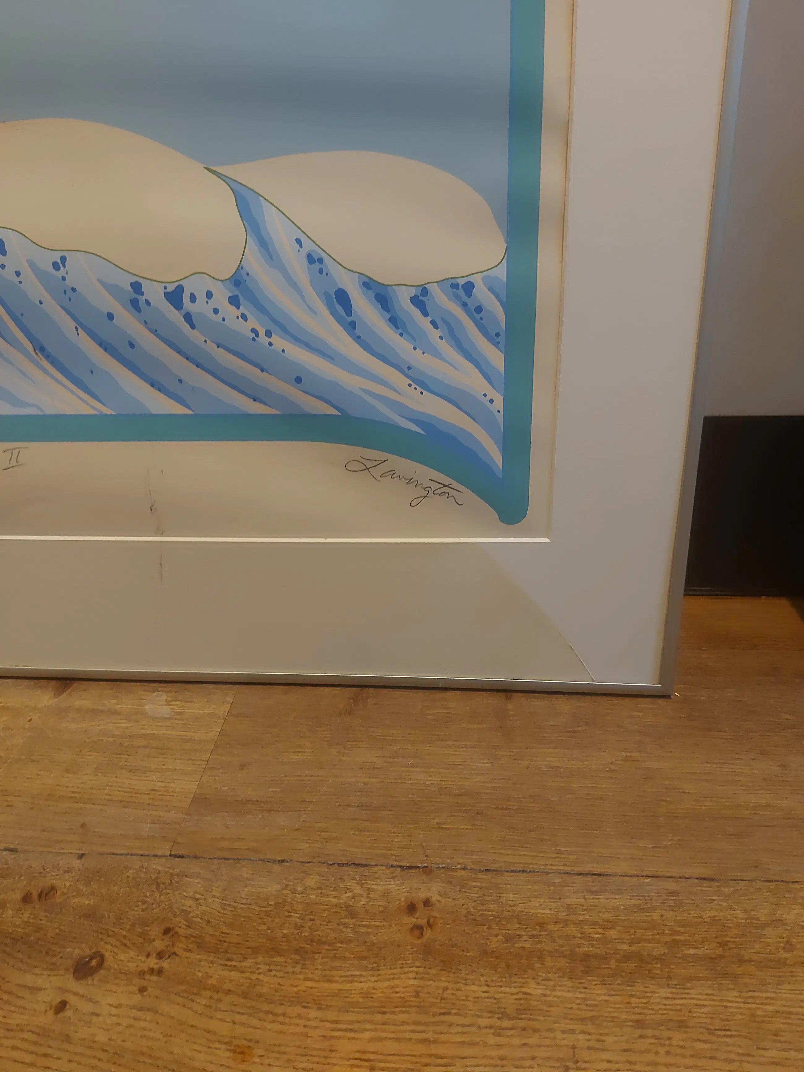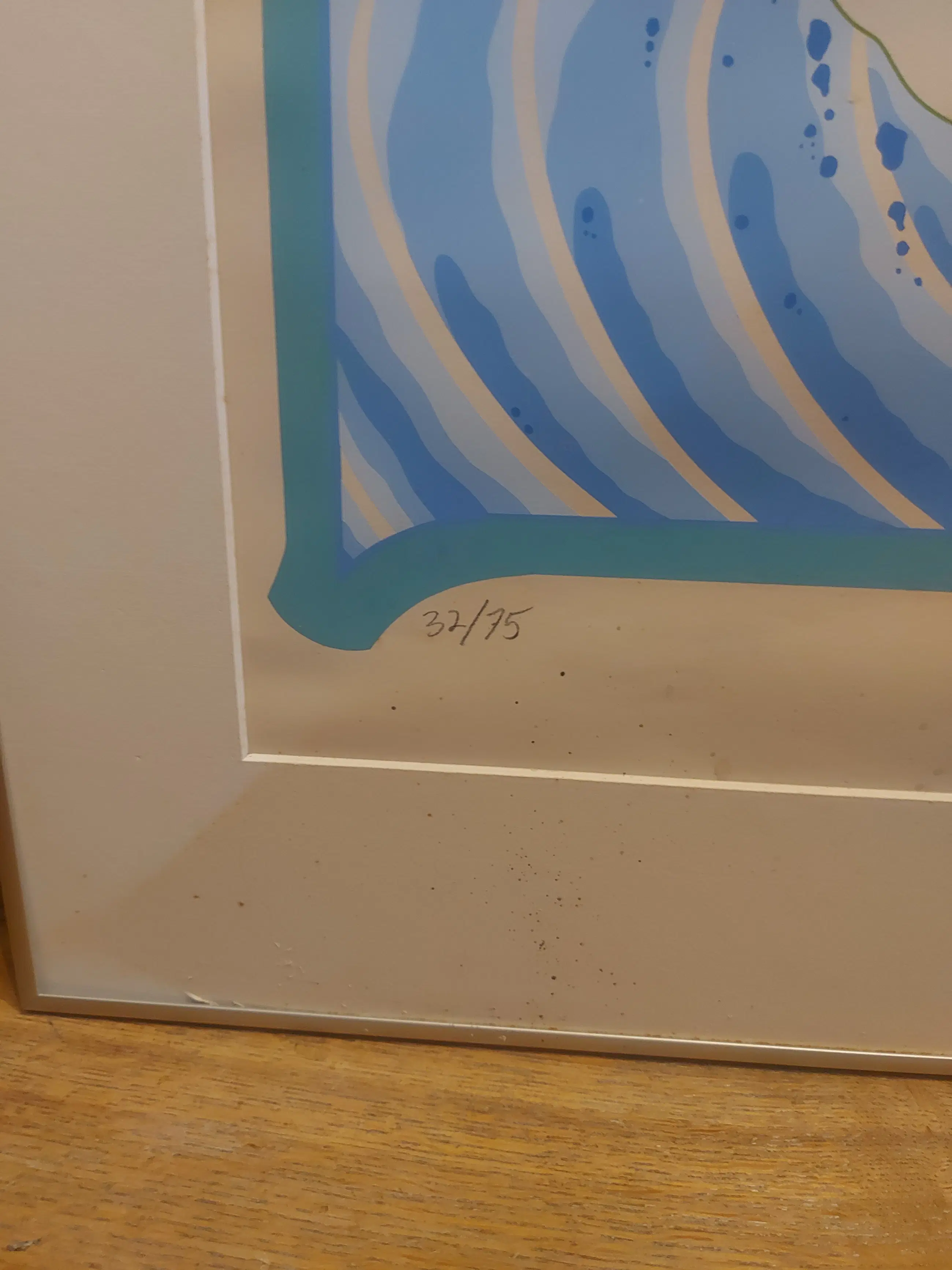 De zeefdruk is ietwat beschadigd en heel erg verkleurd doordat glas gebroken was. heeft in een woning gehangen waar gerookt werd