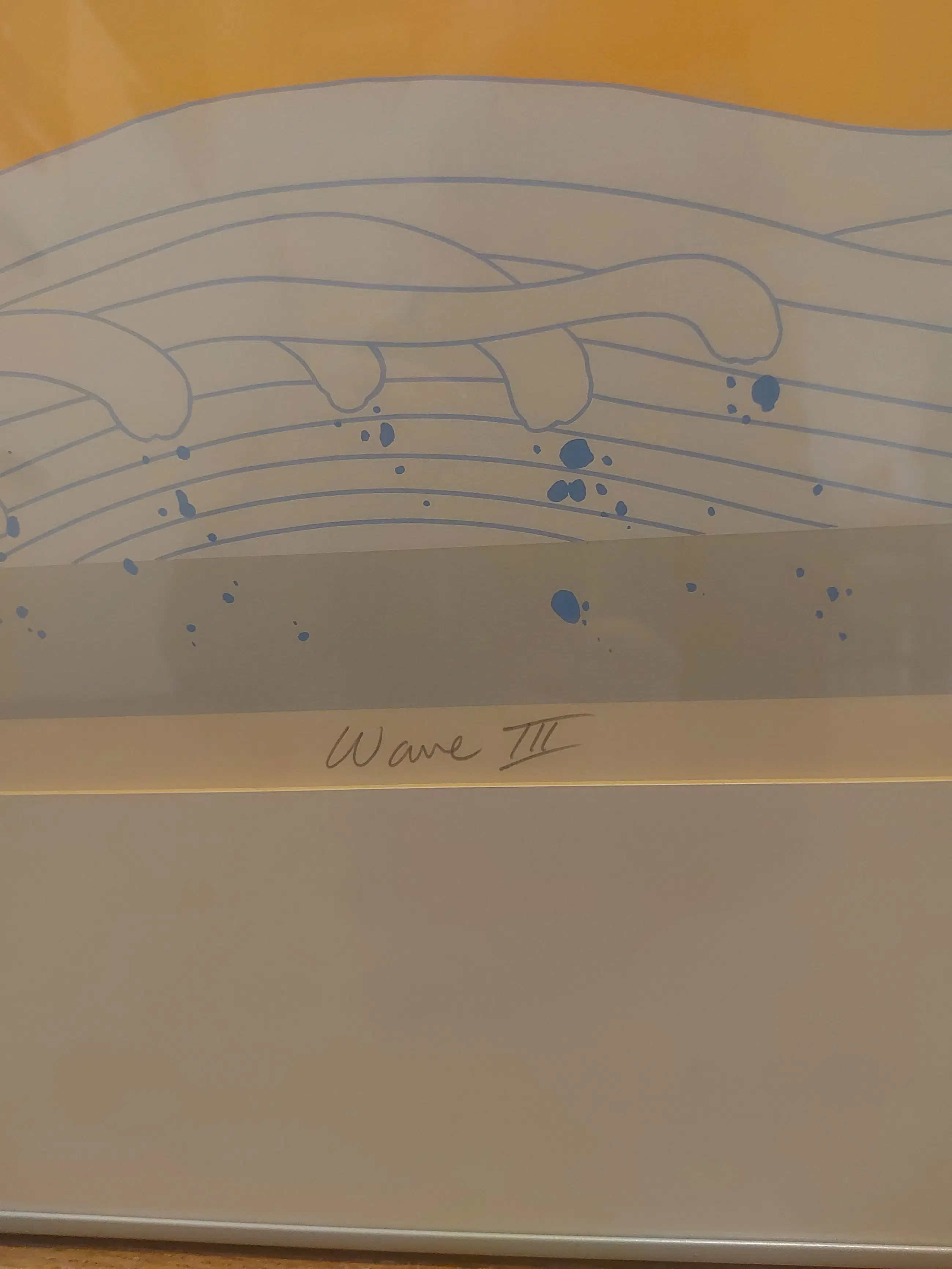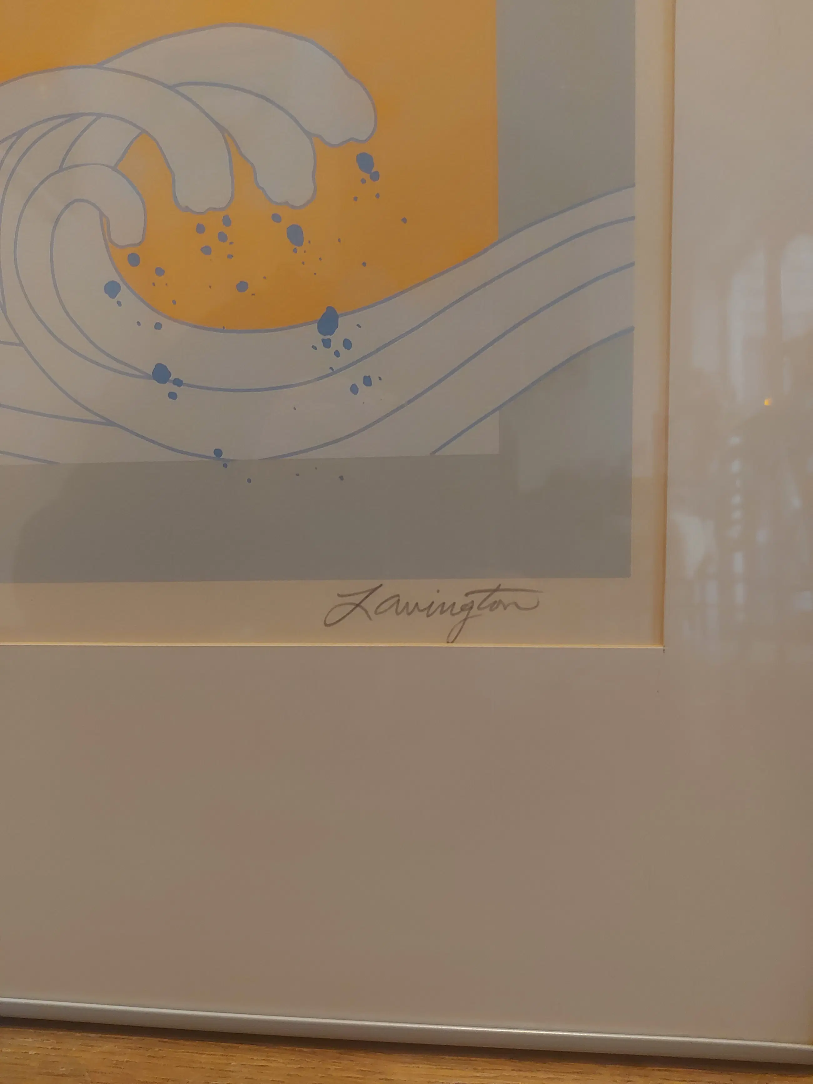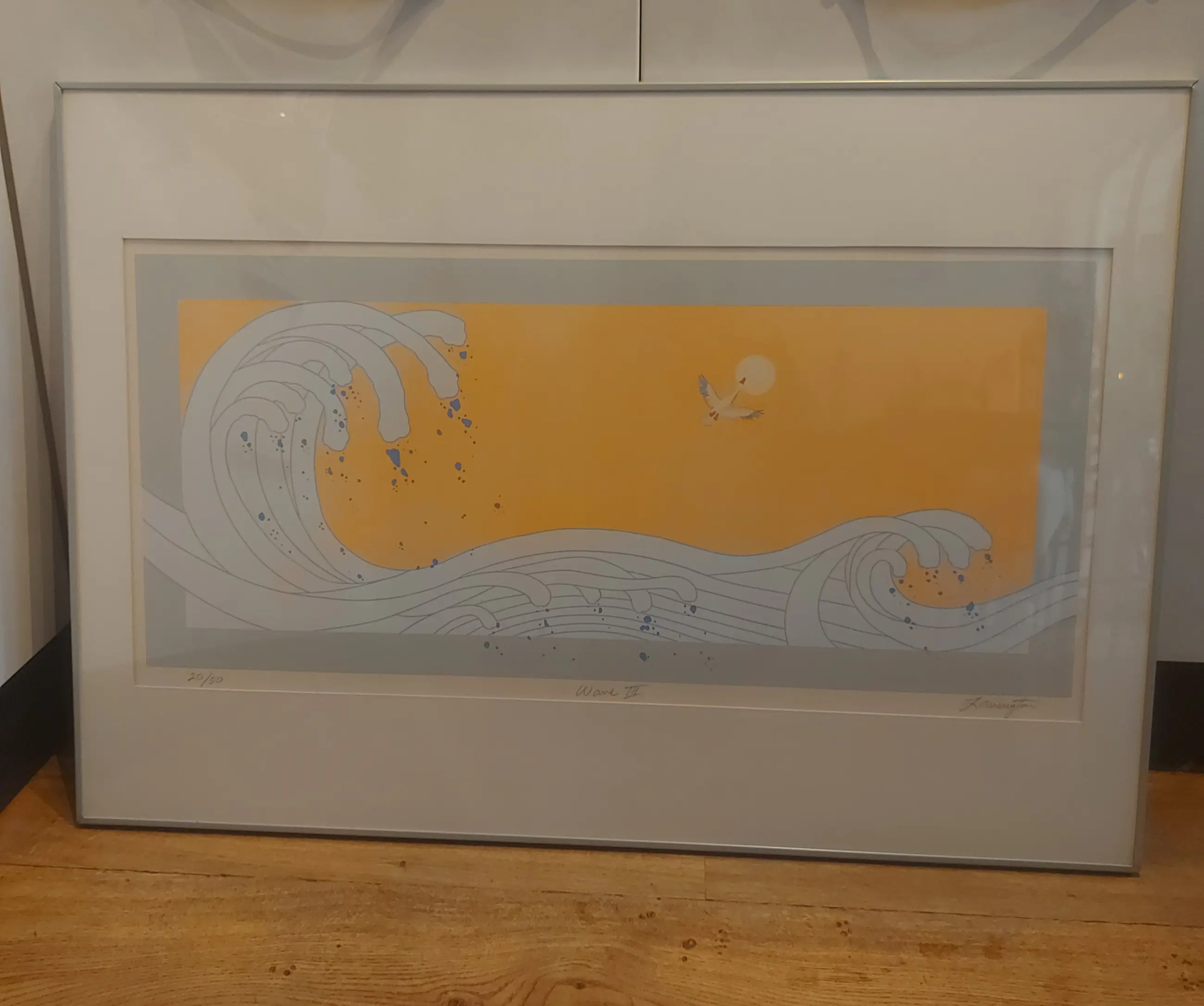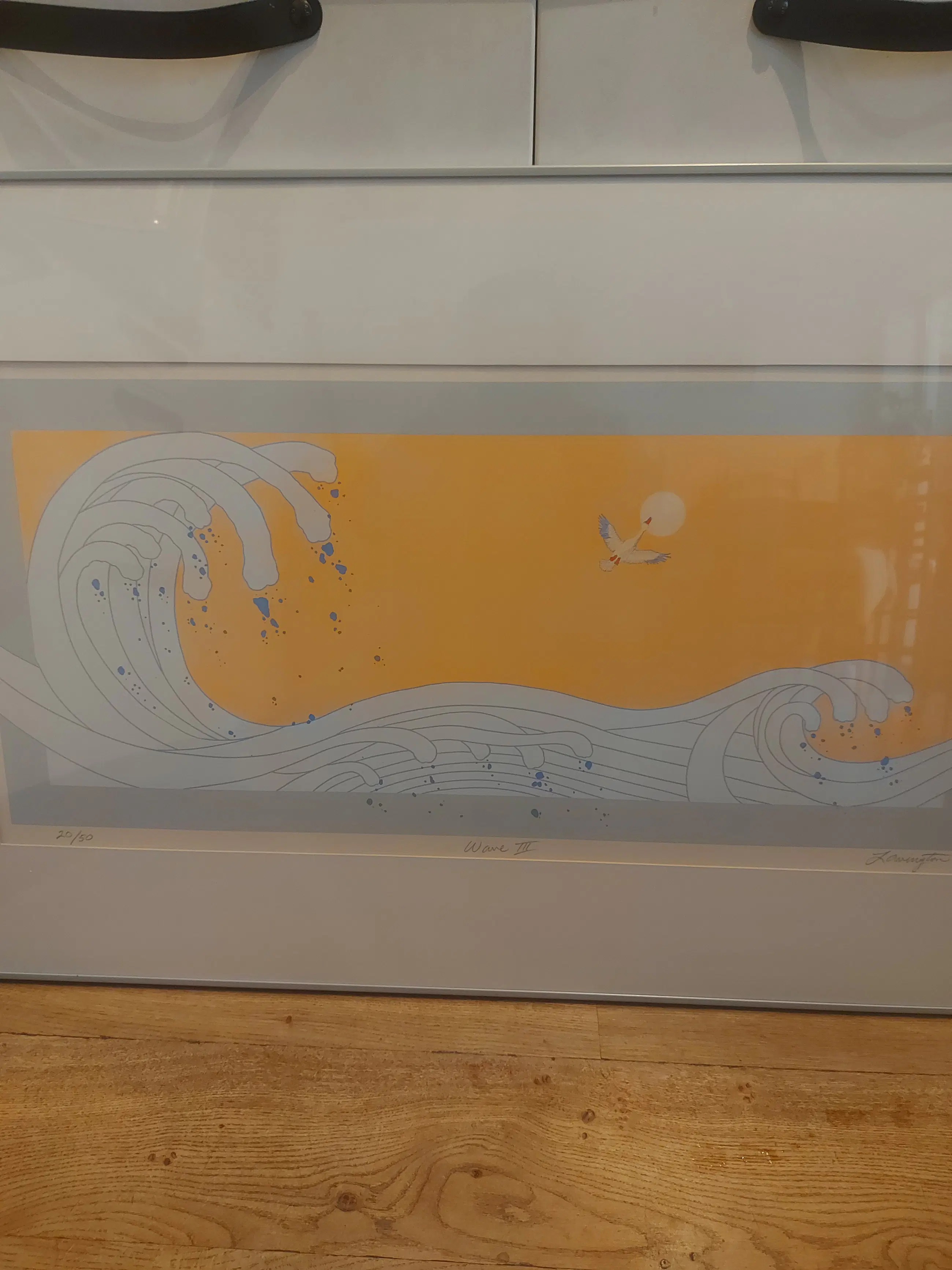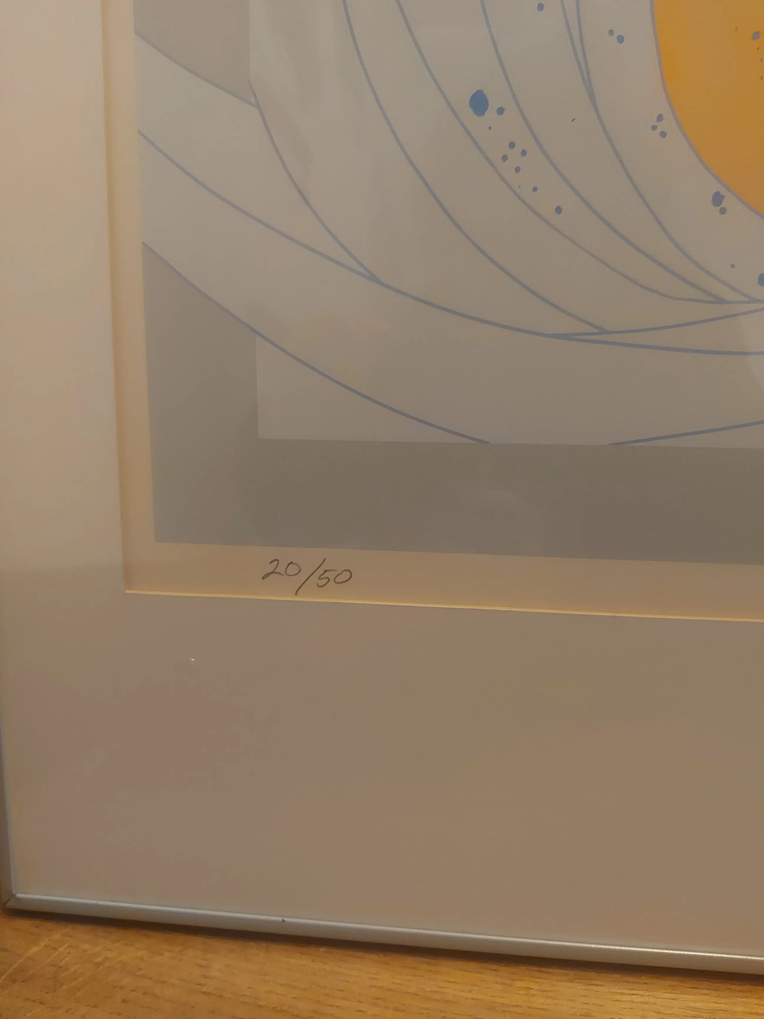 De lijst is ietwat beschadigd (barsten, krassen) en verkleurd, de zeefdruk is ook wat verkleurd; heeft in een woning gehangen waar gerookt werd
