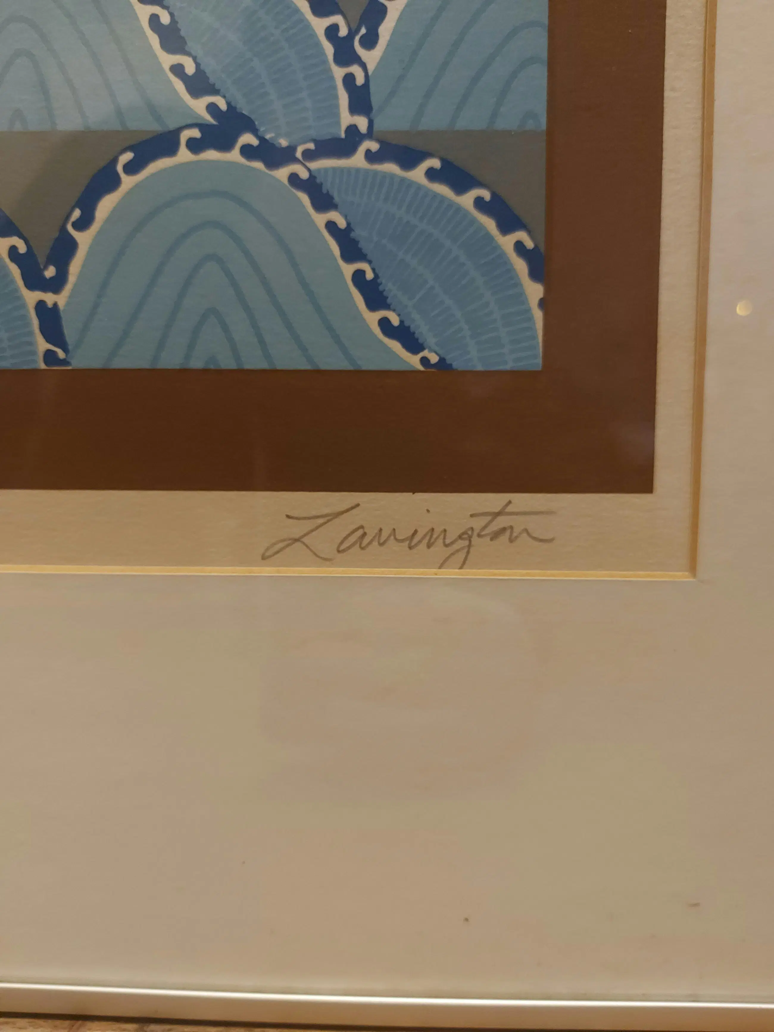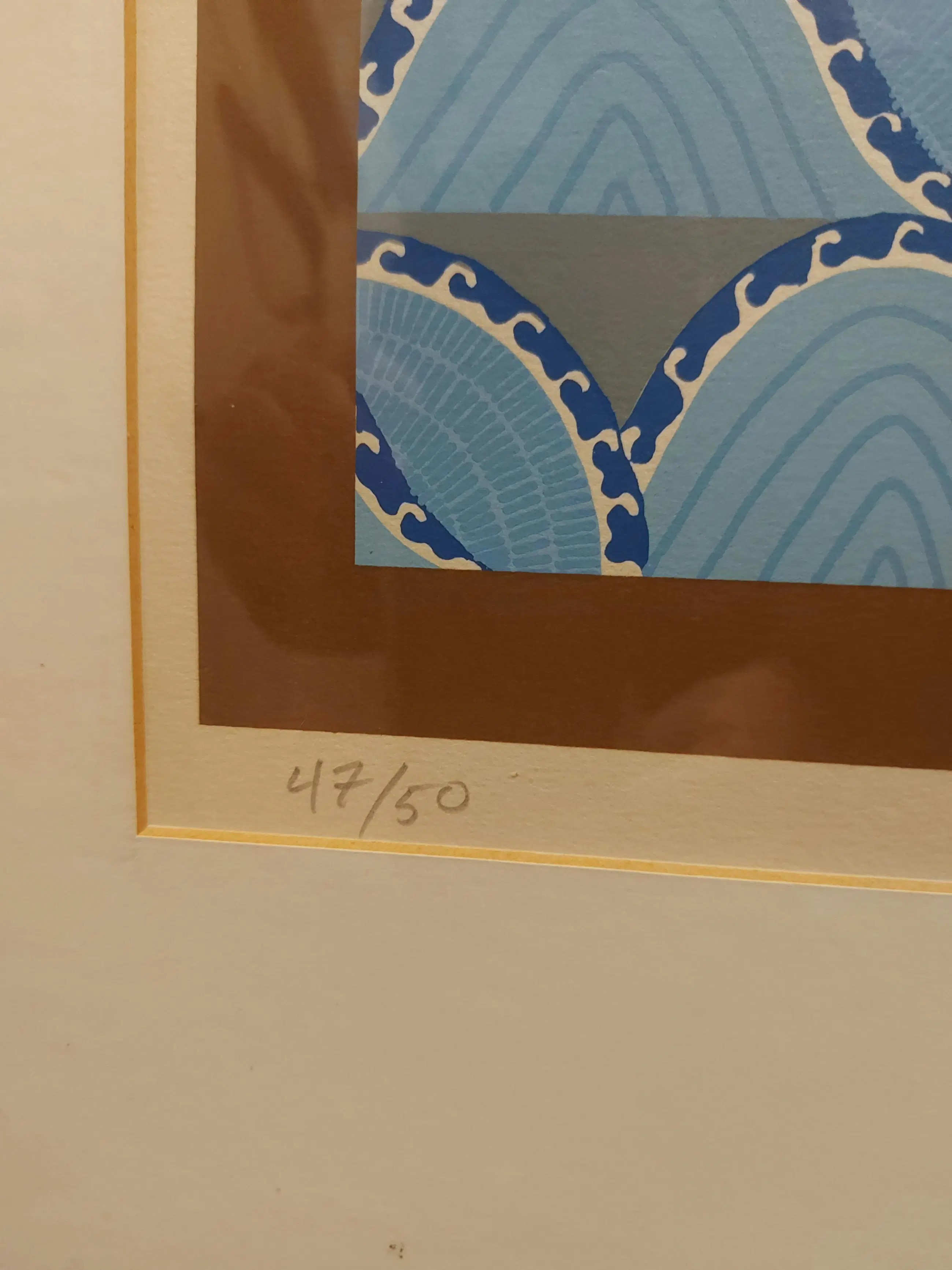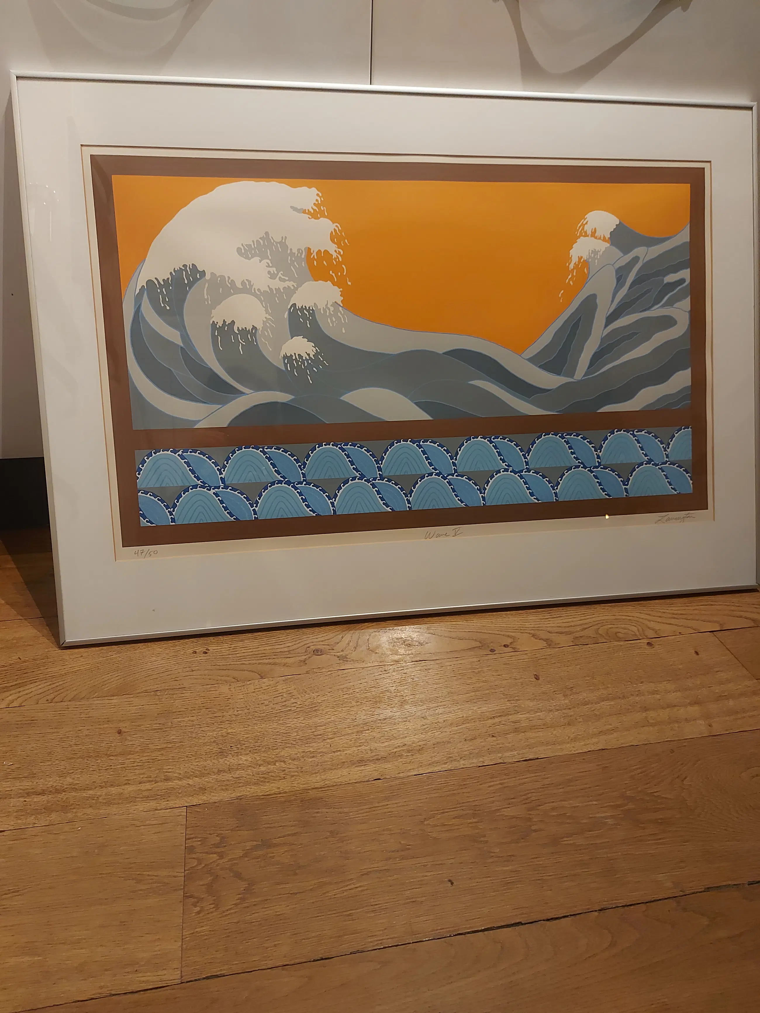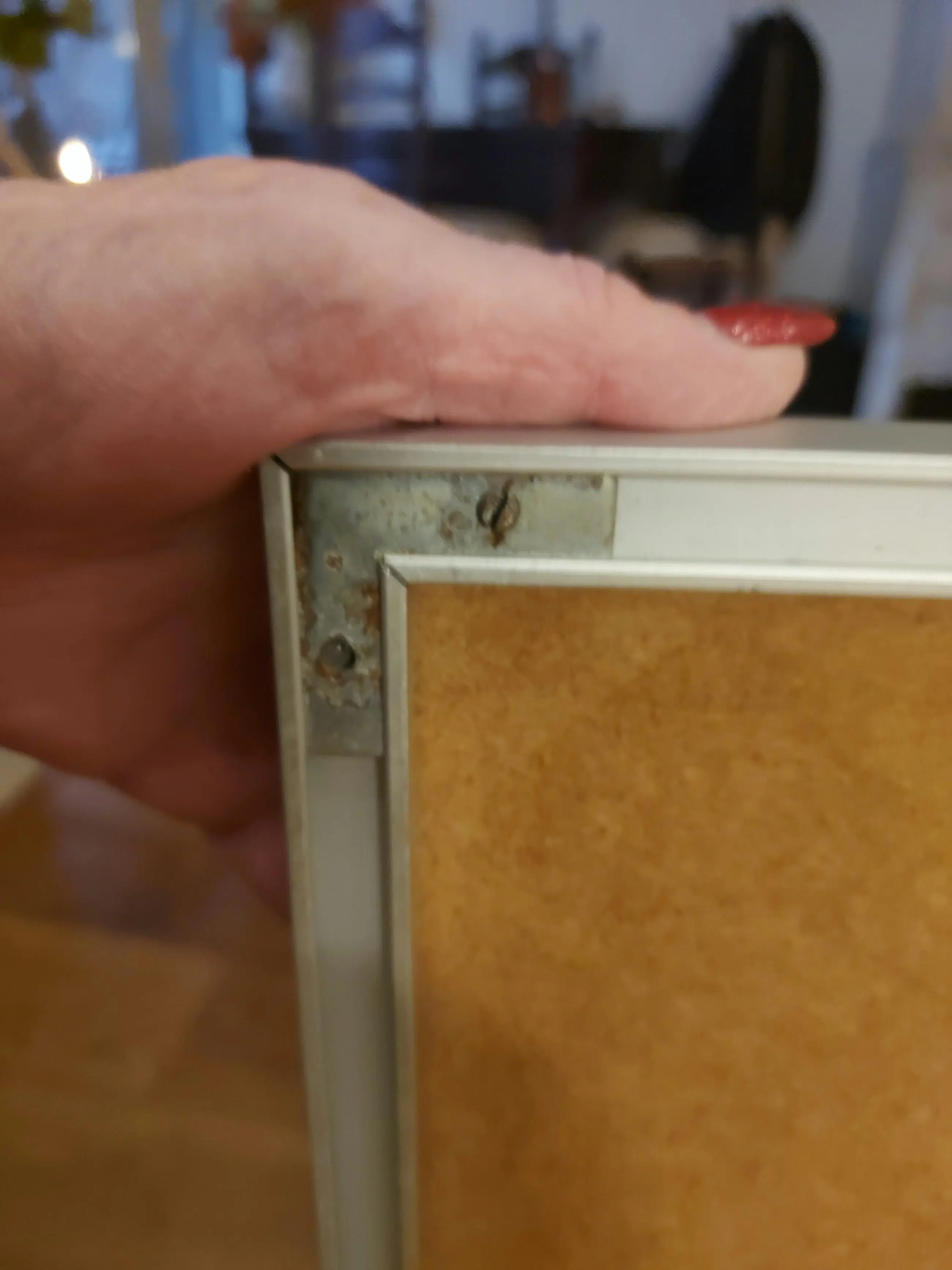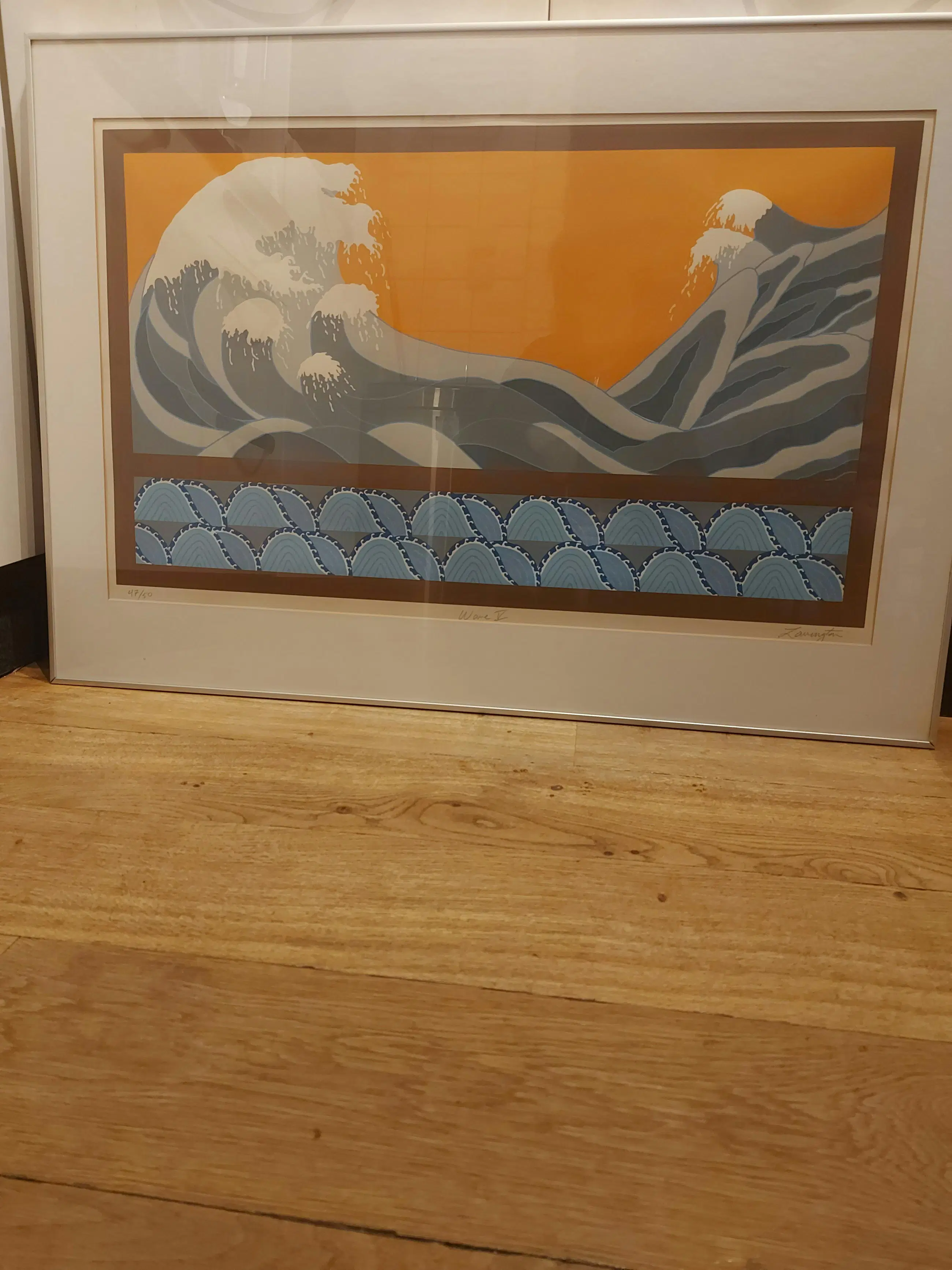 De lijst is ietwat beschadigd en verkleurd, de zeefdruk is ook wat verkleurd; heeft in een woning gehangen waar gerookt werd