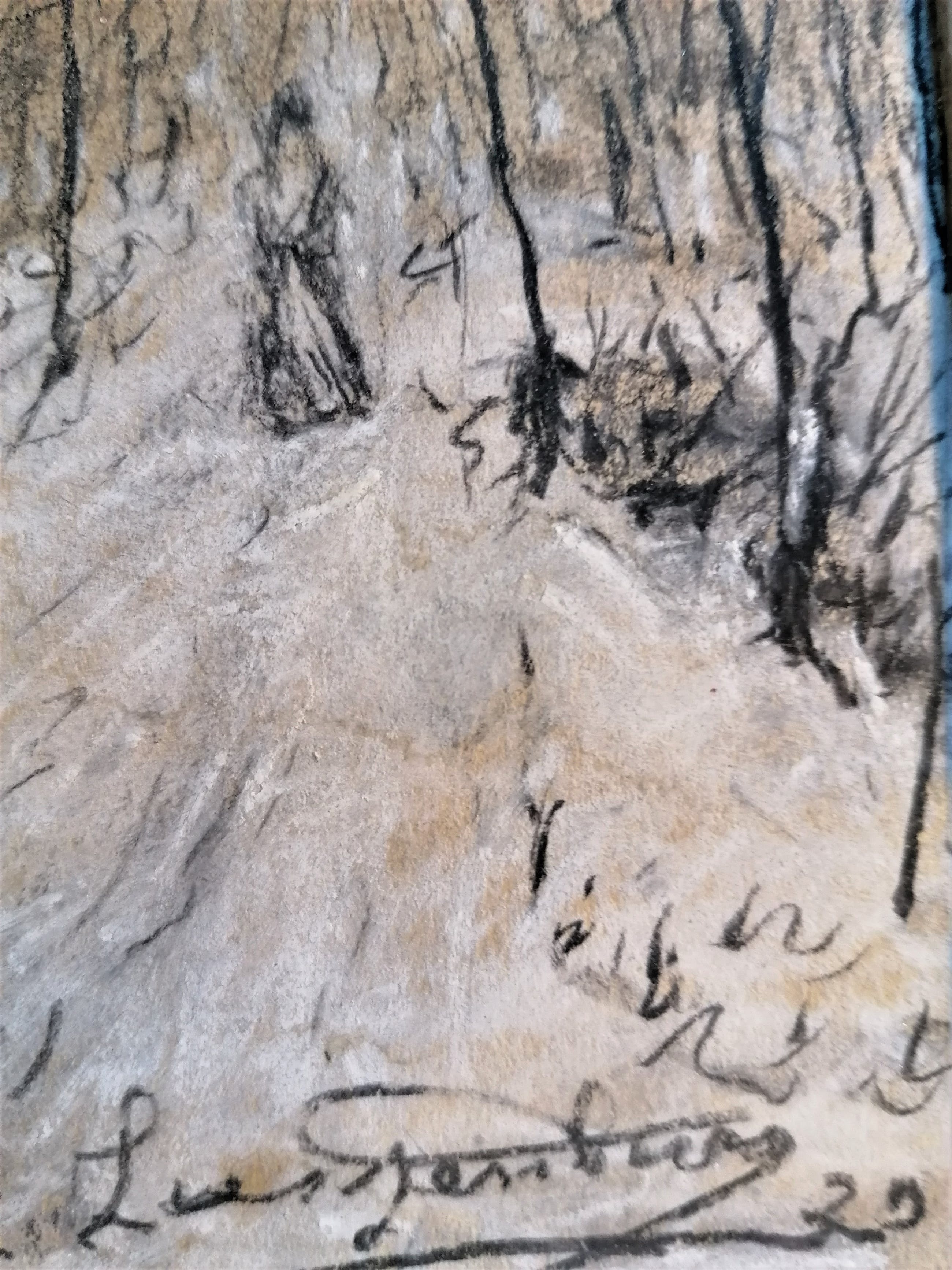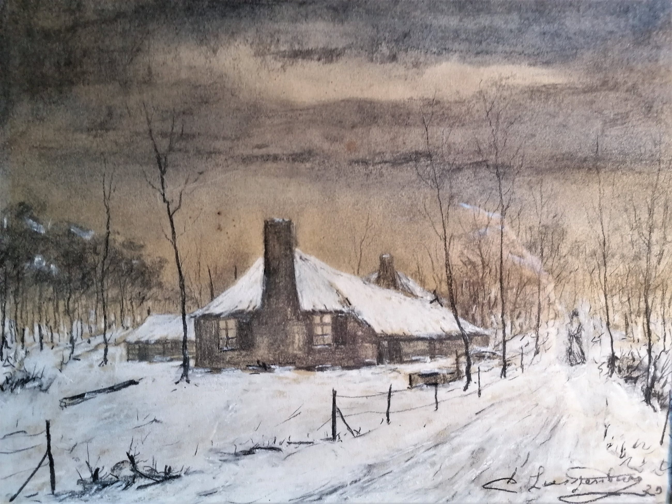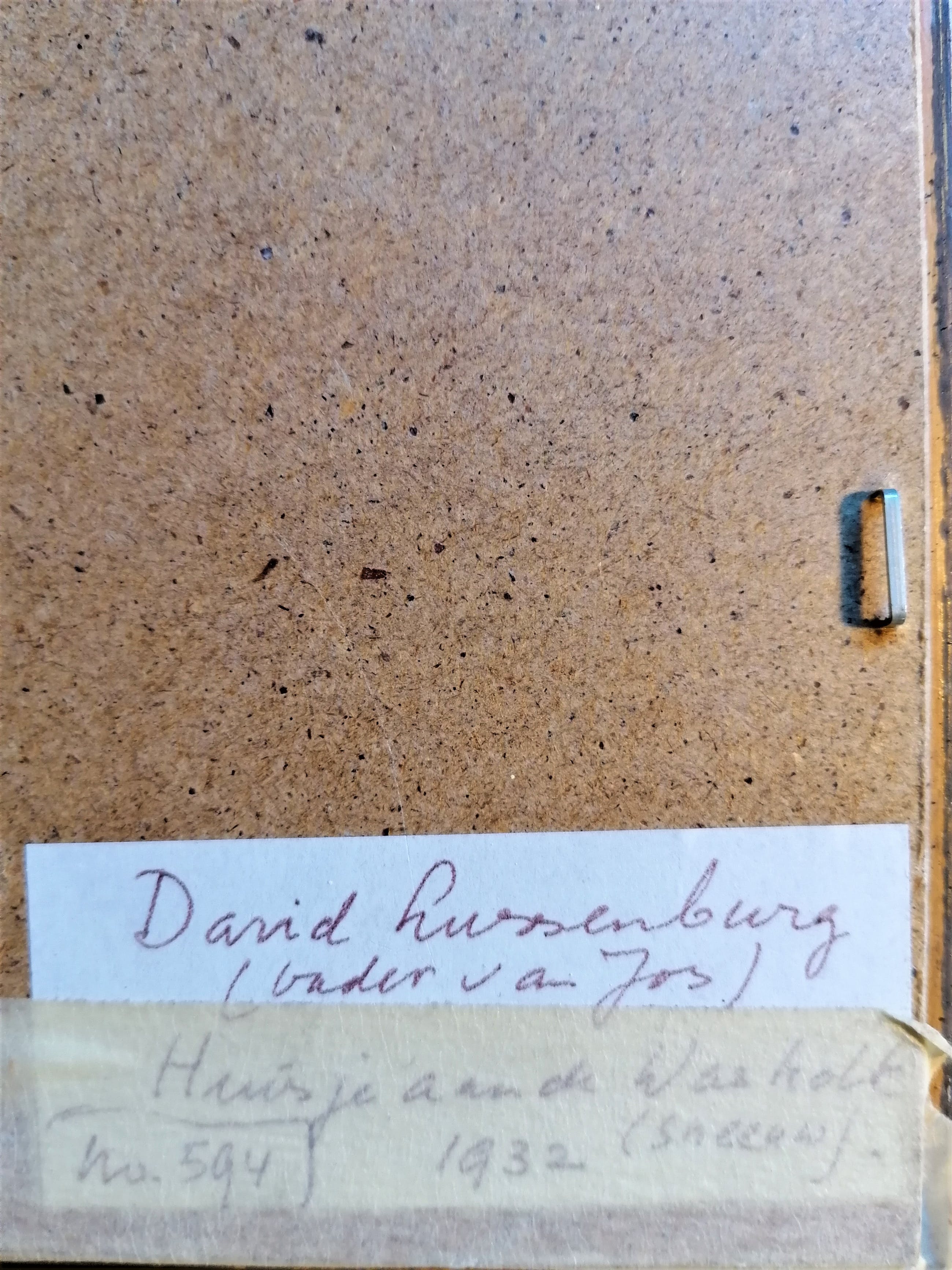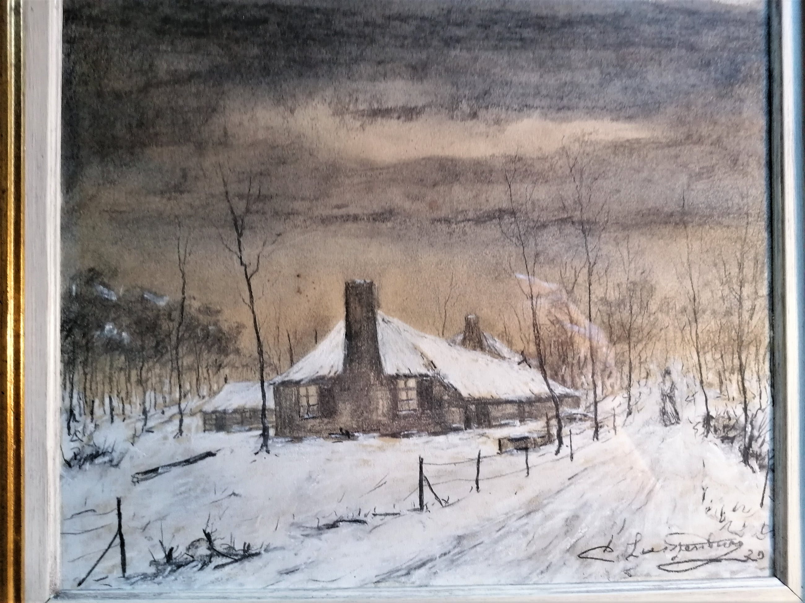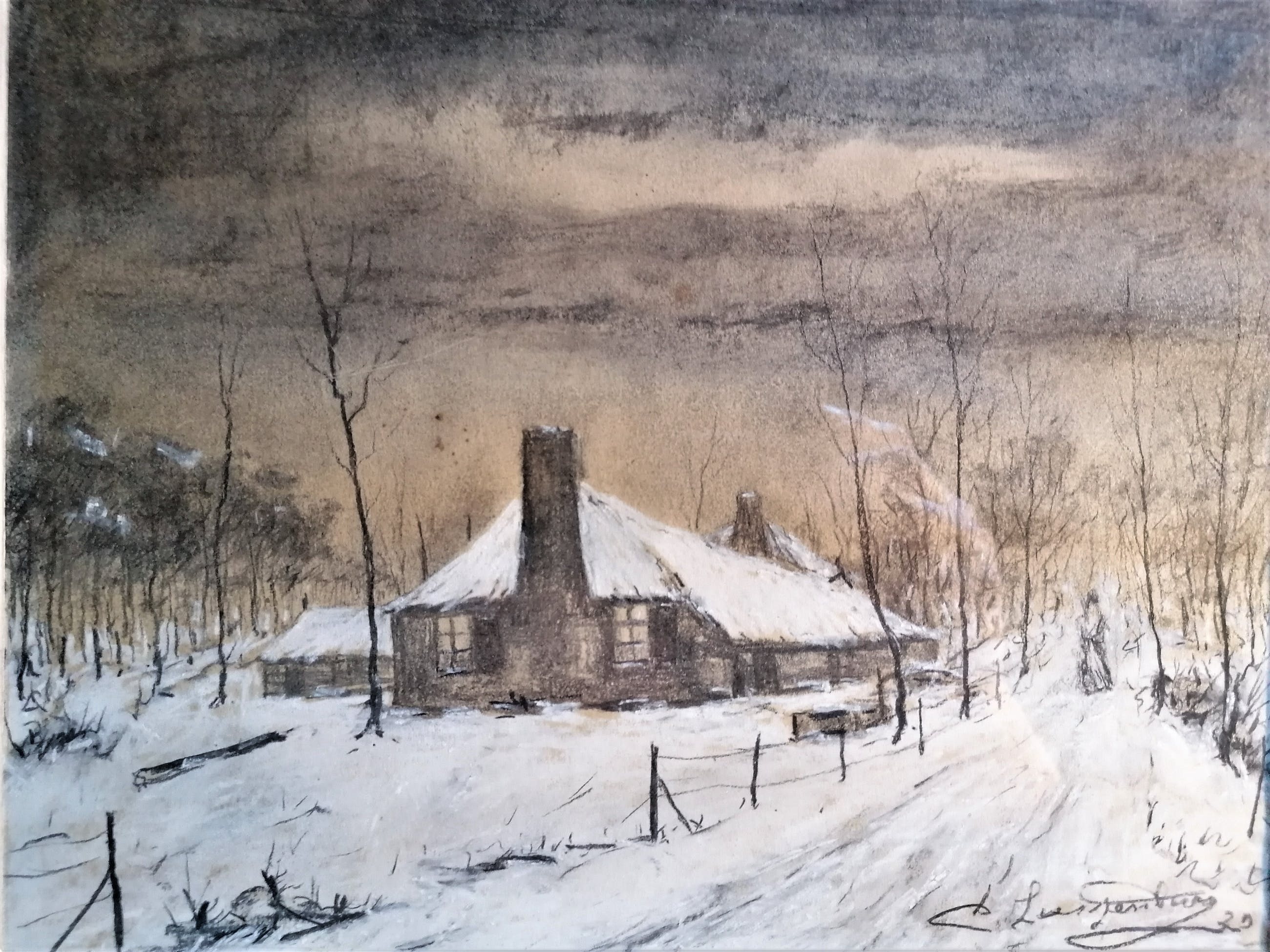 Huisje aan de Warholt in de sneeuw. Dit werk is getekend door David Lussenburg (1862-1937). David Lussenburg is de vader van Jos Lussenburg. David Lussenburg was absoluut begenadigd kunstenaar. Er zijn vele werken van hem bekend. ook vele werken hangen in diverse musea. Dit werk is door hem getekend in 1929. Techniek: gemengde techniek. Gesigneerd aan de rechter onderzijde. De afmetingen van het werk zijn: 32 cm x 27 cm. inclusief de lijst zijn de afmetingen: 36 cm x 31 cm. Het geheel verkeert in een goede staat.