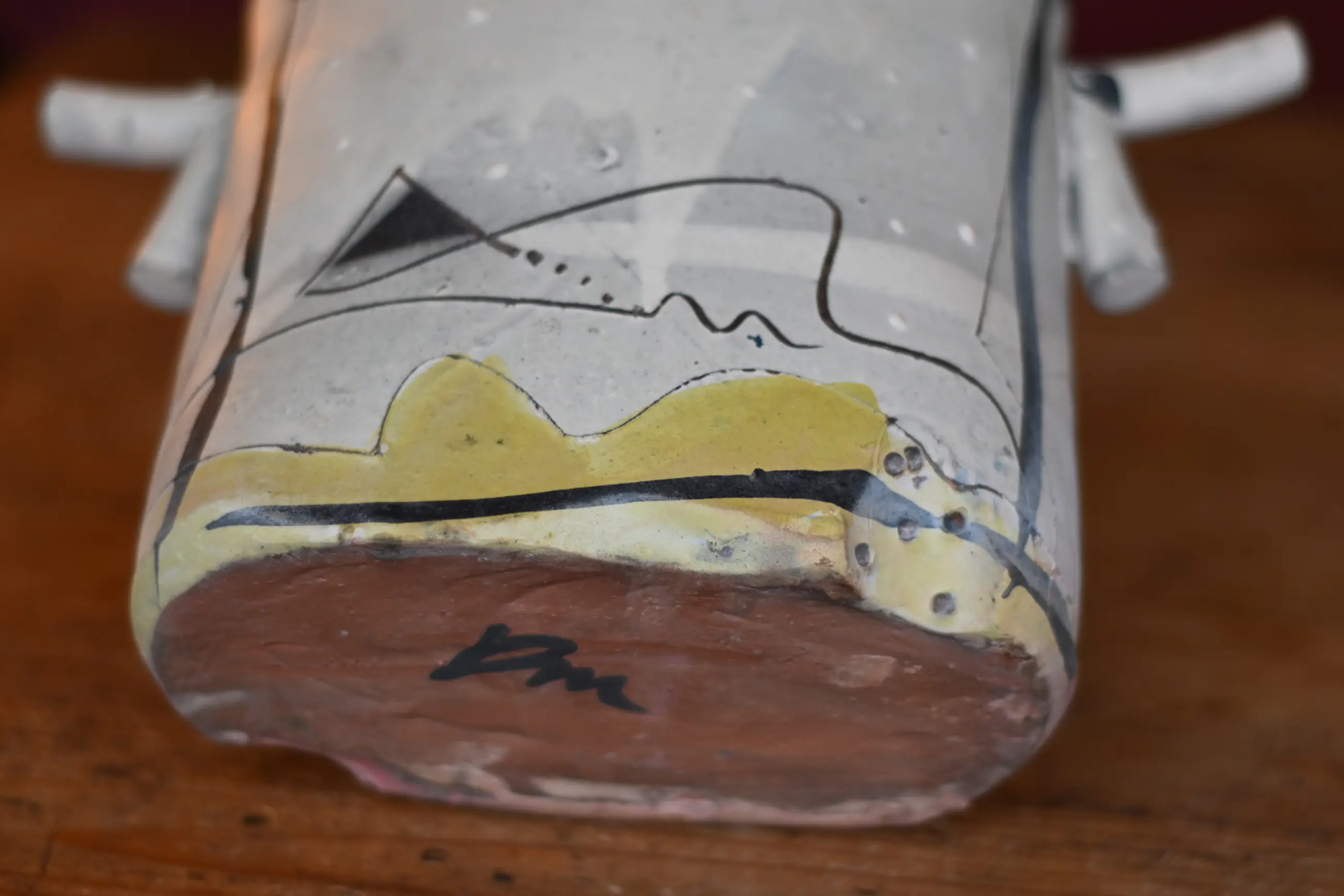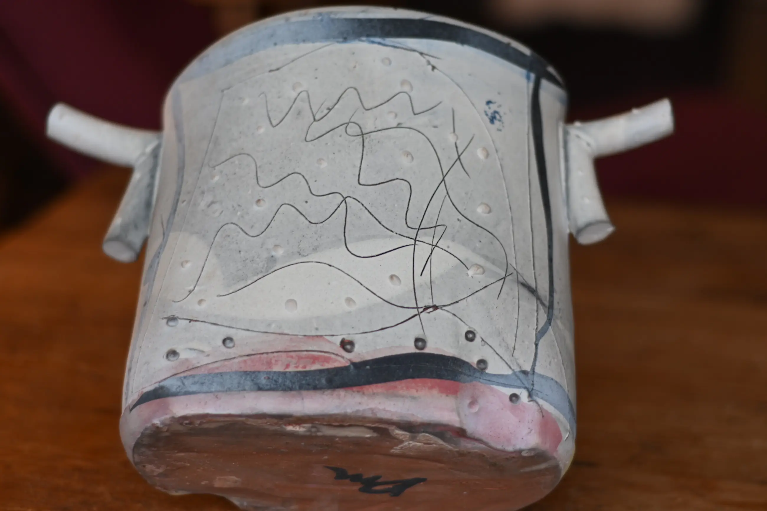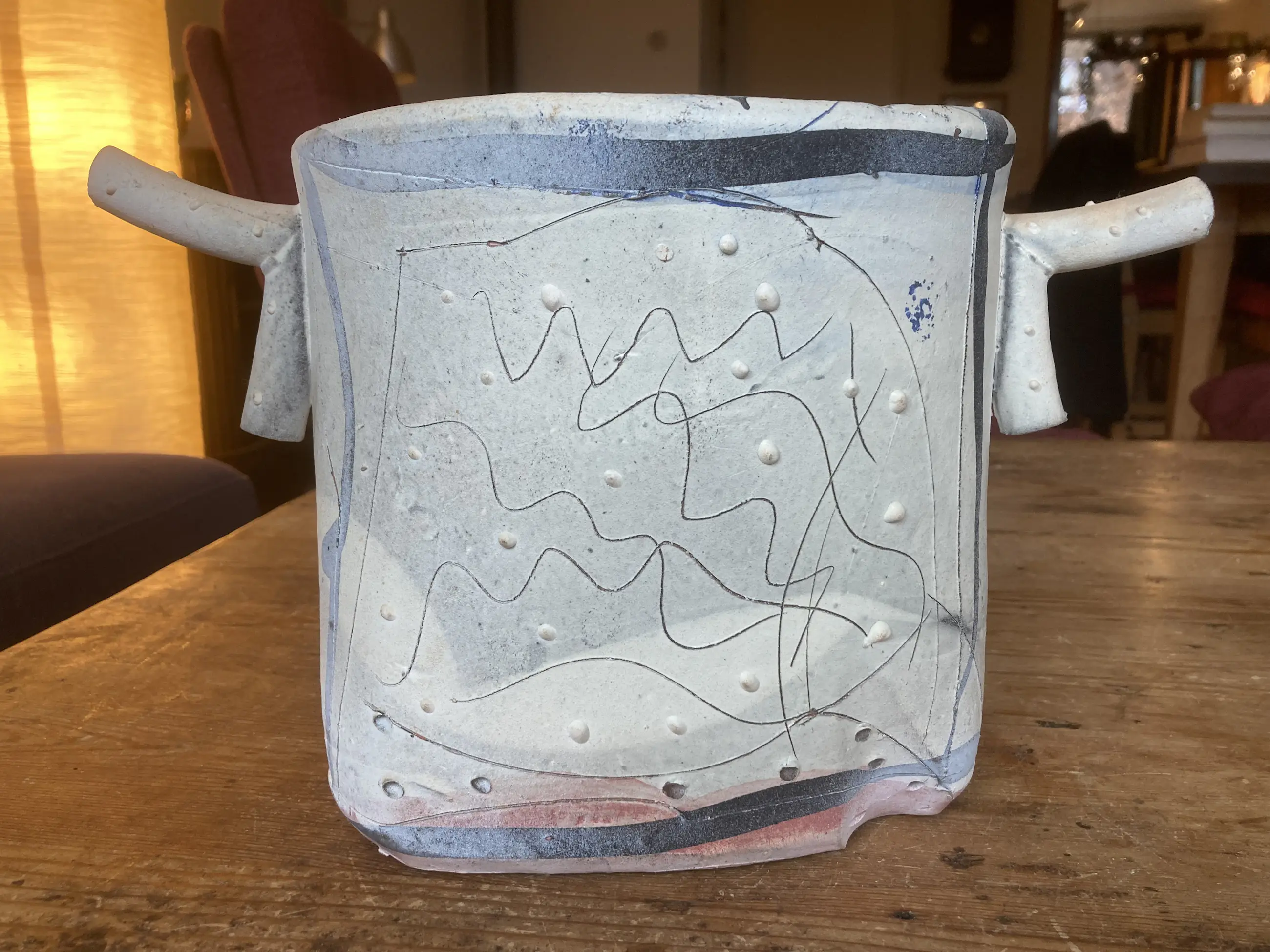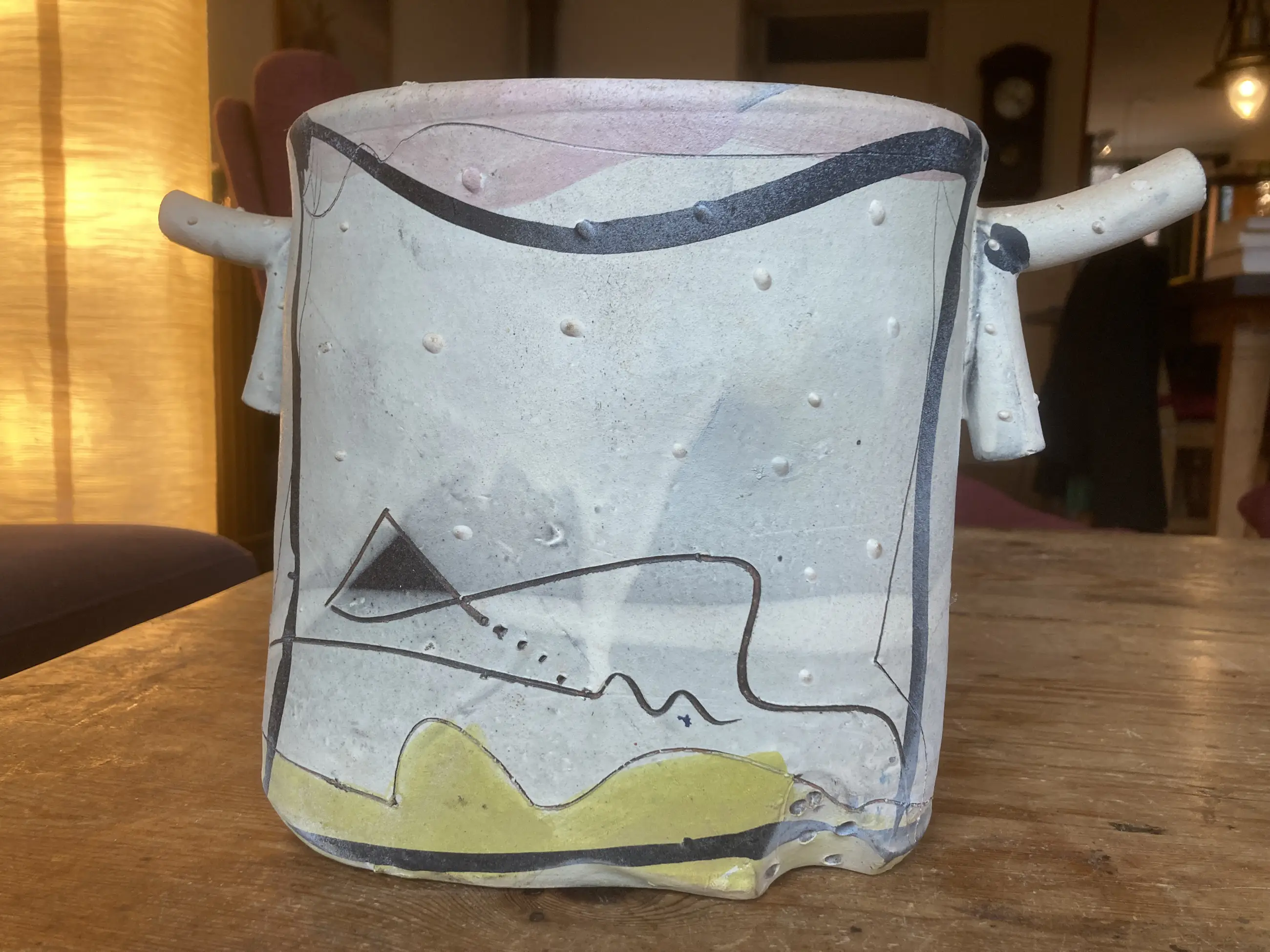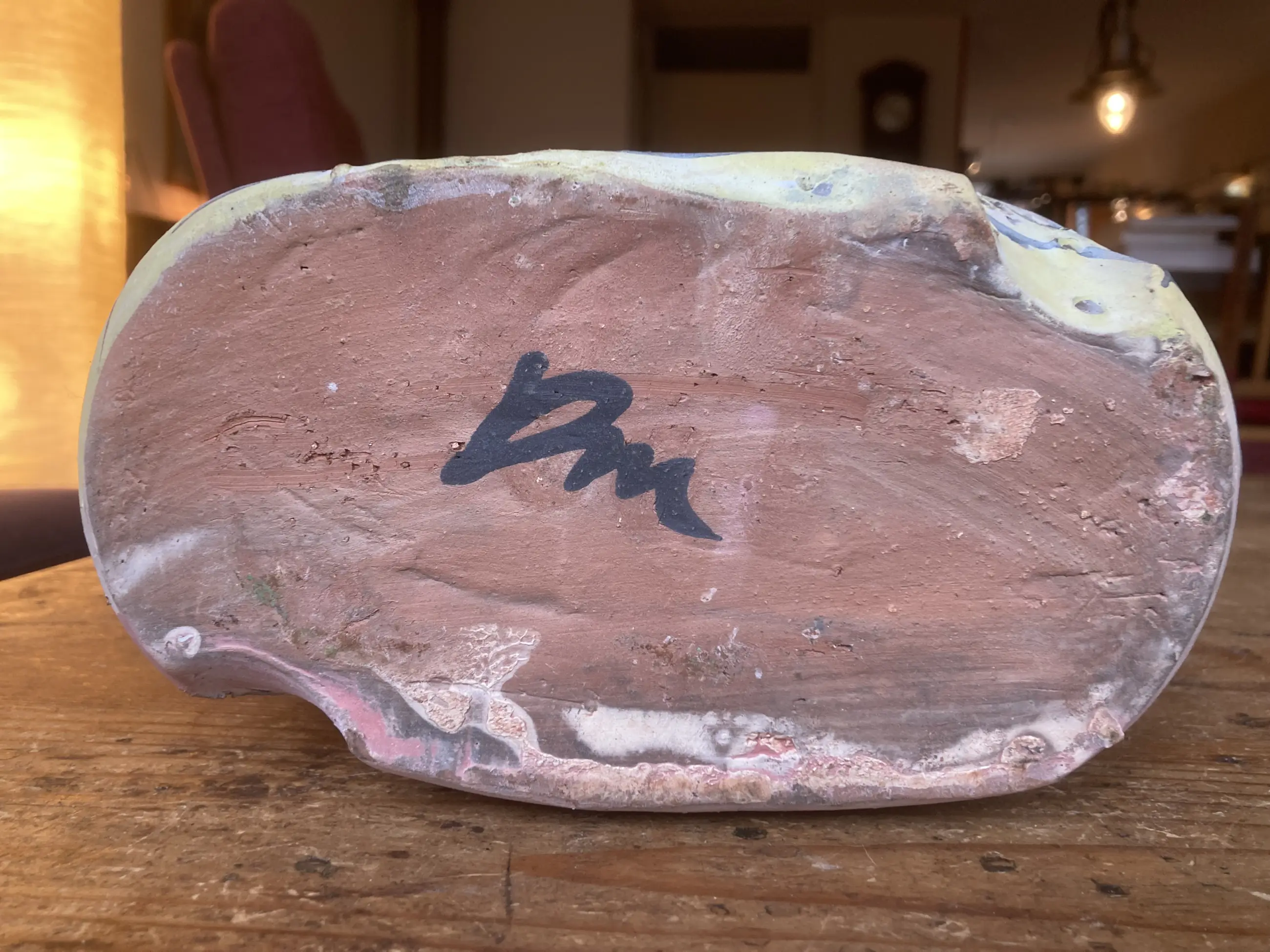 Dit typische kenmerkende David Miller-stuk komt uit de erfenis van mijn moeder. Mijn moeder was de zus van een Nederlandse ceramist uit Saint Quentin la Poterie. Hij was bevriend met David Miller die in het zuid Franse Nimes woonde. Hun vriendschap werd gekleurd door wederzijds respect voor hun artistieke prestaties en ook door hun beider gevoel voor humor. Dit stuk heeft geen beschadigingen of reparaties.