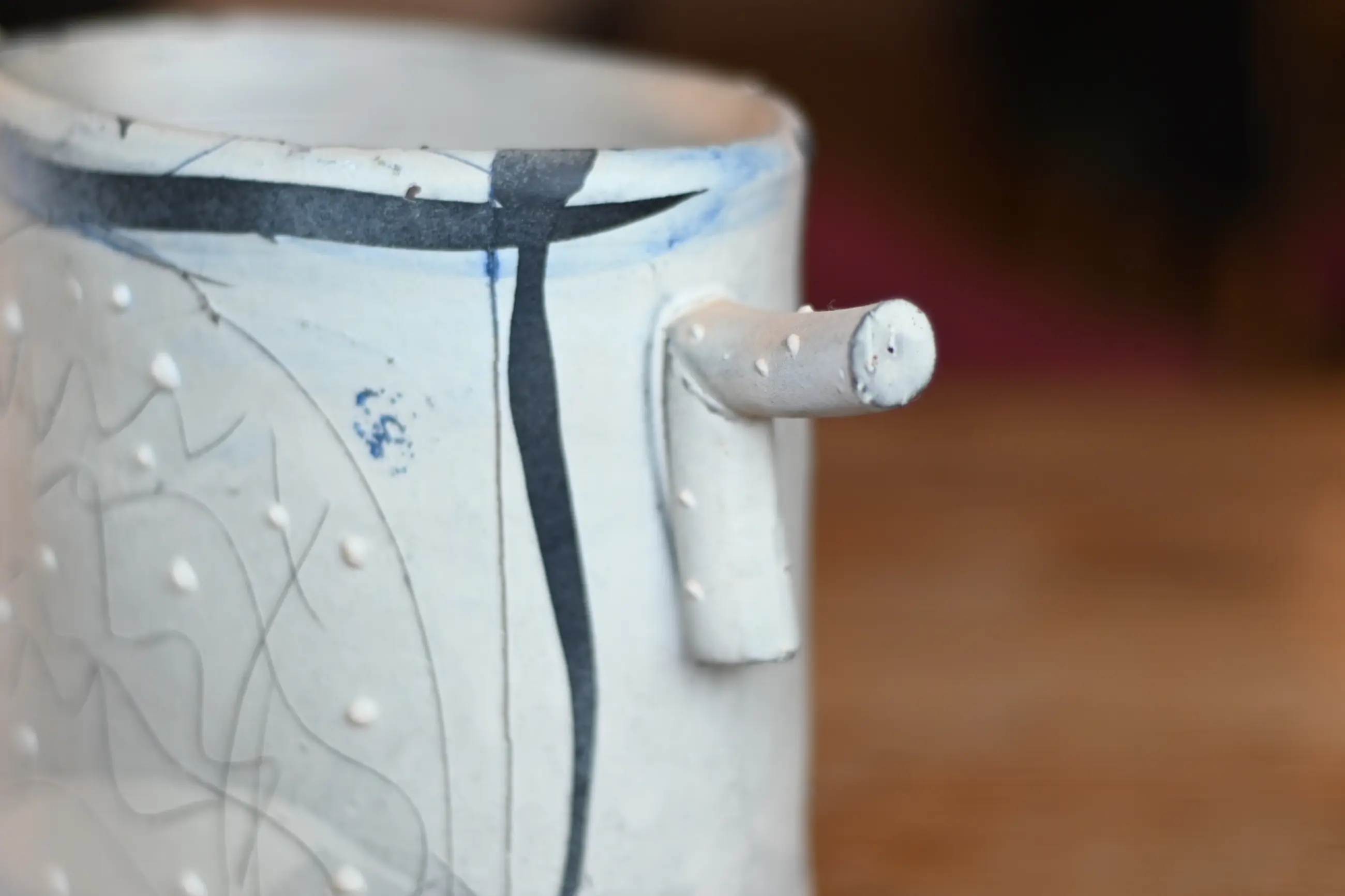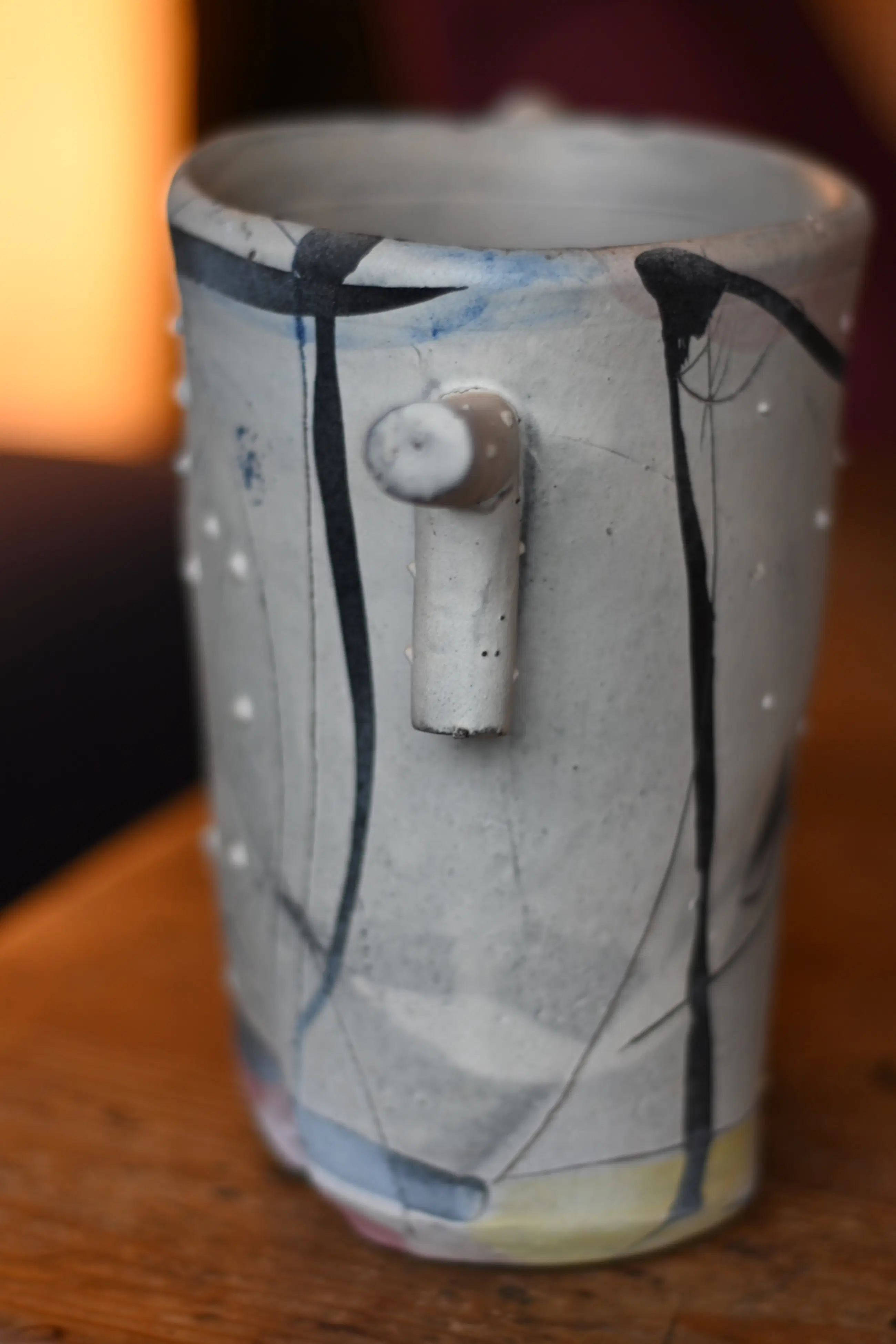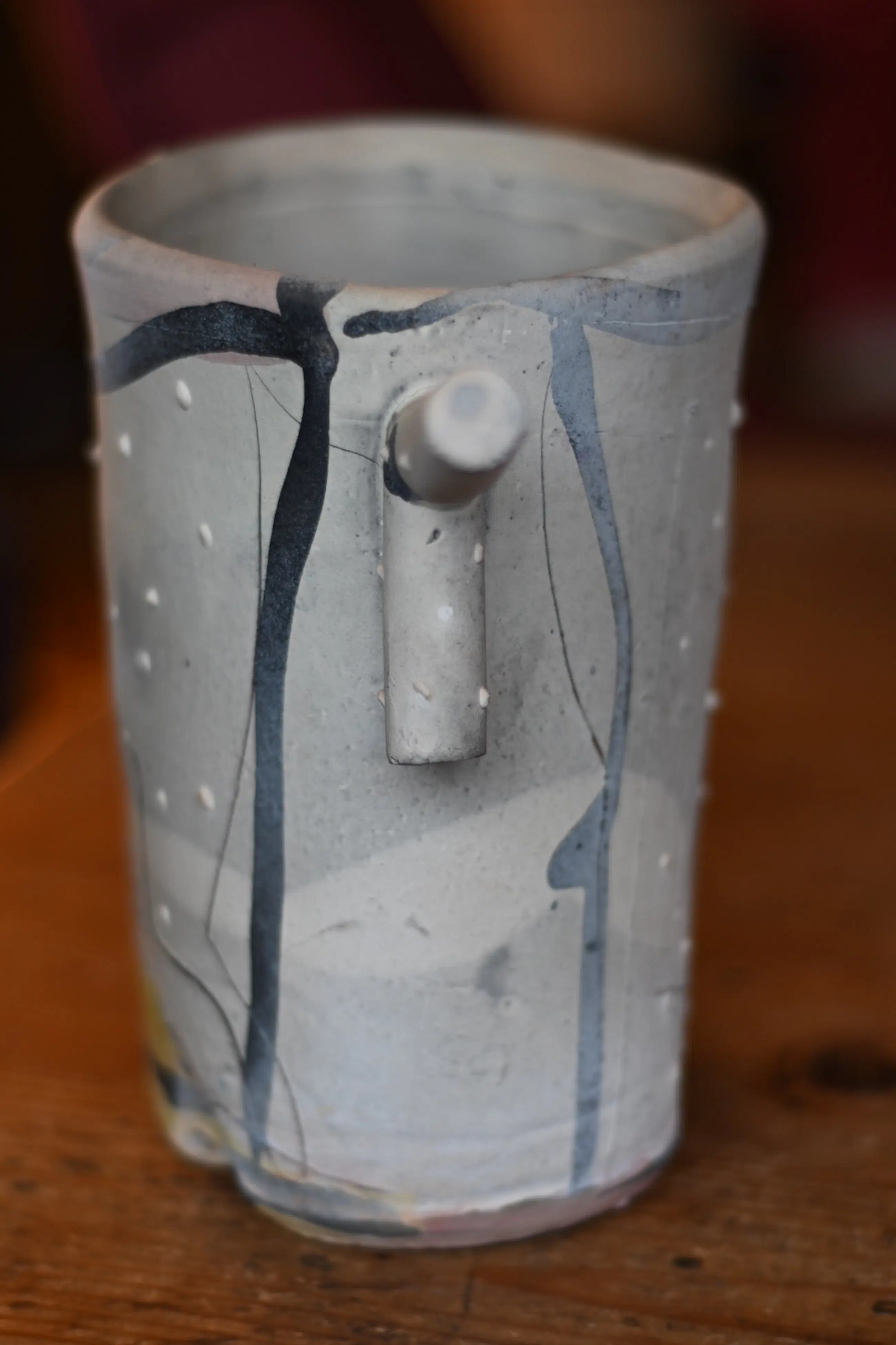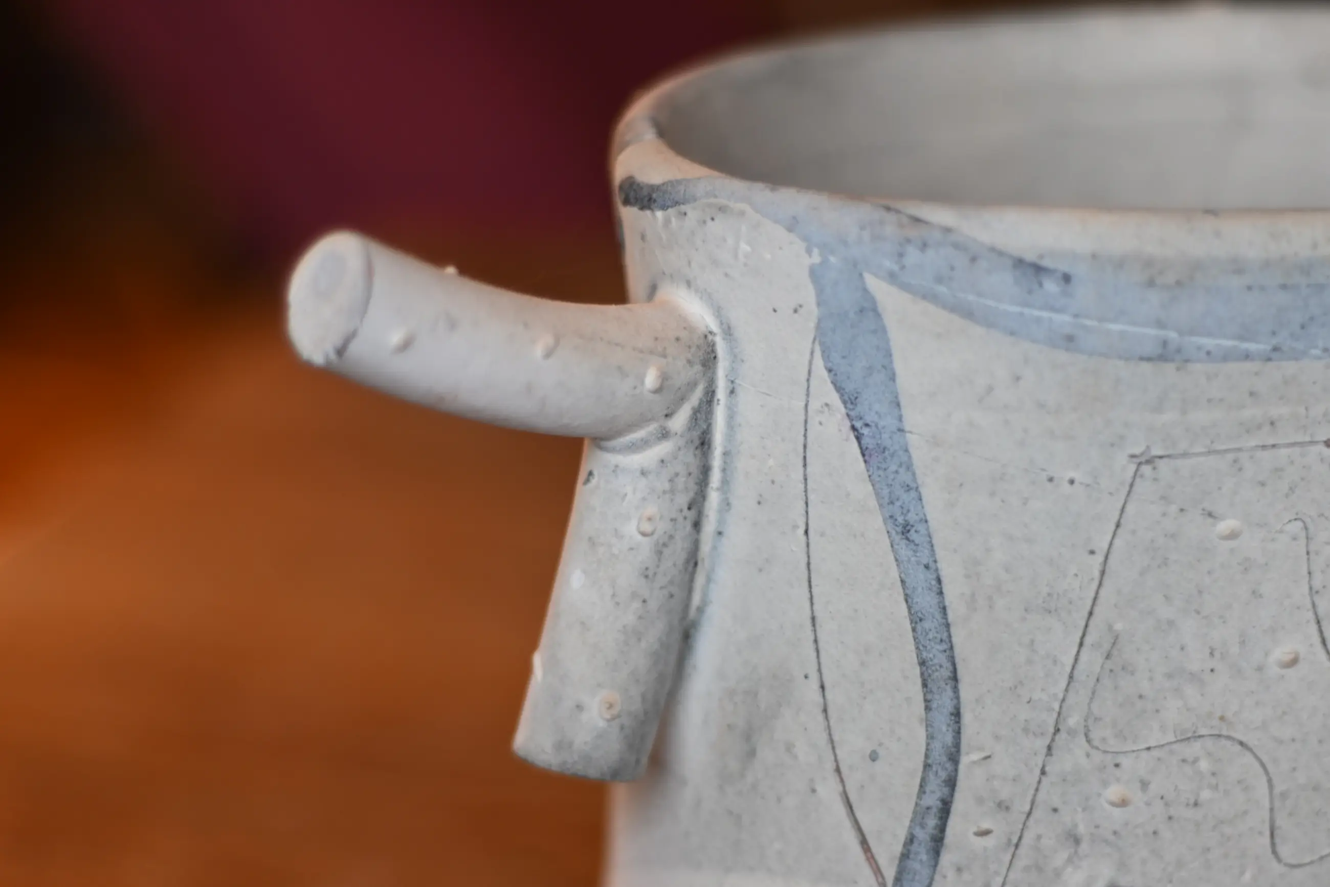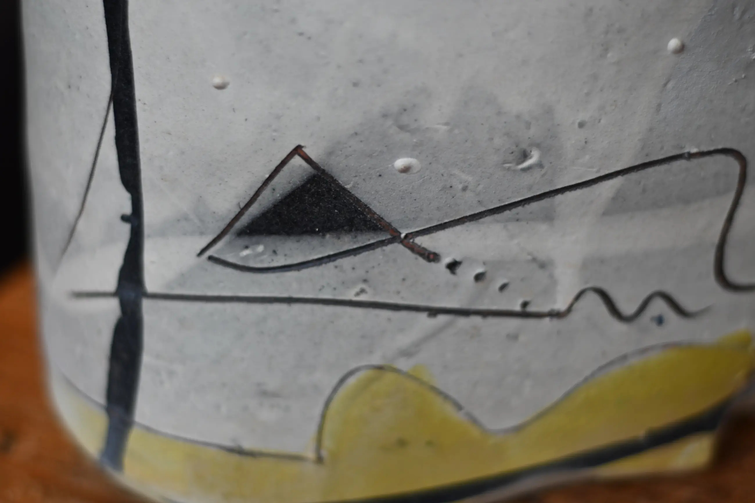 Dit typische kenmerkende David Miller-stuk komt uit de erfenis van mijn moeder. Mijn moeder was de zus van een Nederlandse ceramist uit Saint Quentin la Poterie. Hij was bevriend met David Miller die in het zuid Franse Nimes woonde. Hun vriendschap werd gekleurd door wederzijds respect voor hun artistieke prestaties en ook door hun beider gevoel voor humor. Dit stuk heeft geen beschadigingen of reparaties.