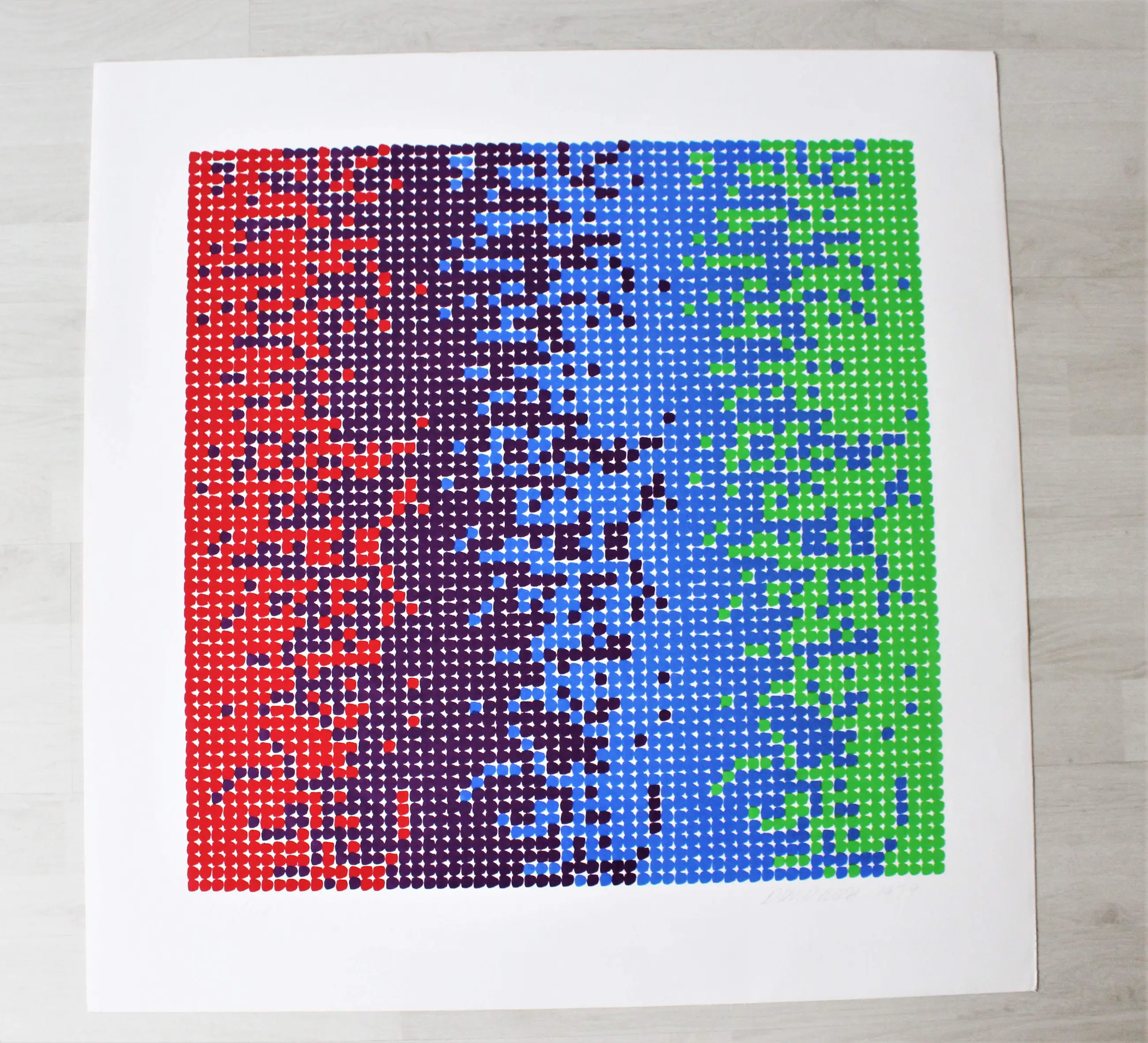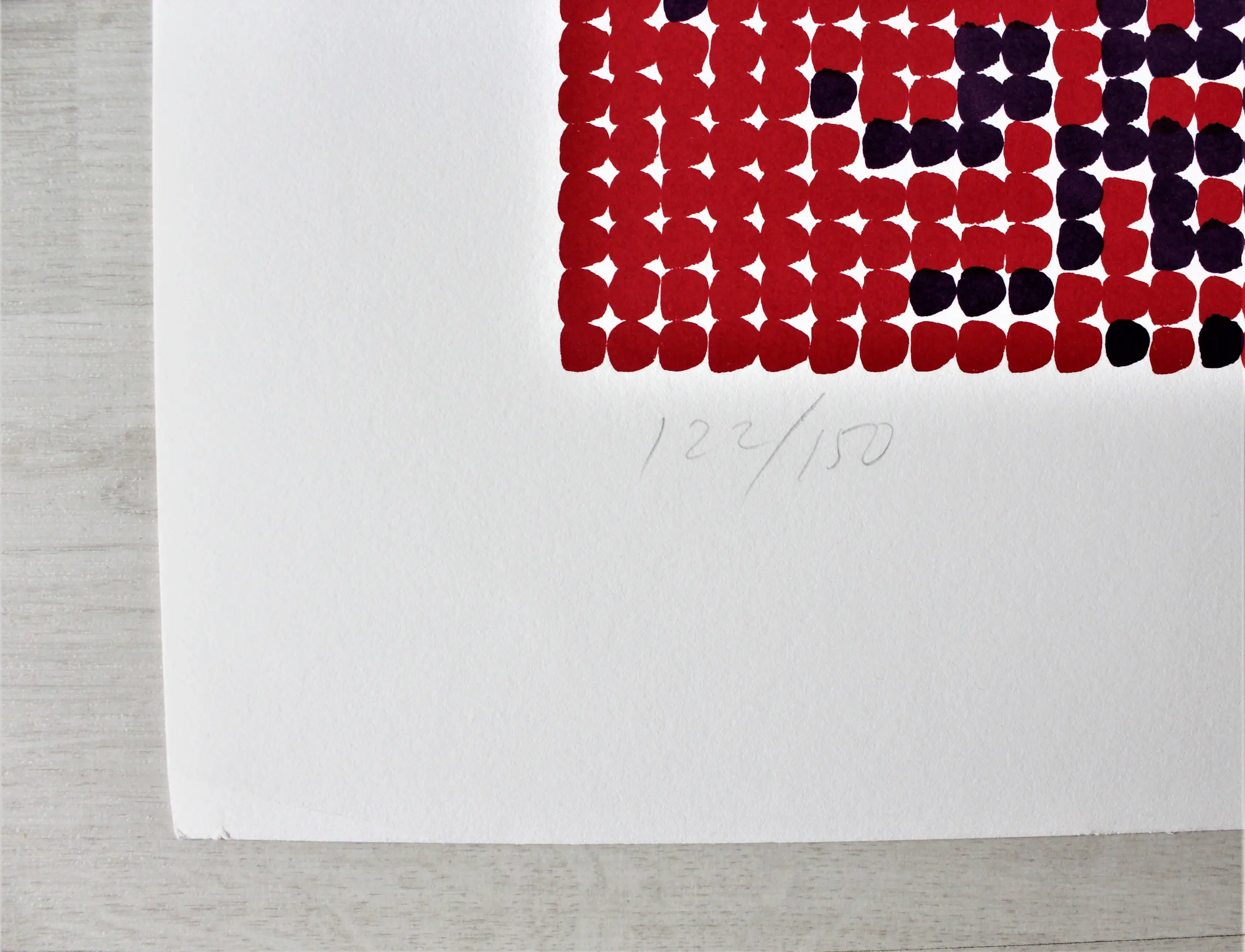 Kleurenlitho van David Roth (*1942). Abstracte compositie uit 1980. Techniek: kleurenzeefdruk op vergépapier. Gelimiteerde oplage van 150. Origineel gesigneerd en genummerd door de kunstenaar.
