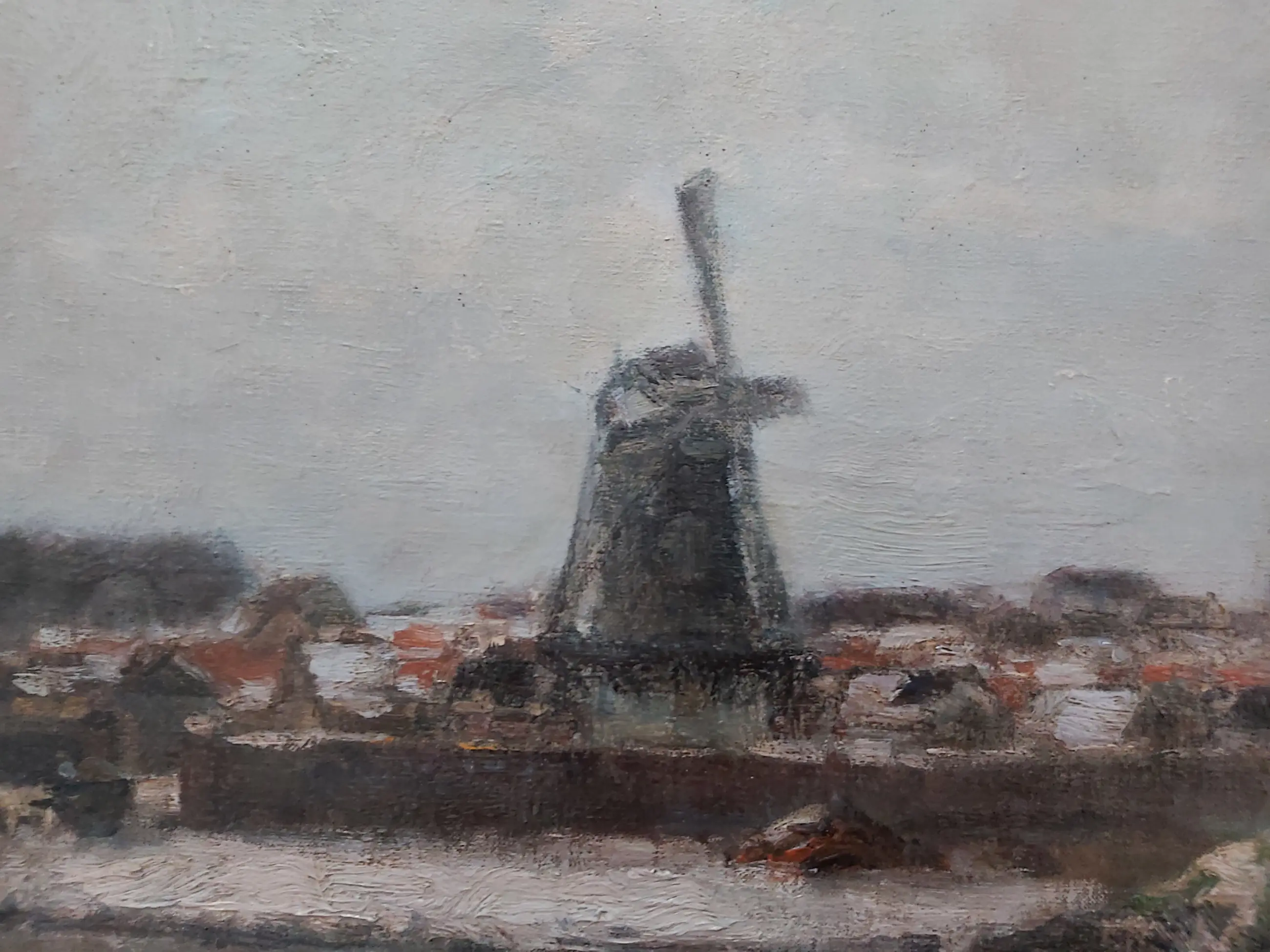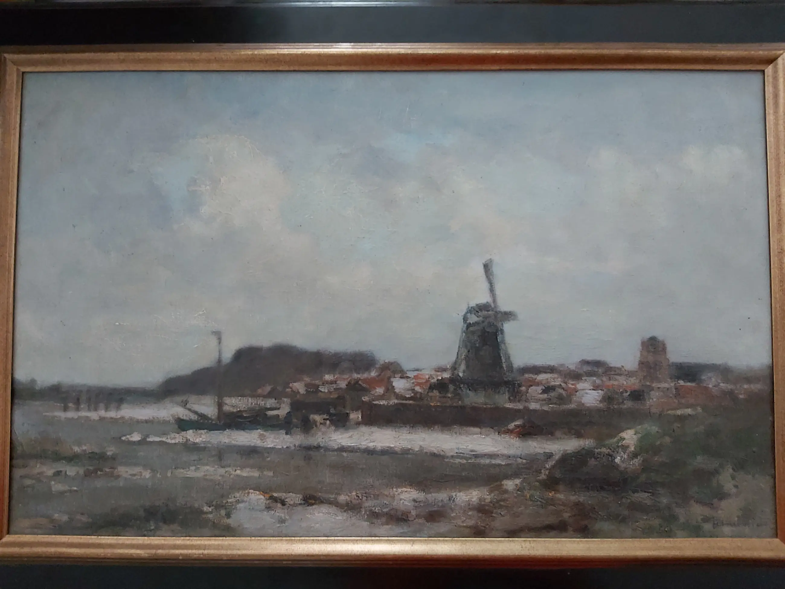 David Schulman - Hollands wintergezicht met boot, dorp en windmolen.