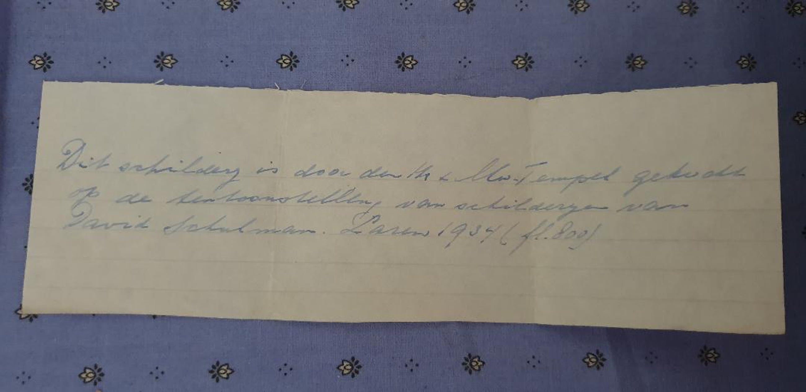 In 1934 is het werk op een tentoonstelling van de schilder voor hfl 800 aangekocht door de heer en mevrouw F.J. Tempel - Zwartenberg. De heer Tempel was tot 1966 voorzitter van de raad van bestuur van de Brits-Nederlandse multinational Unilever. Het paar was in 1952 voor het werk verhuisd naar Londen. Beiden waren grote kunstliefhebbers maar vooral mevrouw Tempel was het die een grote collectie schilderijen aanlegde voor hun grote stadsvilla. Die collectie werd zo omvangrijk, dat een groot deel ervan in depot moest blijven.