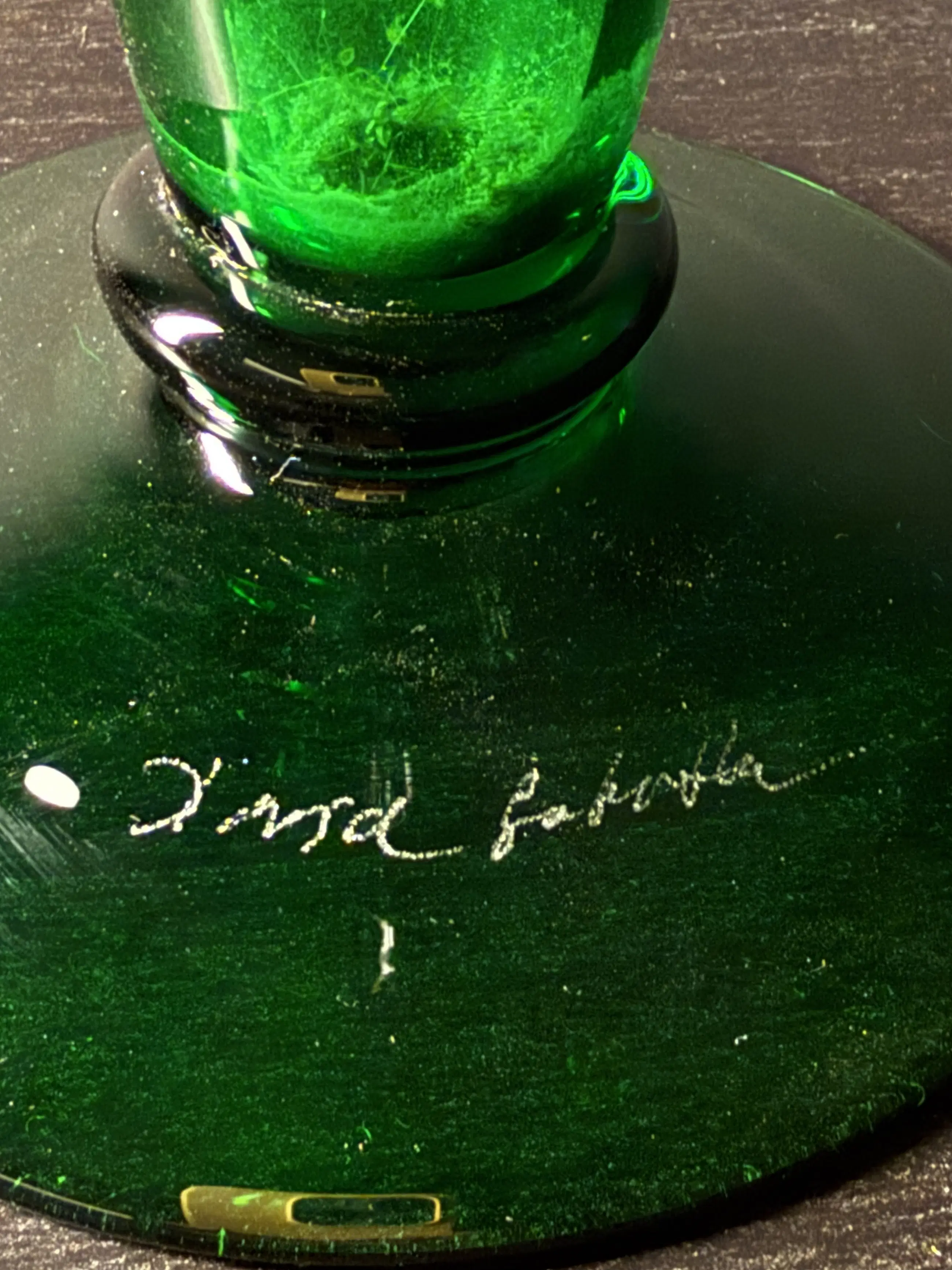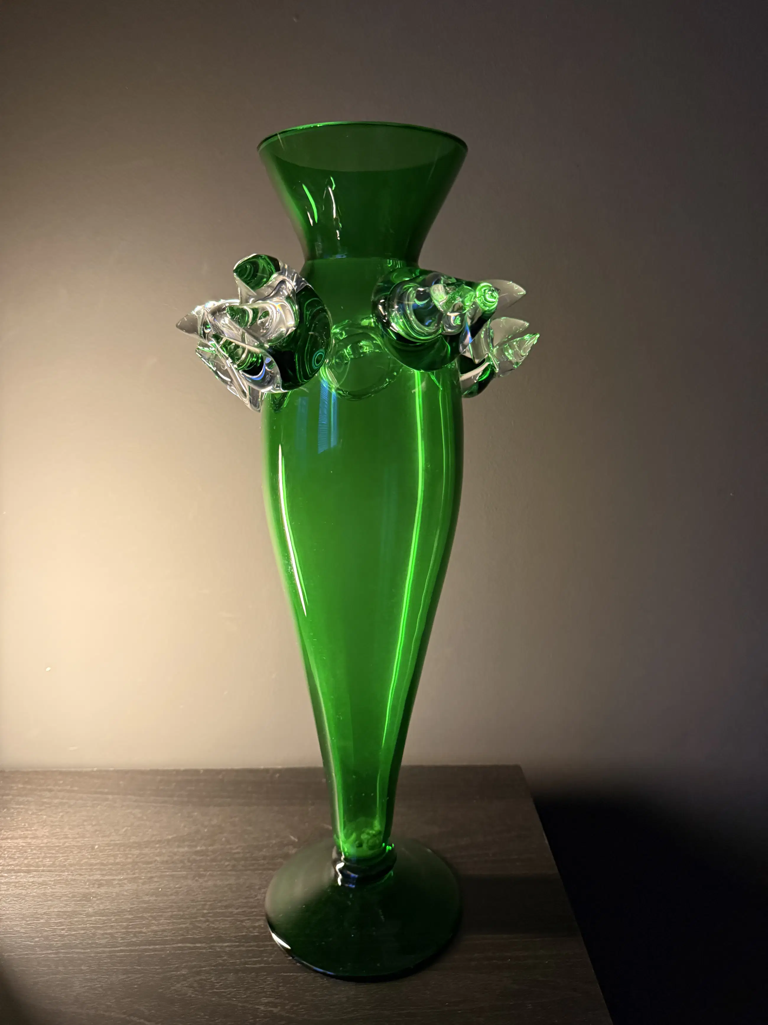 Elegante, slanke design vaas van David Sobotka, uitgevoerd in diep groen glas met rondom de schouder opvallende, aangezette glaselementen in transparant en groen. De decoratieve “krullen/rozetten” geven de vaas een sculpturale uitstraling en zorgen voor prachtig lichtspel en diepte.