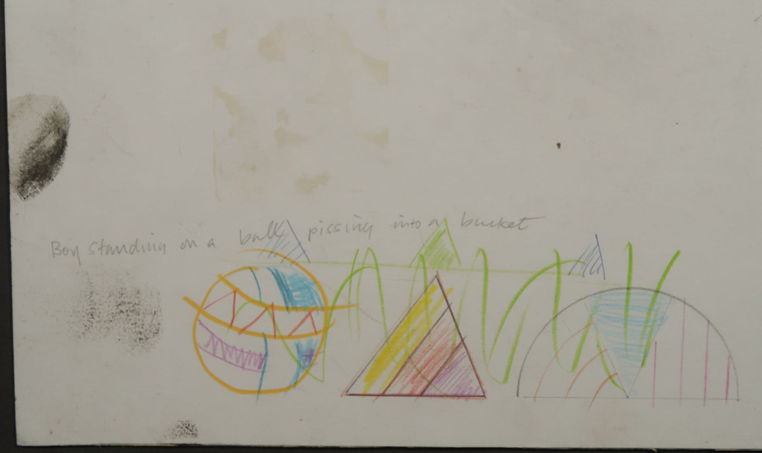Titel: Boy standing on a ball pissing in a bucket