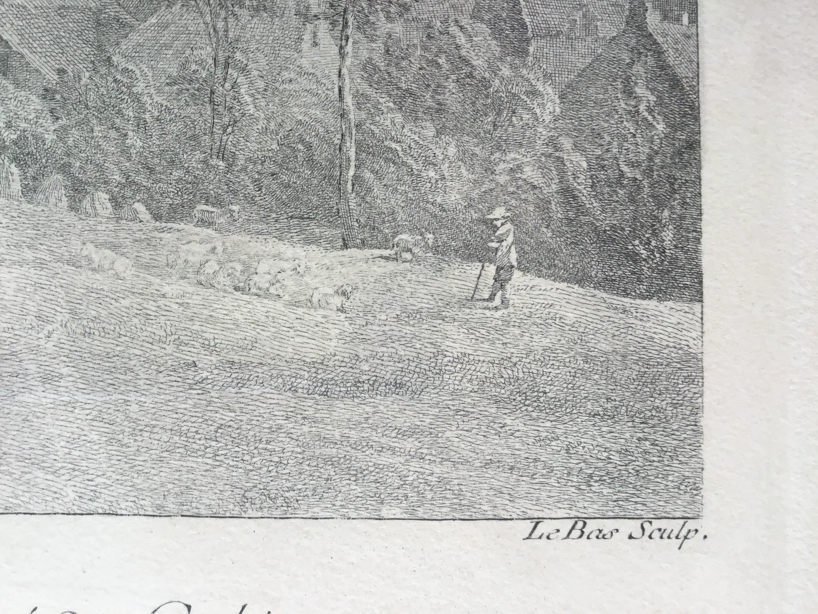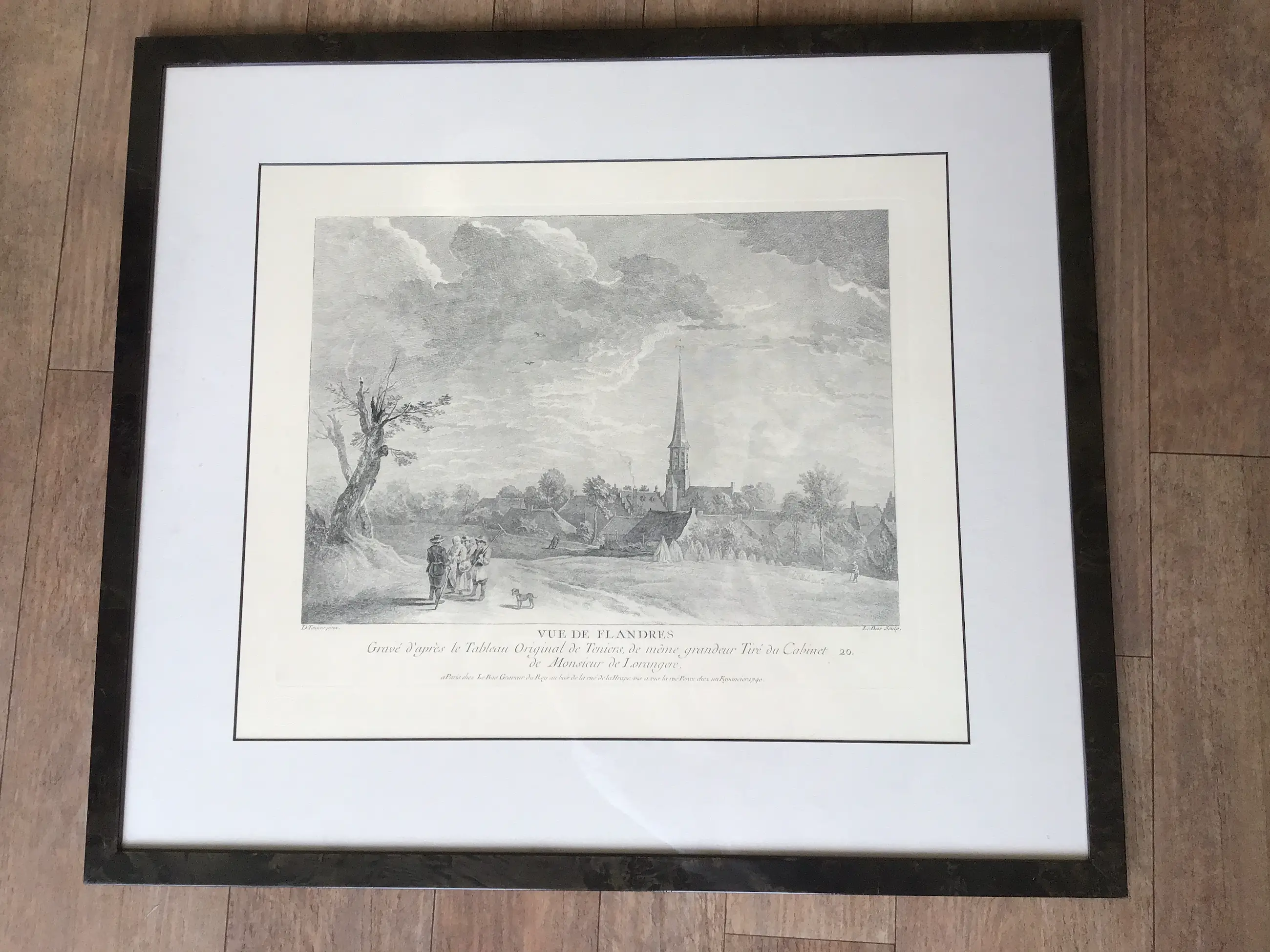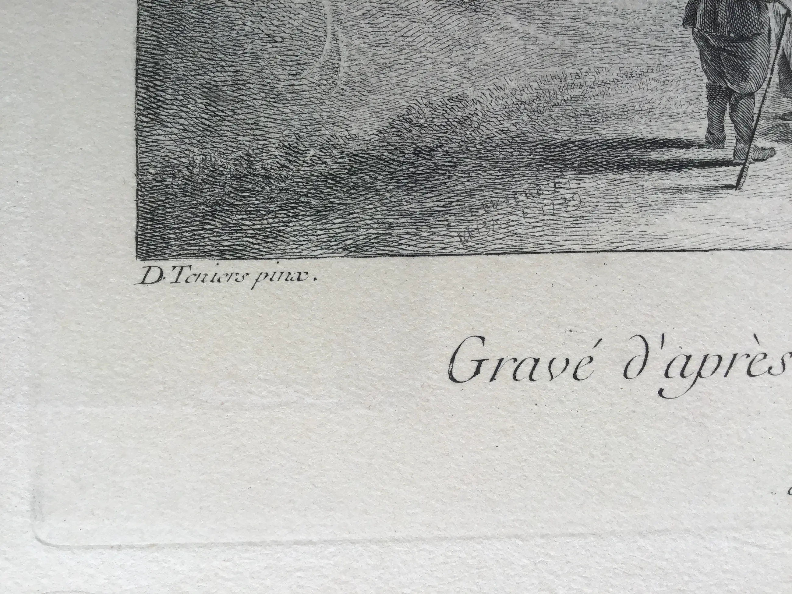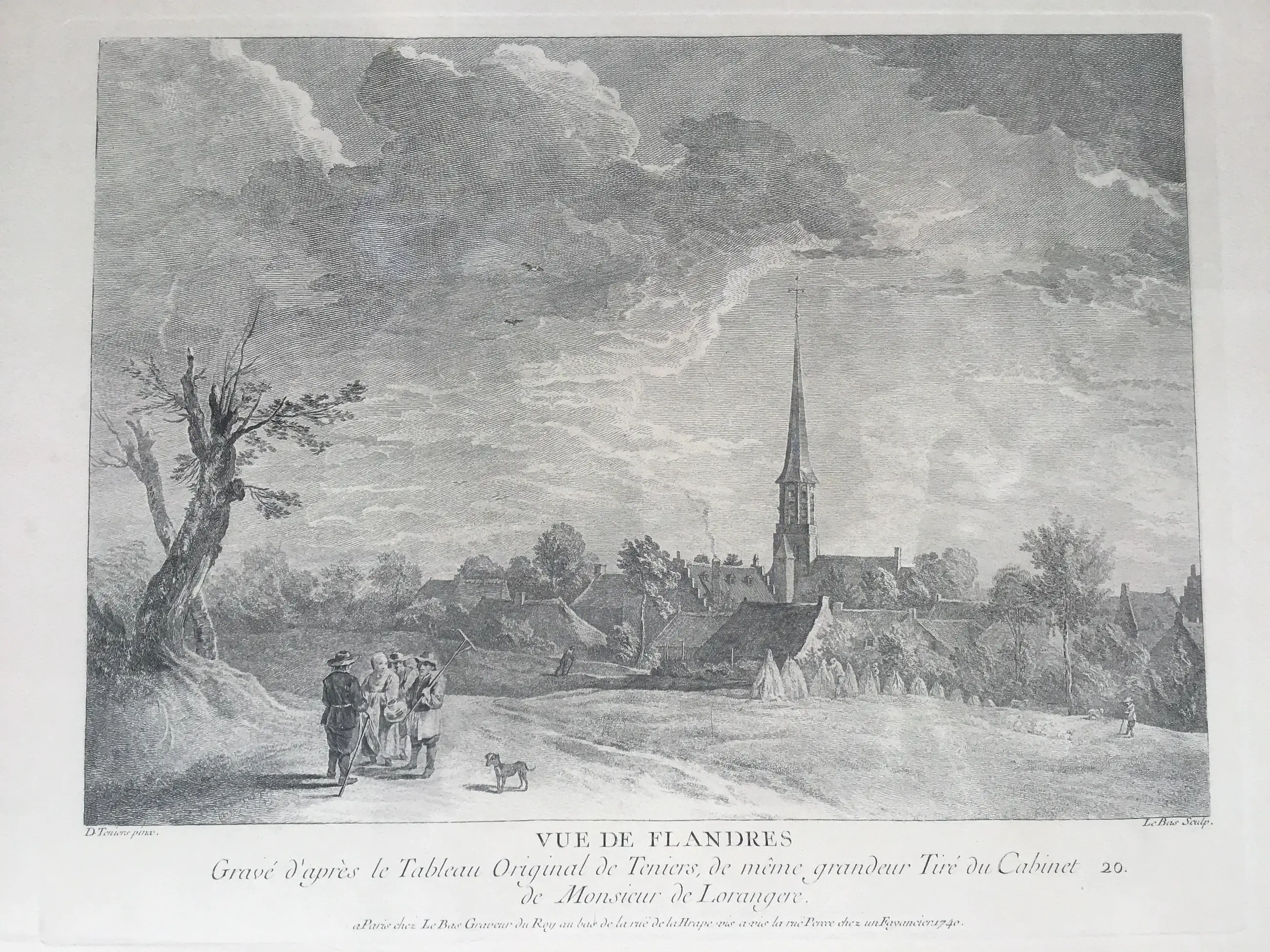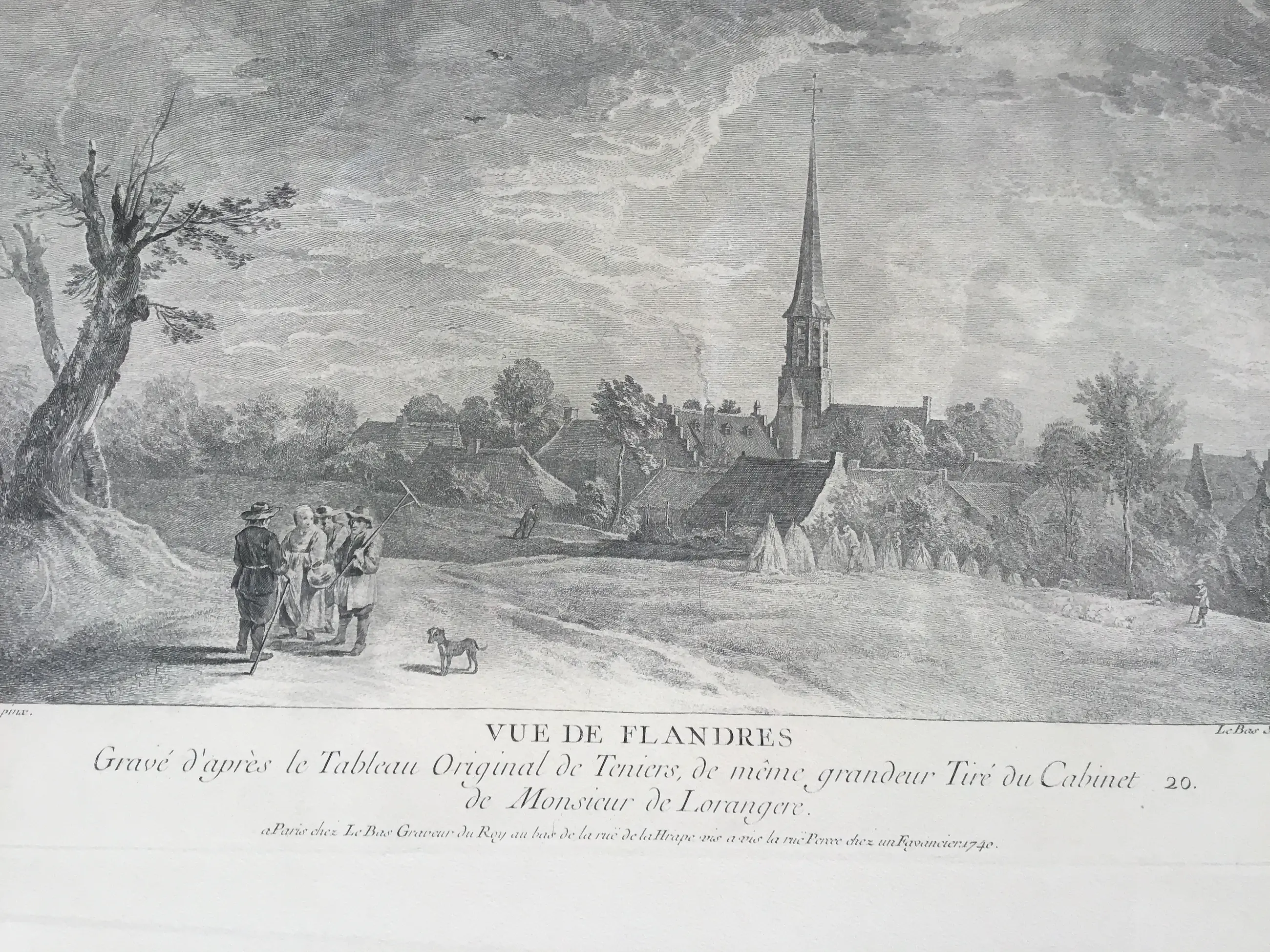 Gravé d’après le Tableau Original de Teniers, de même grandeur Tiré du Cabinet 20. de Monsieur de Lorangere. A Paris chez Le Bas Graveur du Roy au bas de la rue de la Hrape vis à vis la rue Percée chez un Fayncier 1740.