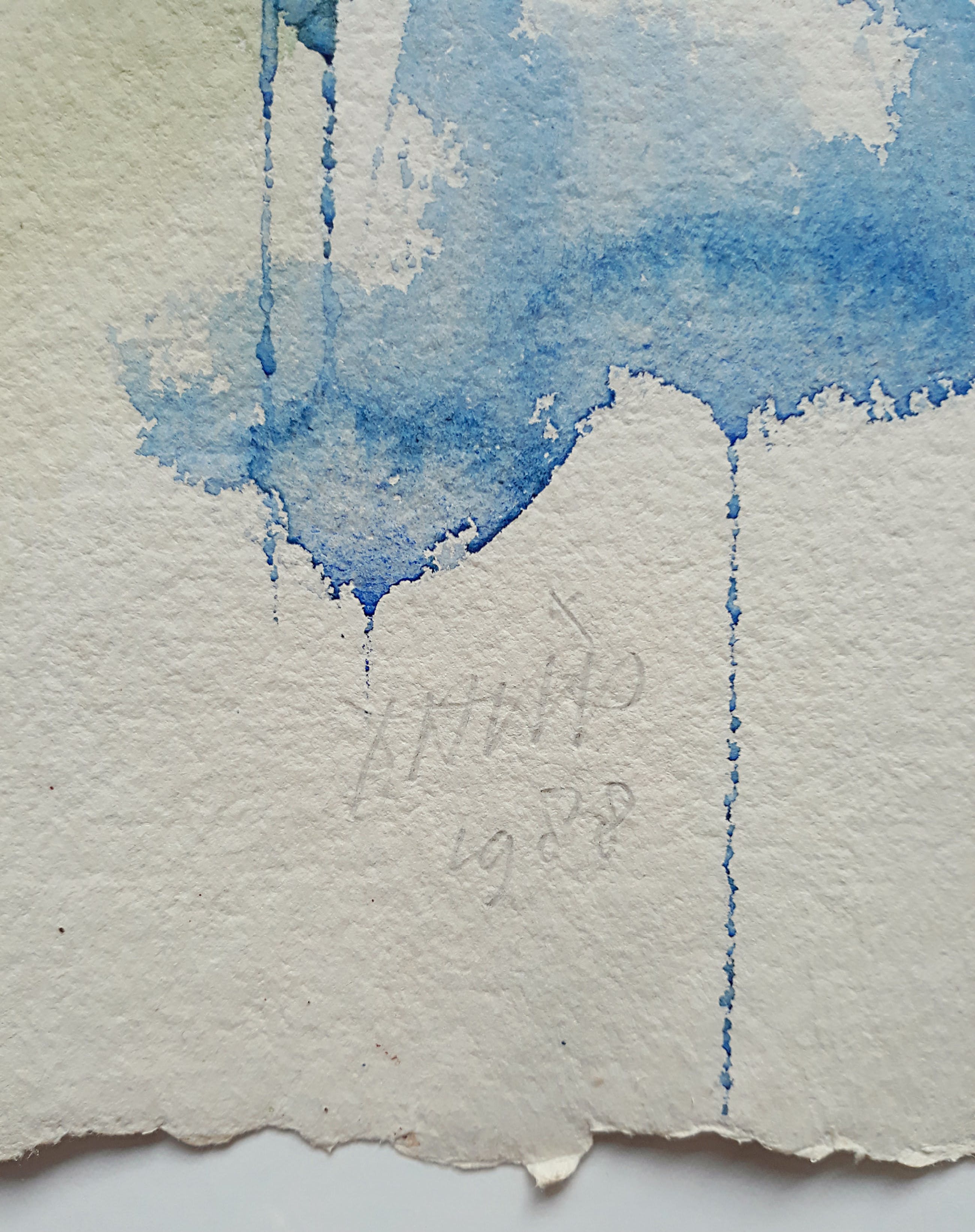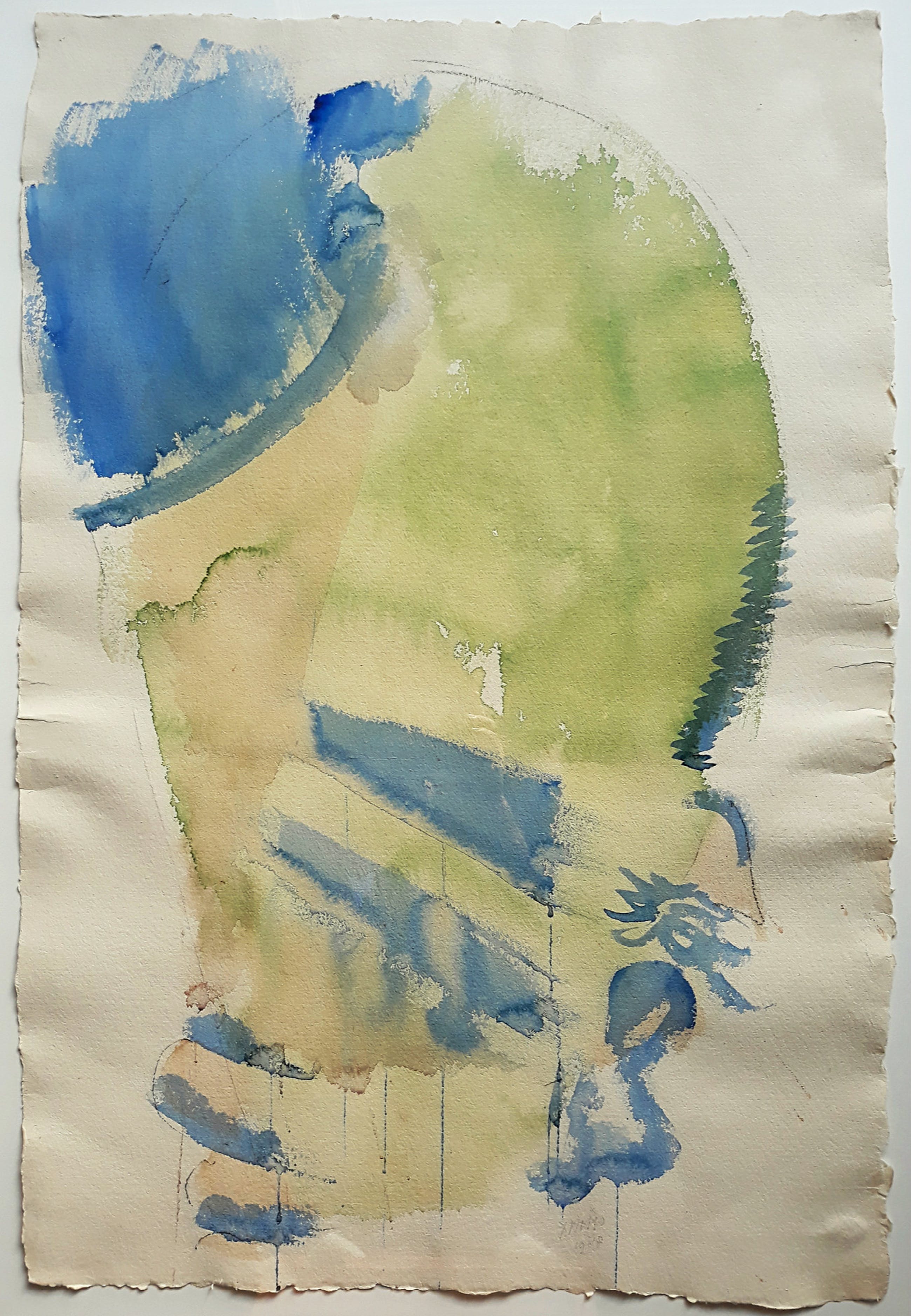 Groot abstract werk van David van de Kop uit 1988. Aquarel op grof geschept papier, met potlood gesigneerd en gedateerd. Het volledige blad in eenvoudige maar zeer stevige houten lijst, achter glas. In zeer goede conditie, de lijst moet onderaan alleen even vastgezet worden.