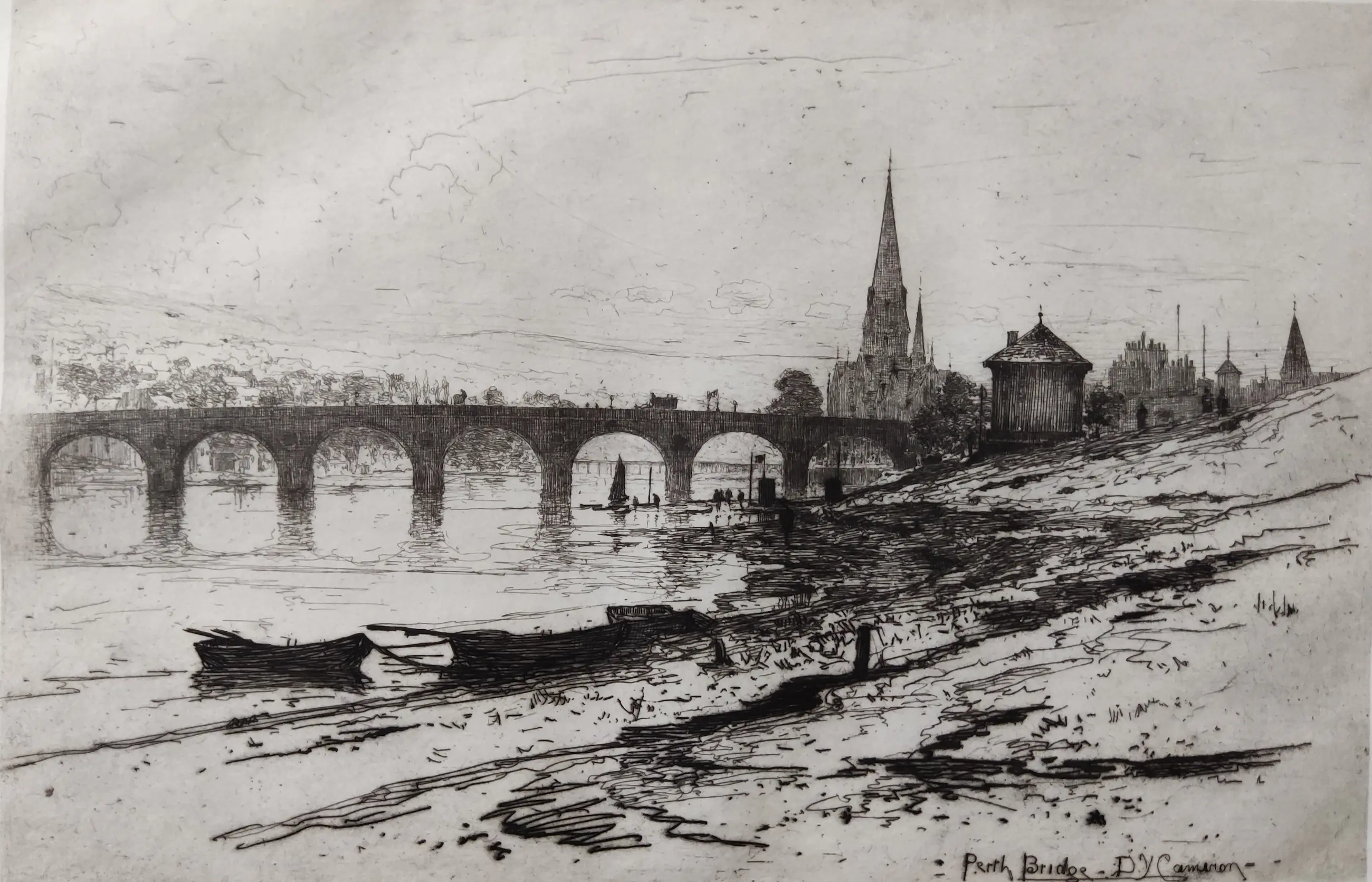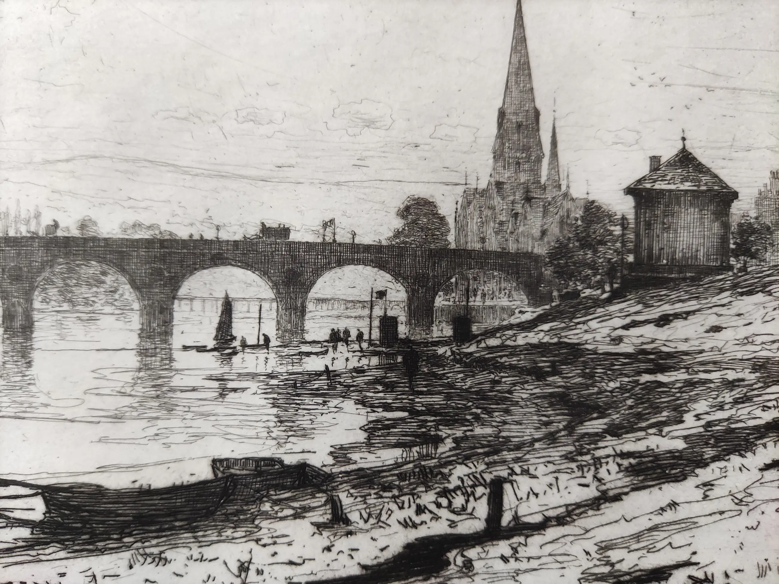 Fraaie ets van deze Schotse kunstenaar. Gesigneerd en getiteld in de plaat rechtsonder. Beeldmaat 16x25 cm. Bladmaat 28,5x38 cm. Losbladig. Sir David Young Cameron werd geboren te Glasgow op 28 juni 1865 en overleed te Perth op 16 september 1945. Etser en schilder. Werkte in de jaren 1892 en 1915 in Noord-Holland.