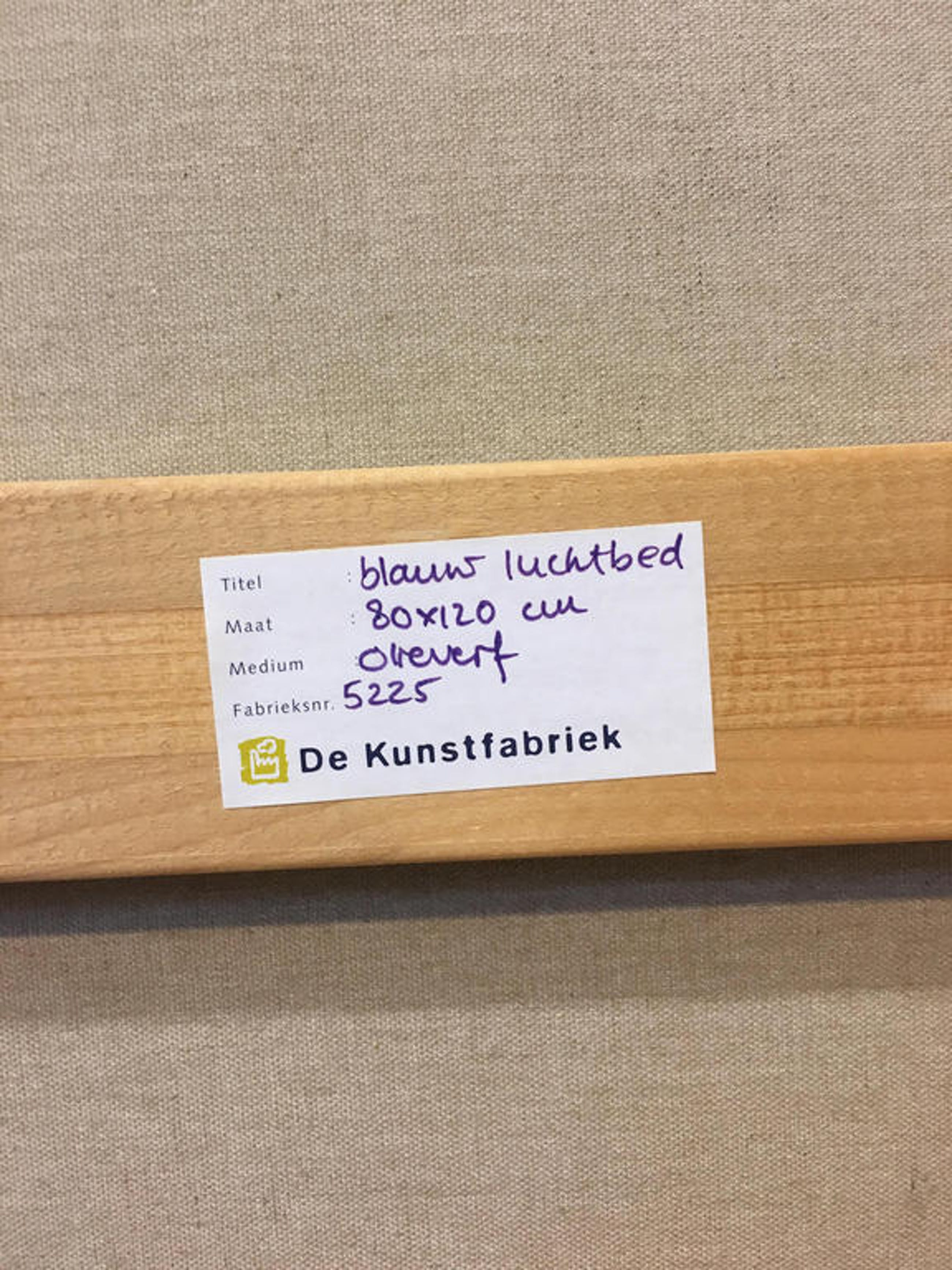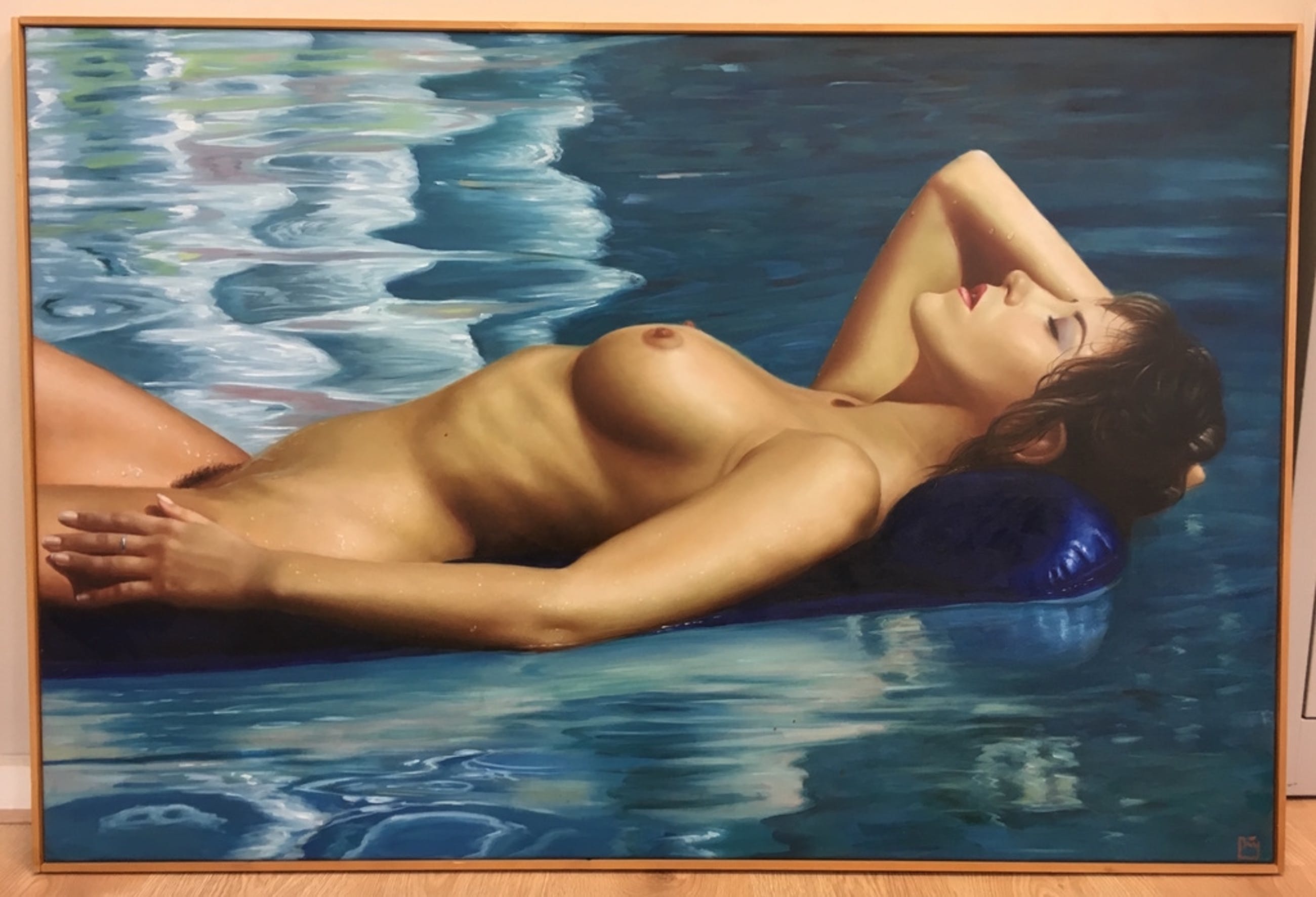 Schilderij van naakte schone op blauw luchtbed. Aangekocht begin 2000.